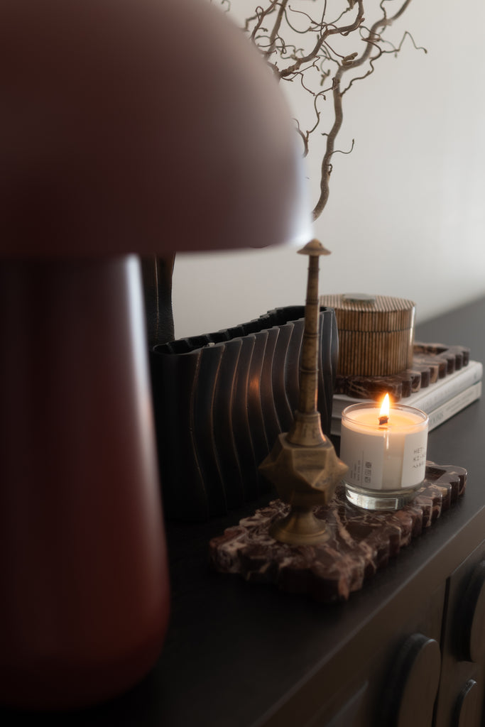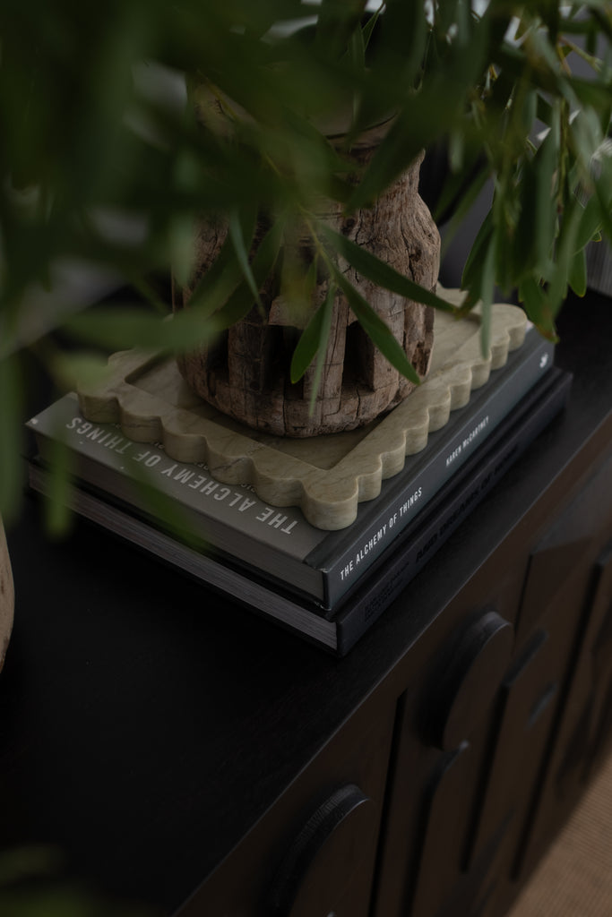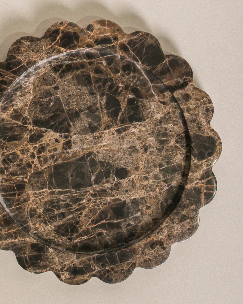 Arabesque’s rounded-edge square shape and rich natural stone make it an ideal base for layered styling. Use it to group candles, jewellery, or incense bowls for a thoughtful vignette. The scalloped edges add a sculptural touch that blends seamlessly into organic, coastal, or modern interiors.