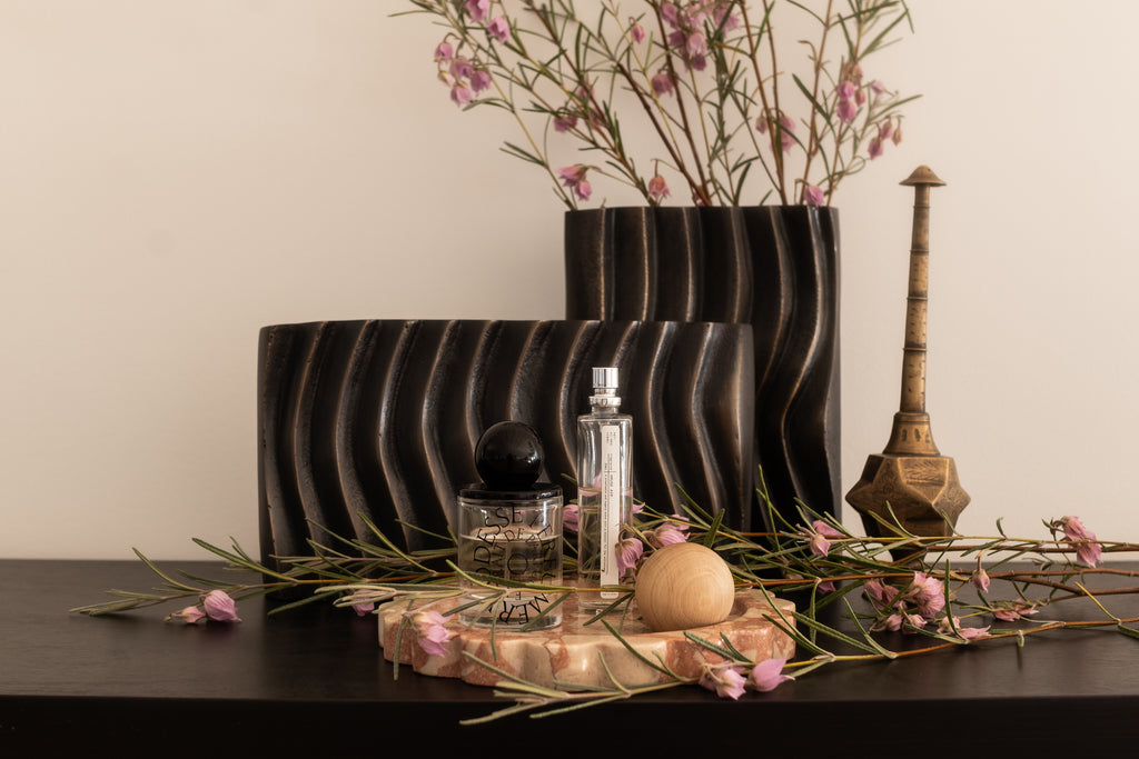 Available in two stone finishes—Pink Lagoon and Brown Emperador—it’s ideal for styling a console, dining table, or vanity. Use it to display collected items, candles, or jewellery and bring a gentle, grounded moment to everyday rituals.