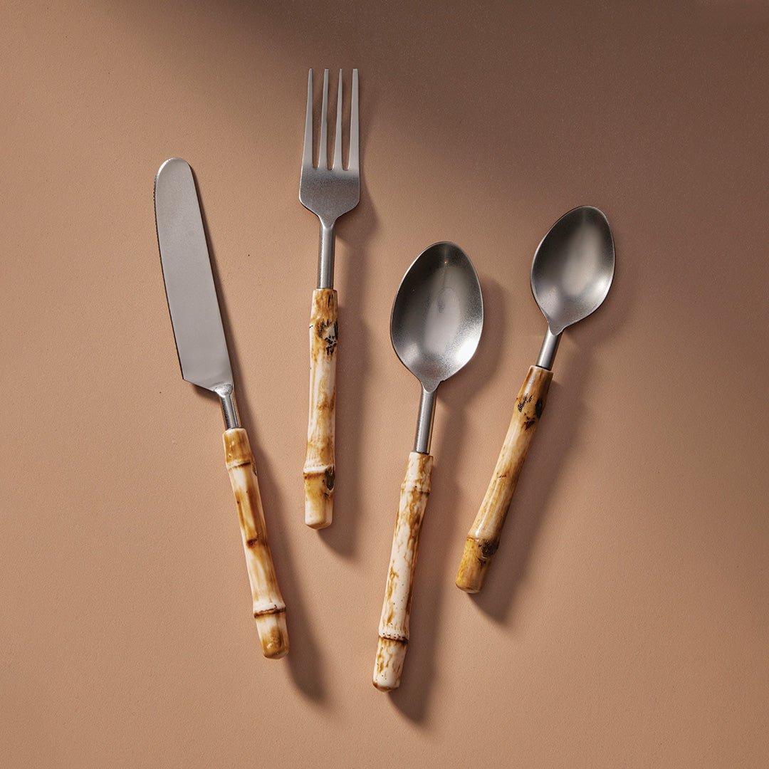 Add a touch of natural elegance to your table with the handcrafted Tropics Bamboo Cutlery Set. This 4 piece set features a knife, fork, dessert spoon and teaspoon. Made from high-quality resin, each piece is carefully designed to resemble the beautiful texture and appearance of bamboo, offering a stylish alternative to traditional cutlery.