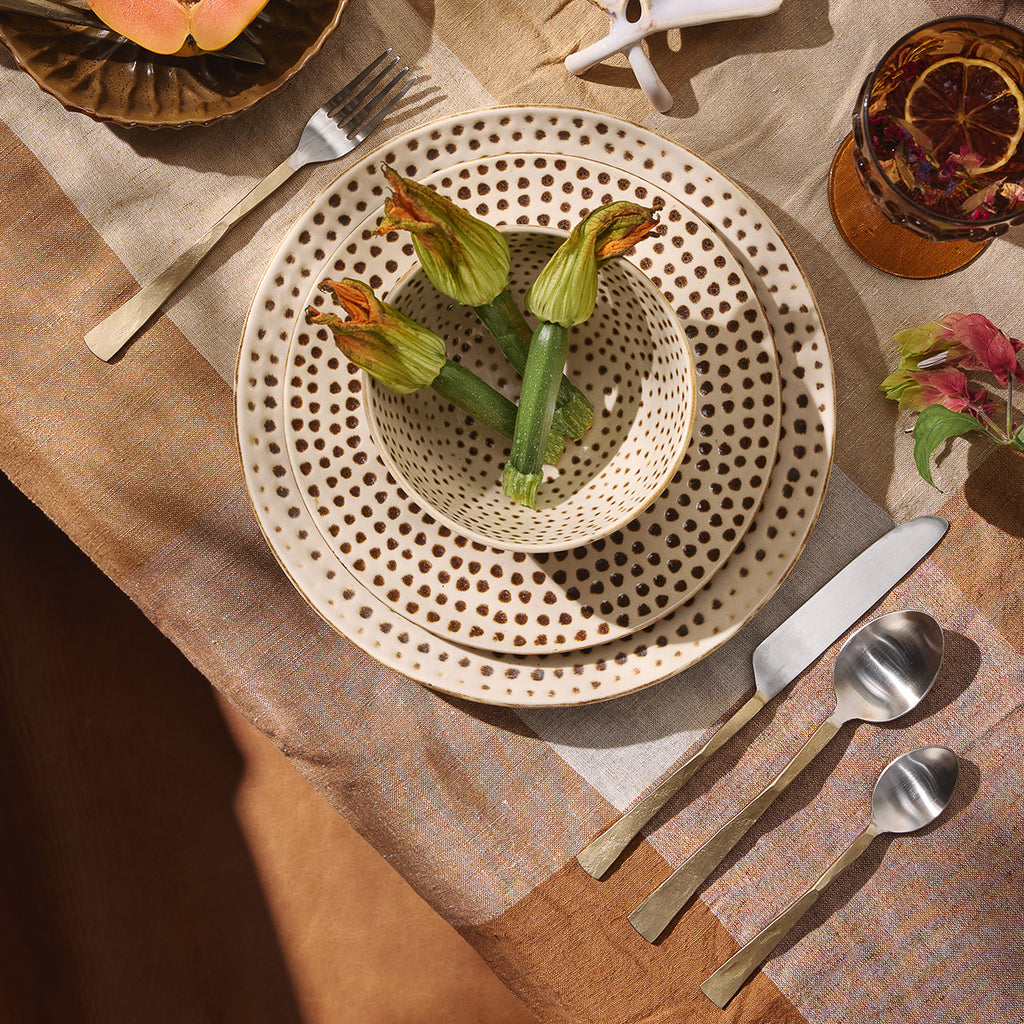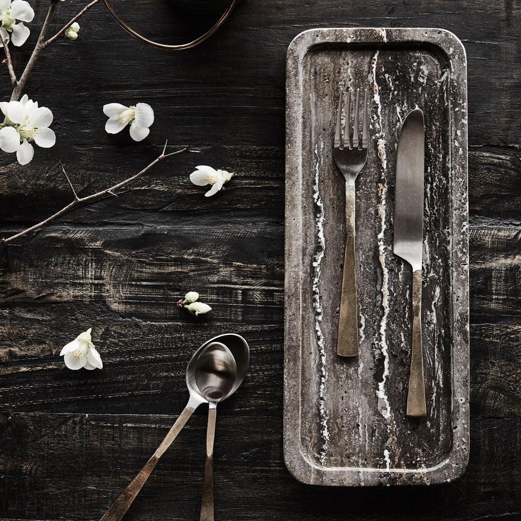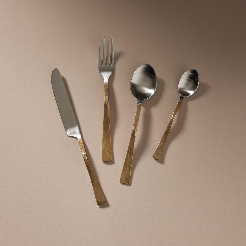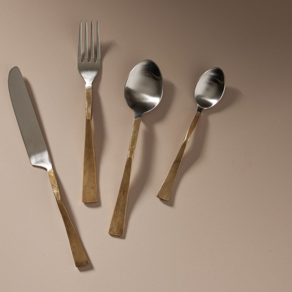 Experience the epitome of luxury and artistry with our Virtu Cutlery Set, a designer ensemble that adds elegance to your dining table. Meticulously crafted from high-quality stainless steel, this cutlery set showcases a striking contrast of colours with the handle plated in lustrous brass, combining silver and gold tones for a captivating visual effect. The juxtaposition of colours creates a refined and glamorous statement, making this cutlery set a stunning addition to both casual and formal dining occasions. The Virtu Cutlery Set includes a fork, knife, spoon, and dessert spoon, each designed with precision and attention to detail. The sleek stainless steel blades ensure effortless cutting and serving, while the brass-plated handles exude opulence and sophistication.