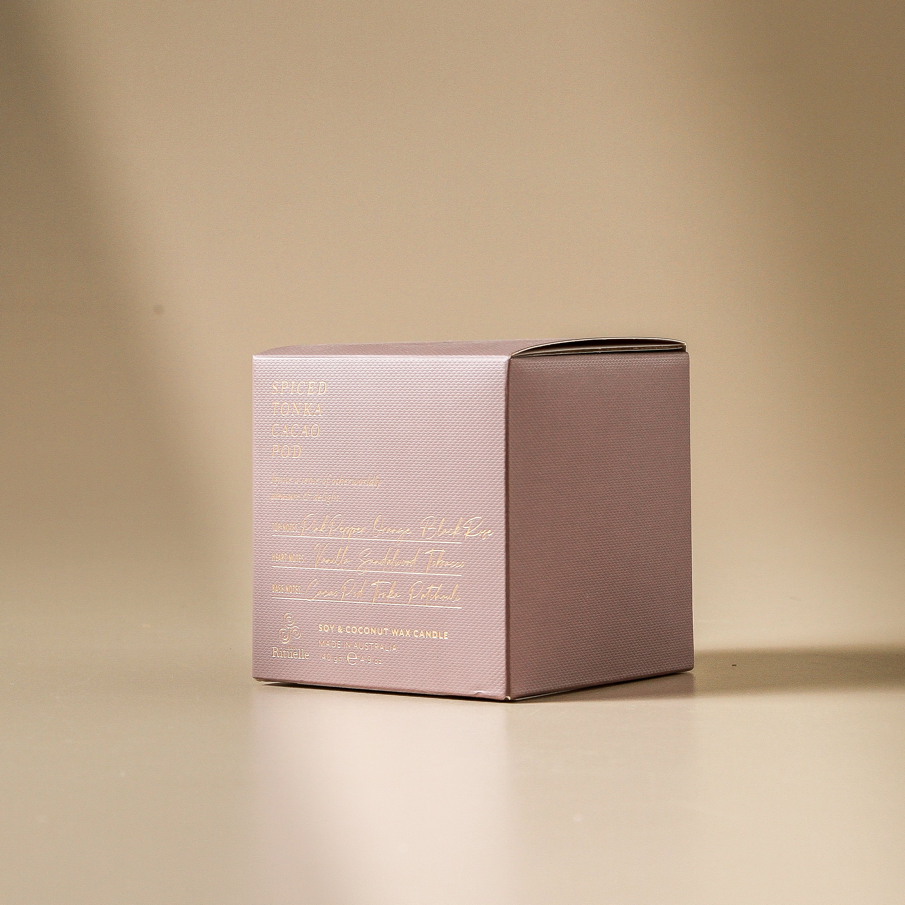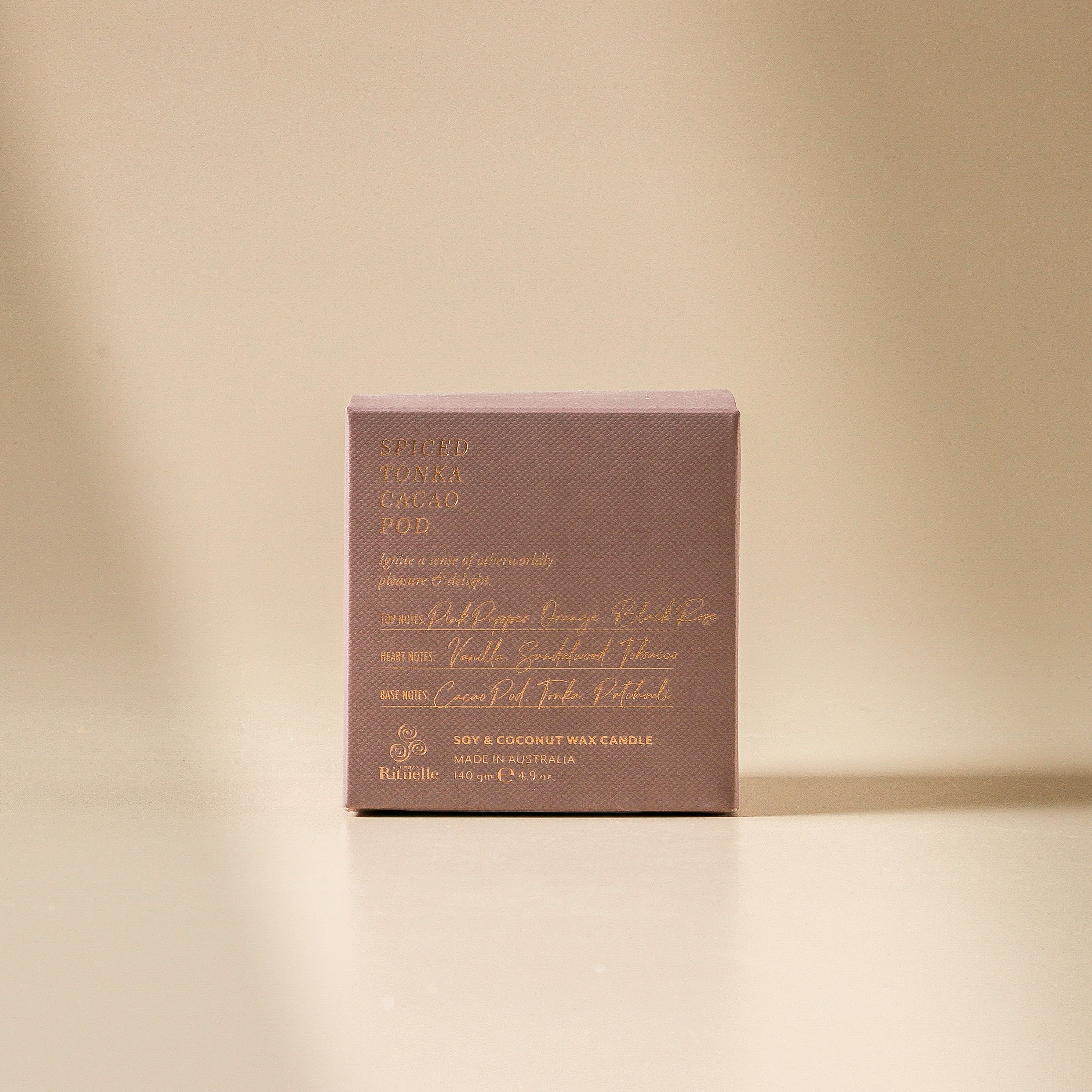 An opulent indulgence that ignites a sense of otherworldly pleasure. Top notes of pink pepper, orange, and black rose gracefully lead to a heart of rich sandalwood and vanilla. The fragrance deepens into velvety base notes of cacao pod, tonka bean, and patchouli for a sultry, lingering finish. Crafted in Australia from soy and coconut wax with a natural fibre wick, this candle provides around 28 hours of luxurious burn time.