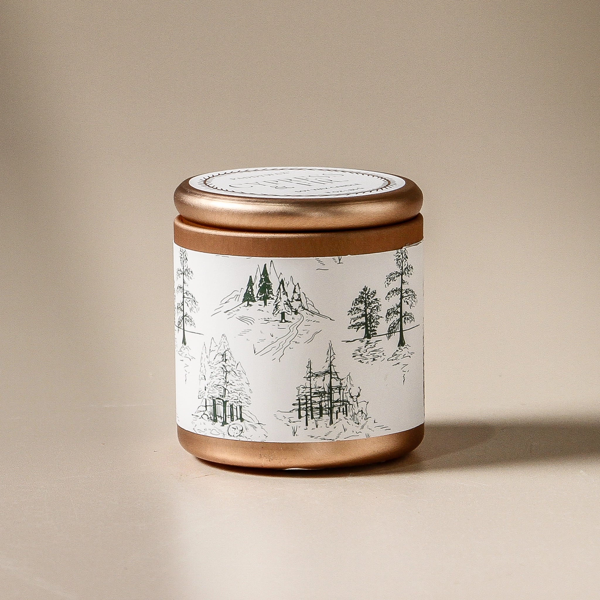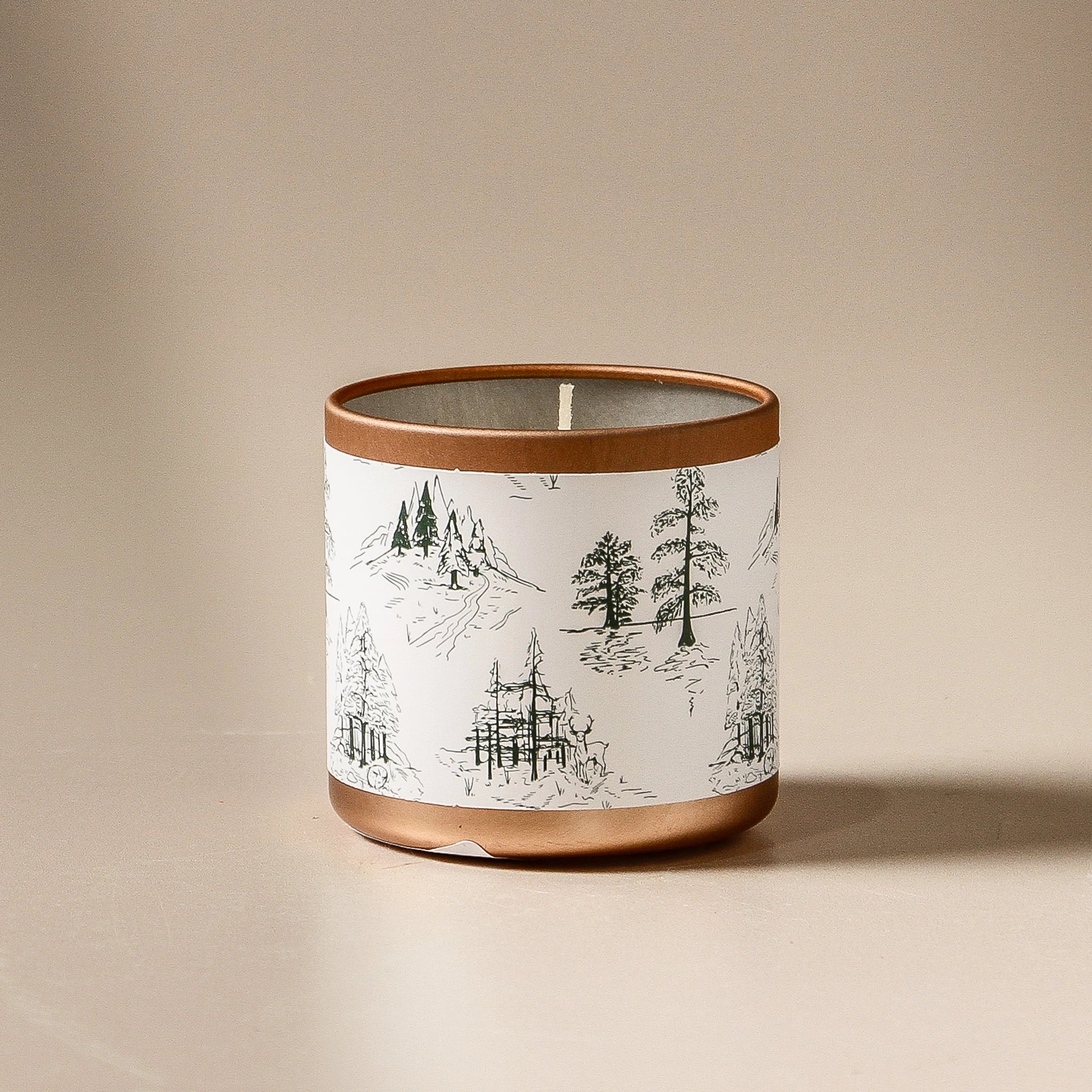 CYPRESS & FIR 3 OZ COPPER TIN + WHITE LABEL WITH GREEN TOILE PATTERN