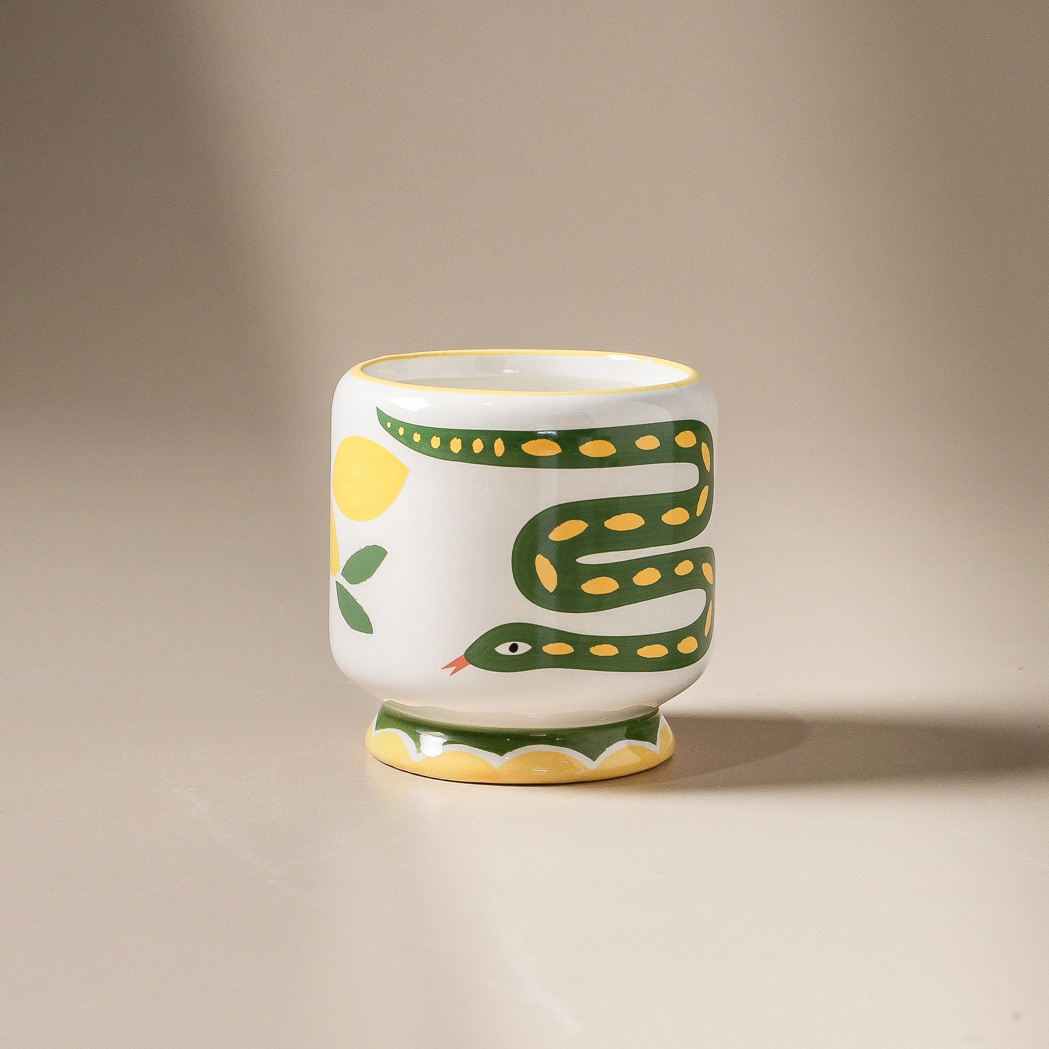 Ceramic vessel with hand painted and unique decals. Printed sliding box. Inspired by the colours and patterns of the Mediterranean and beyond. A Dopo features illustrated art and hand lettering by our designer, Andalyn!