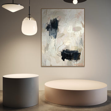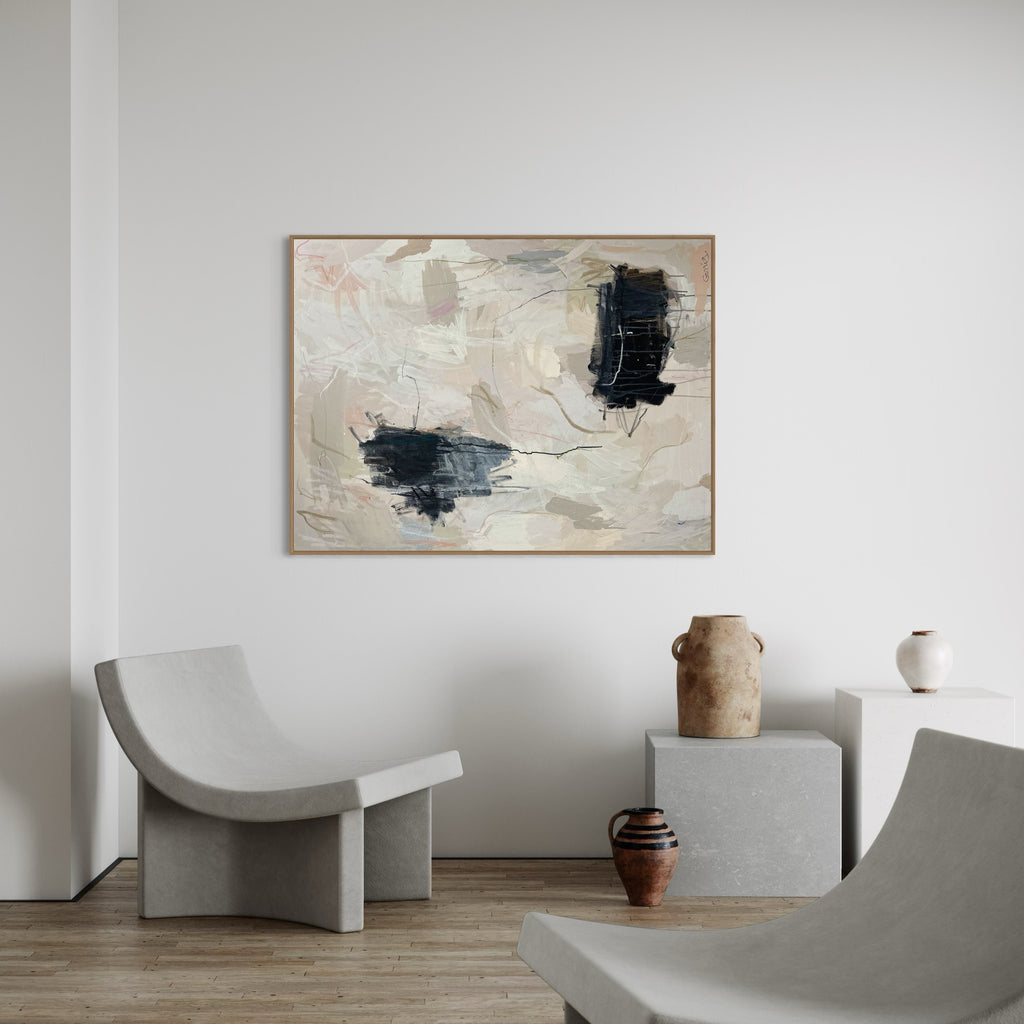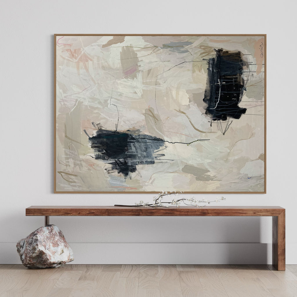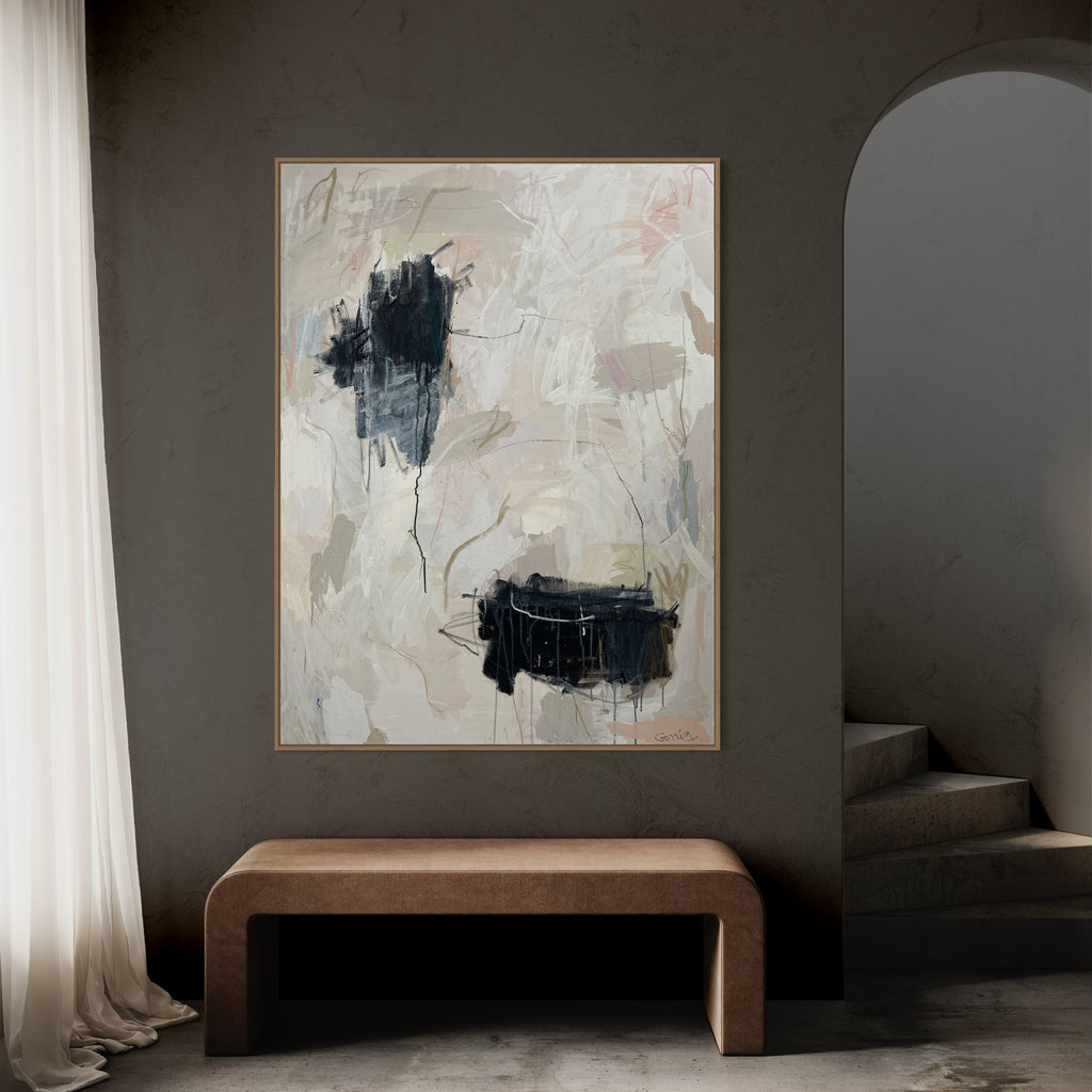 "Aether" explores the balance between density and openness, where bold indigo forms emerge from a layered field of soft neutrals. The composition shifts between movement and stillness, creating a sense of expansiveness that feels both grounded and ethereal.