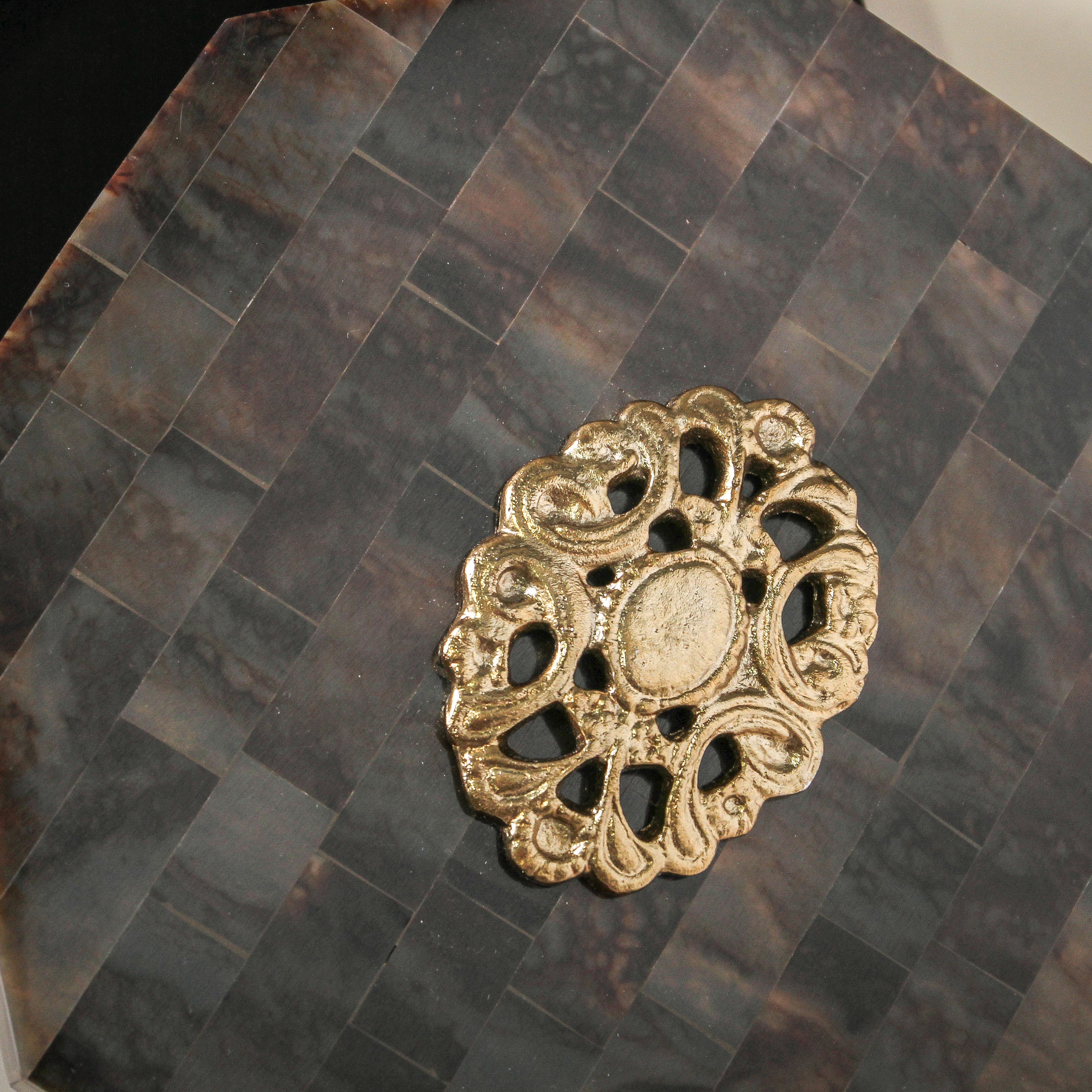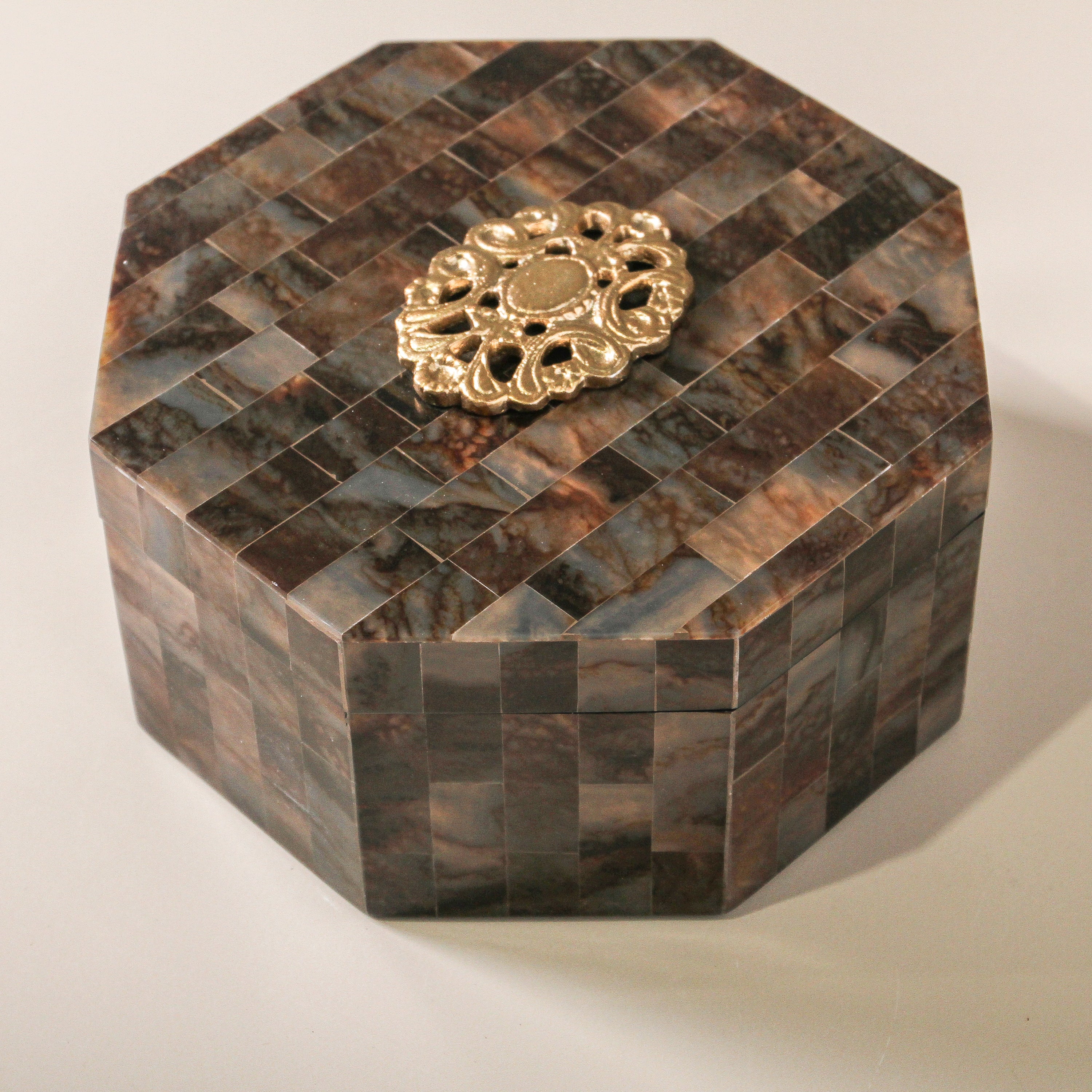 A piece of quiet opulence, the Amber Decorative Box is defined by its rich palette and thoughtful craftsmanship. Composed of hand-laid rectangular inlays of resin in tones of dark amber, tobacco, and burnished brown—each facet echoing the warmth of aged stone or glowing resin.