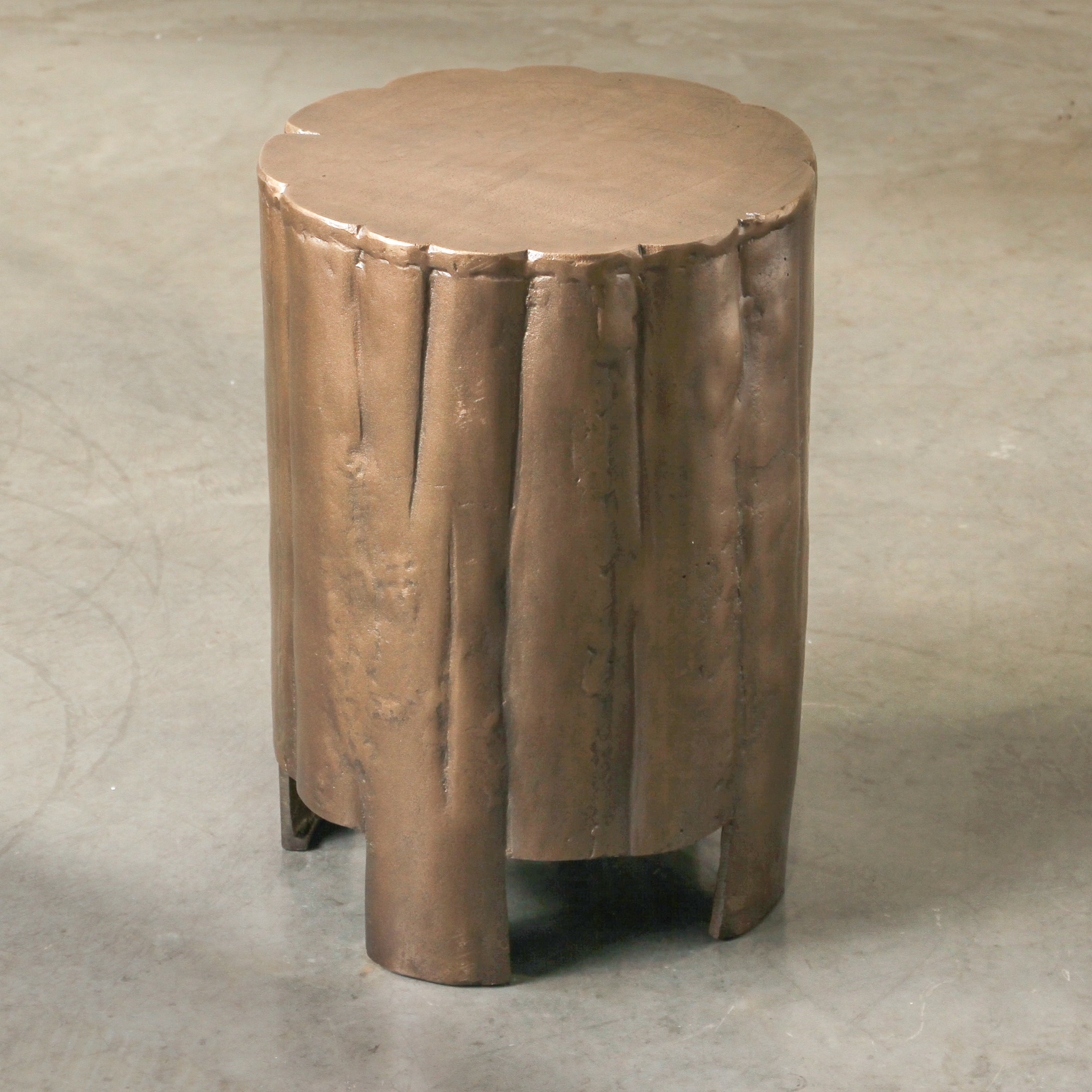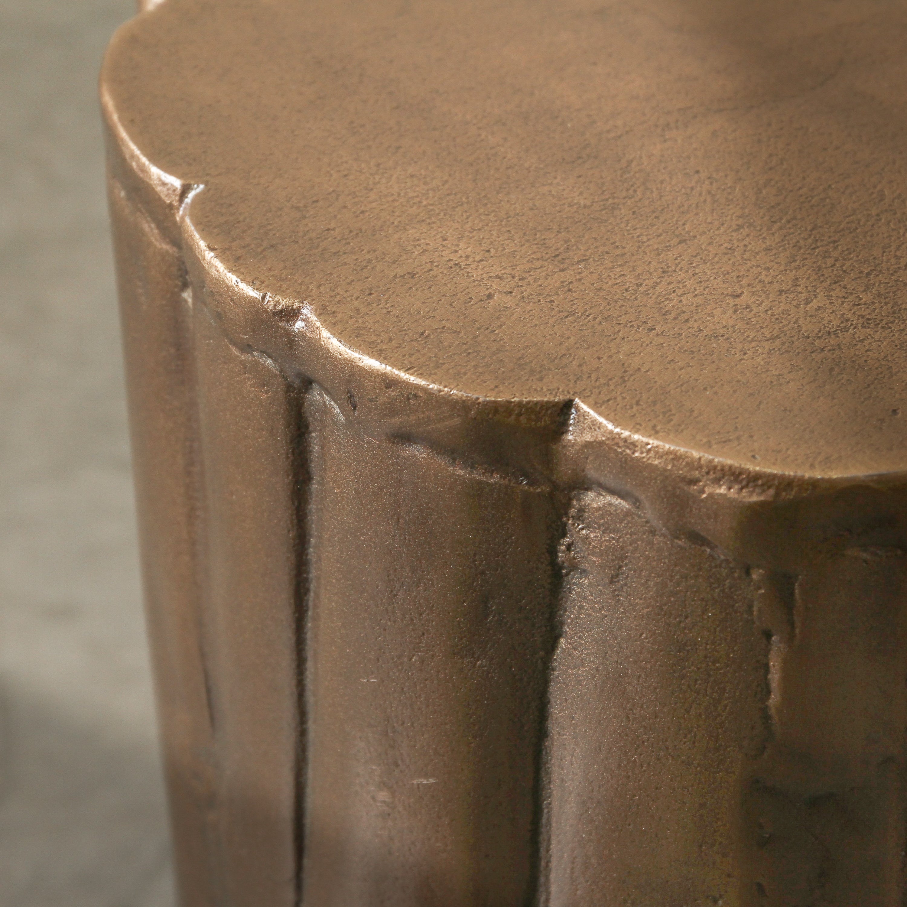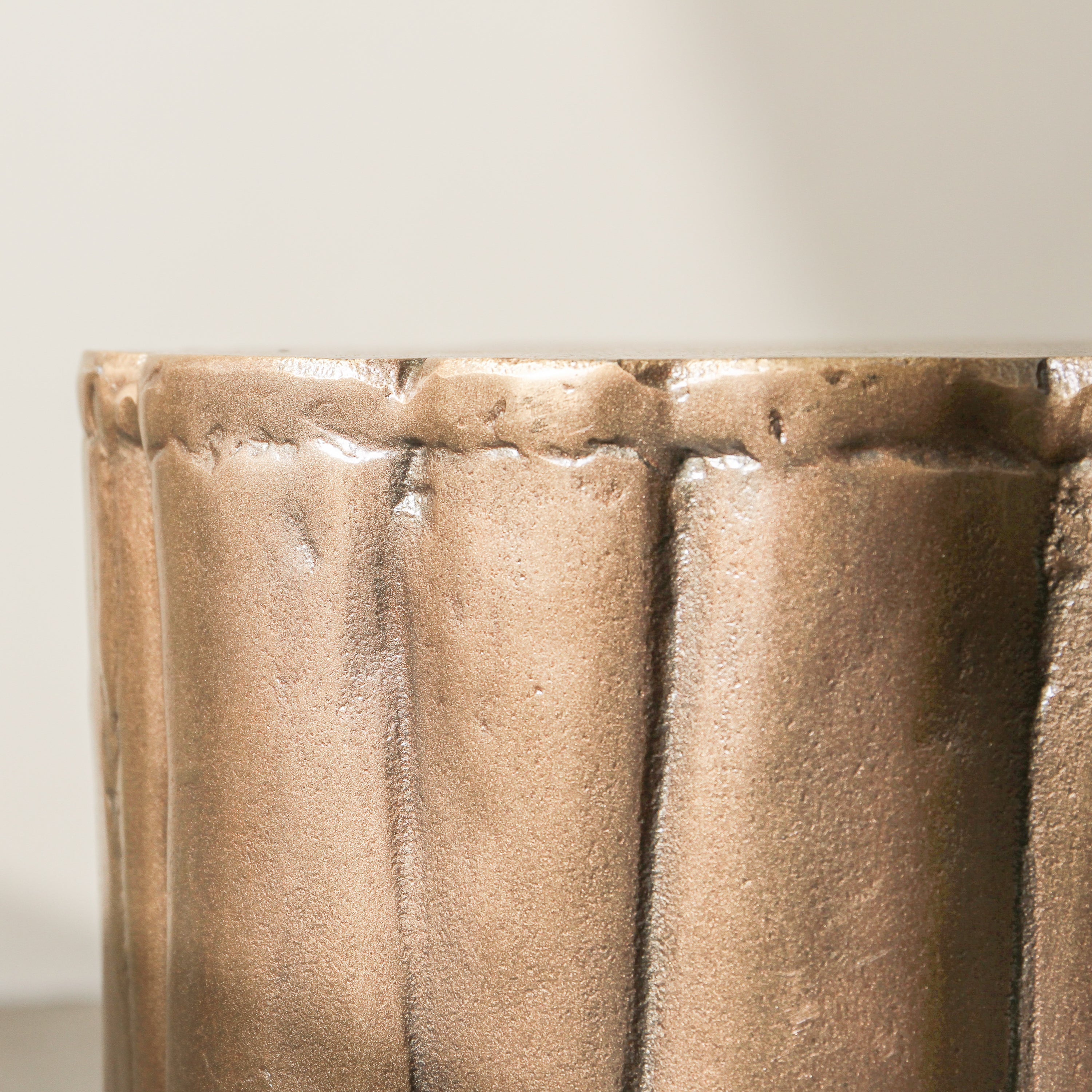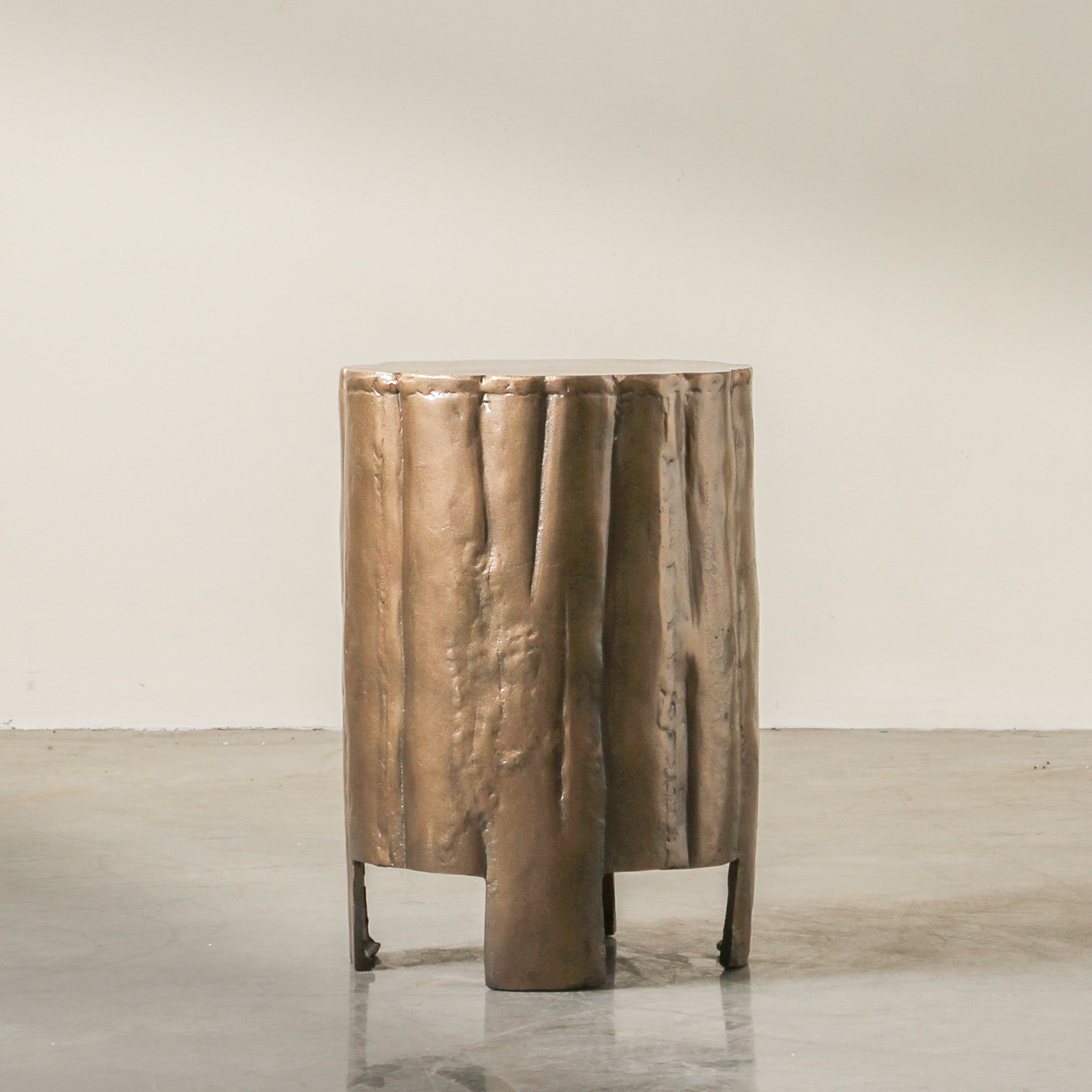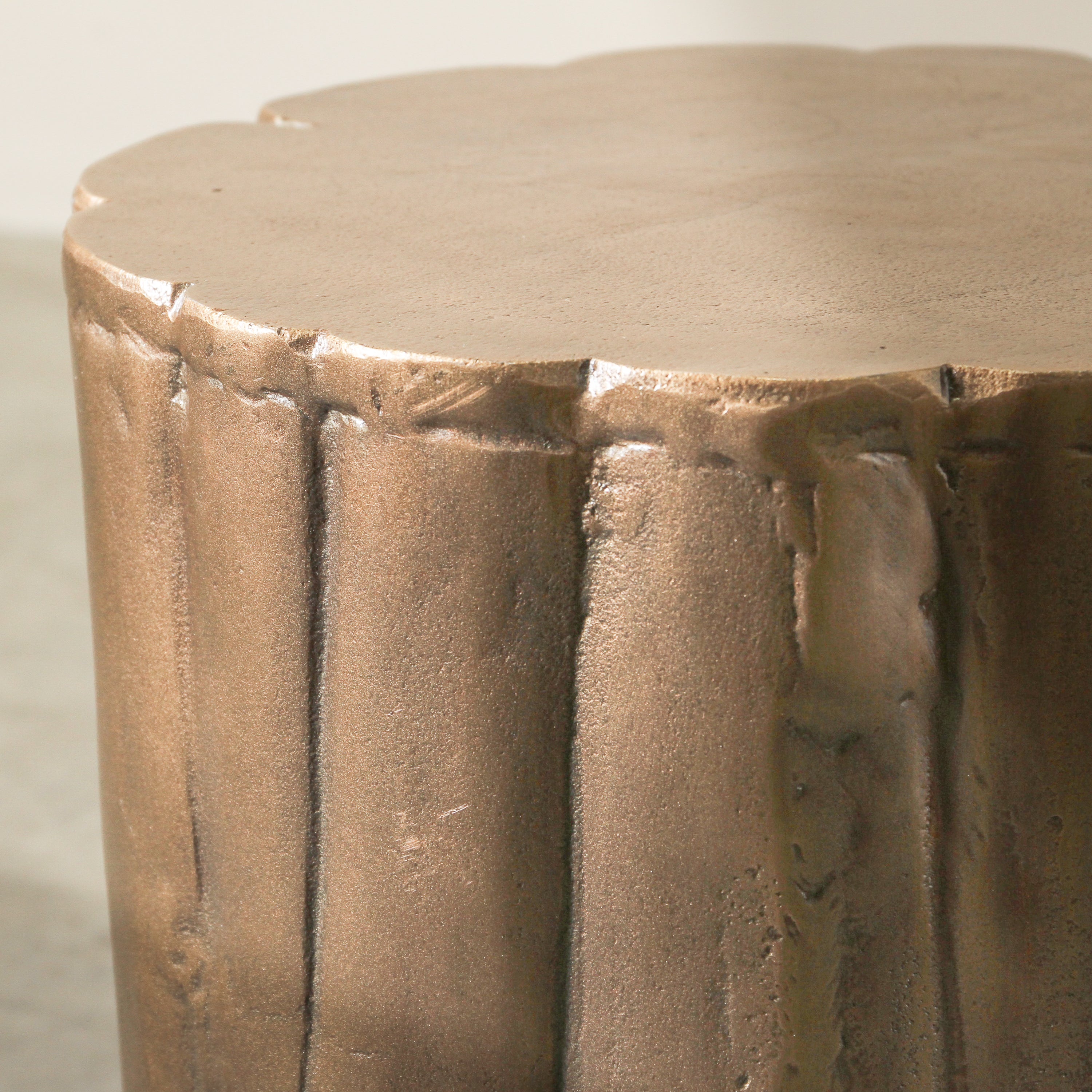 Subtle and sculptural, the Bark Side Table draws from nature’s quiet geometry. Cylindrical in form, its surface is etched with fine vertical lines—like the delicate striations of tree bark, softened by time. Finished in warm antique brass, it carries a golden glow that shifts gently with the light.