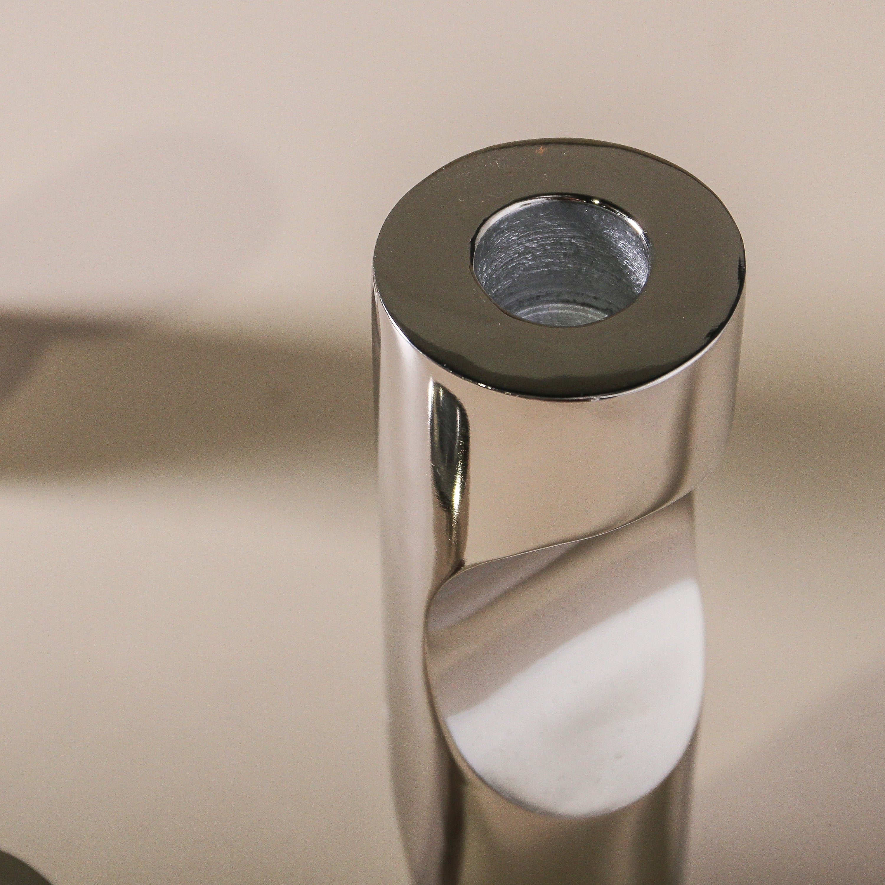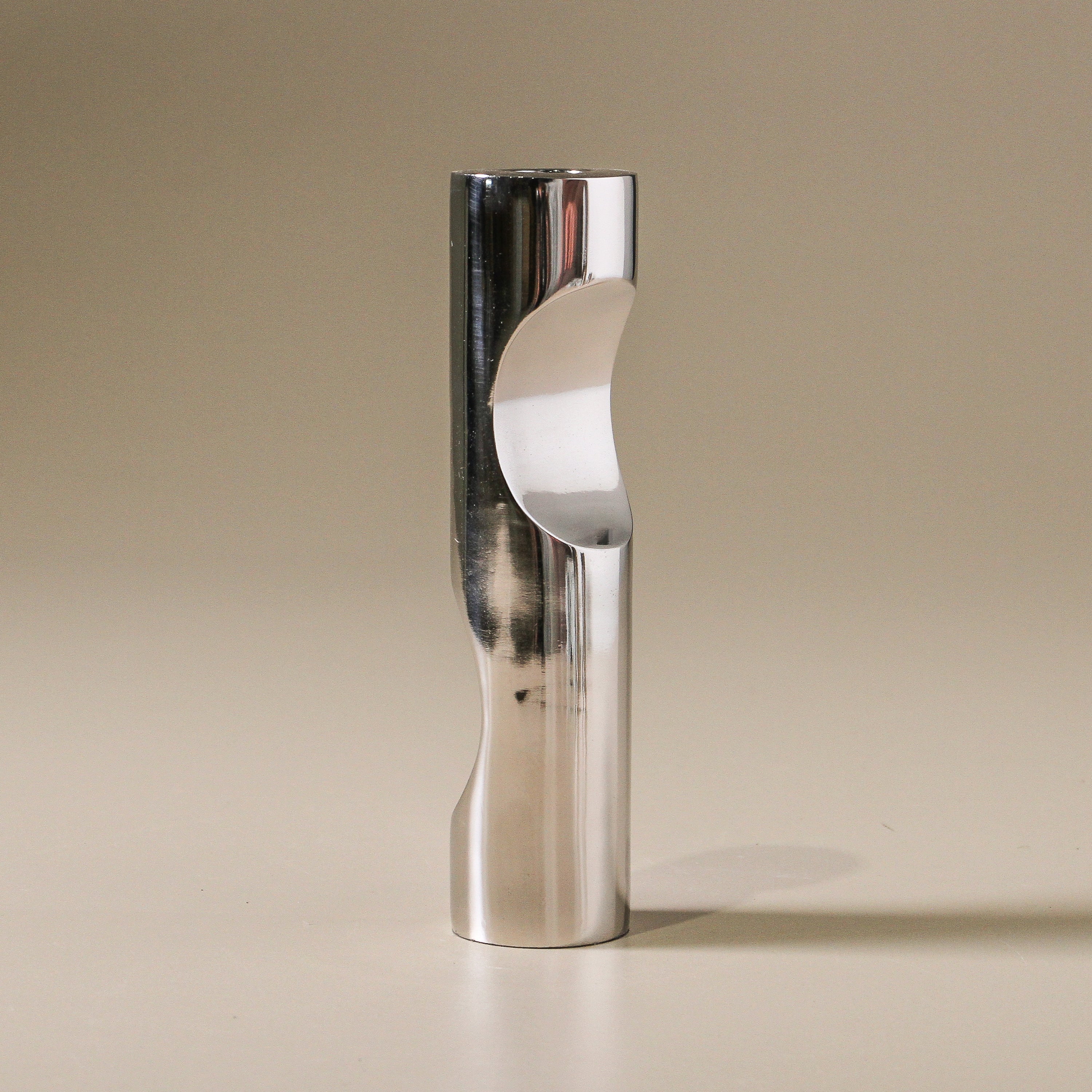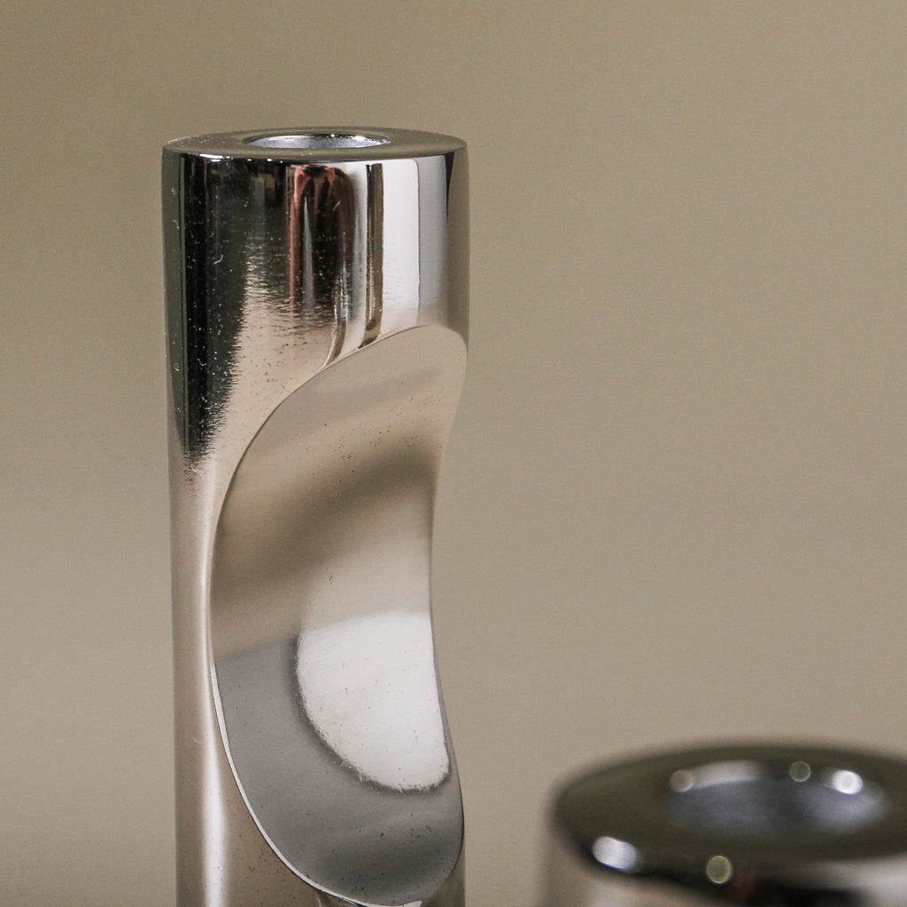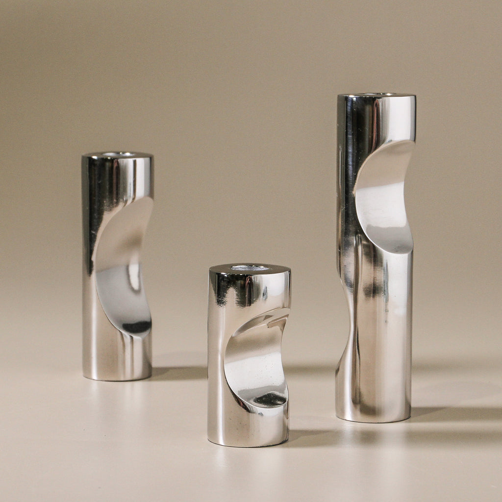 Minimal yet deeply considered, the Brilla Candlestand is a quiet gesture in form, cast in aluminium with a soft nickel finish and a gently brushed texture. Each piece features curved indentation that gives the column a sculptural tension, a moment of pause within the vertical line.