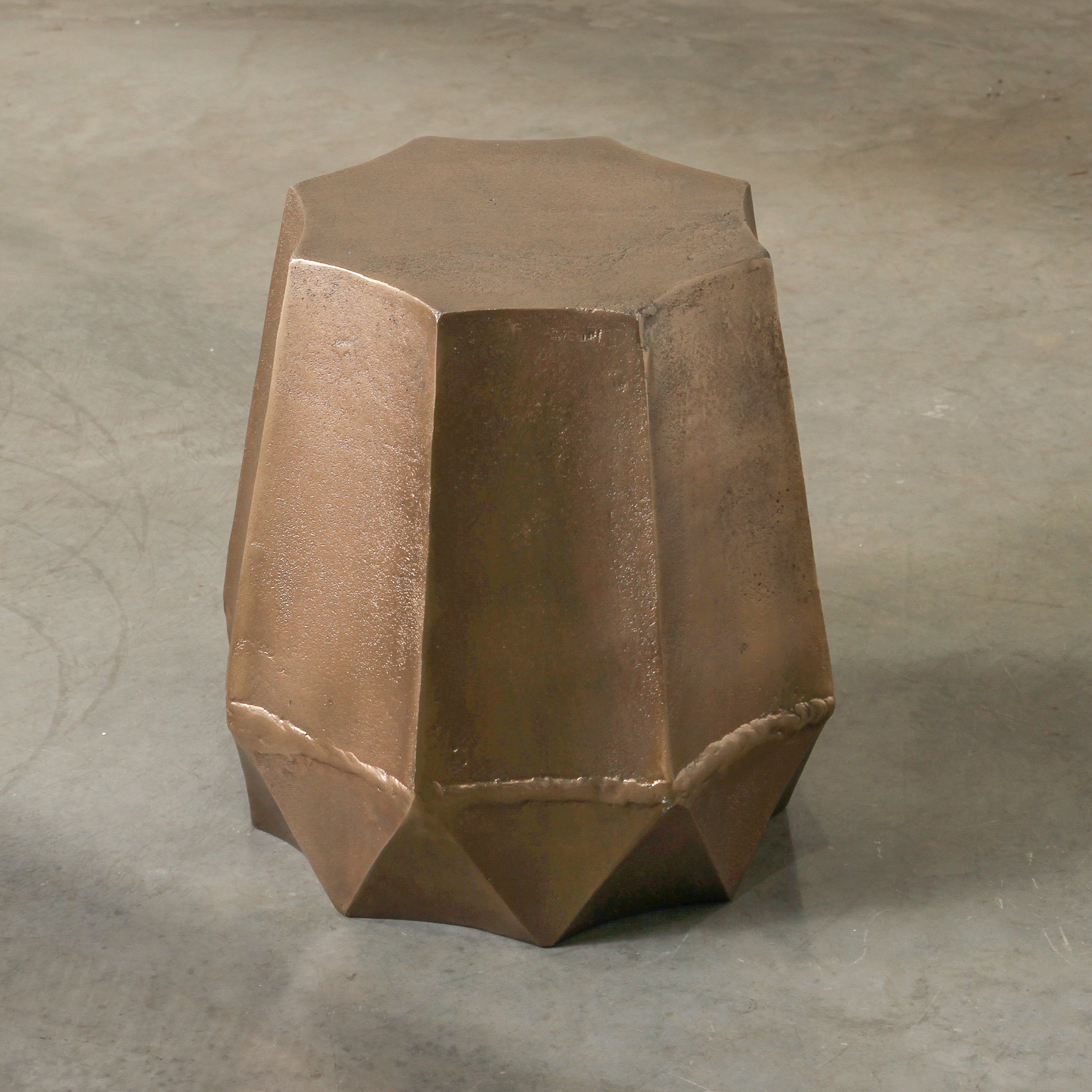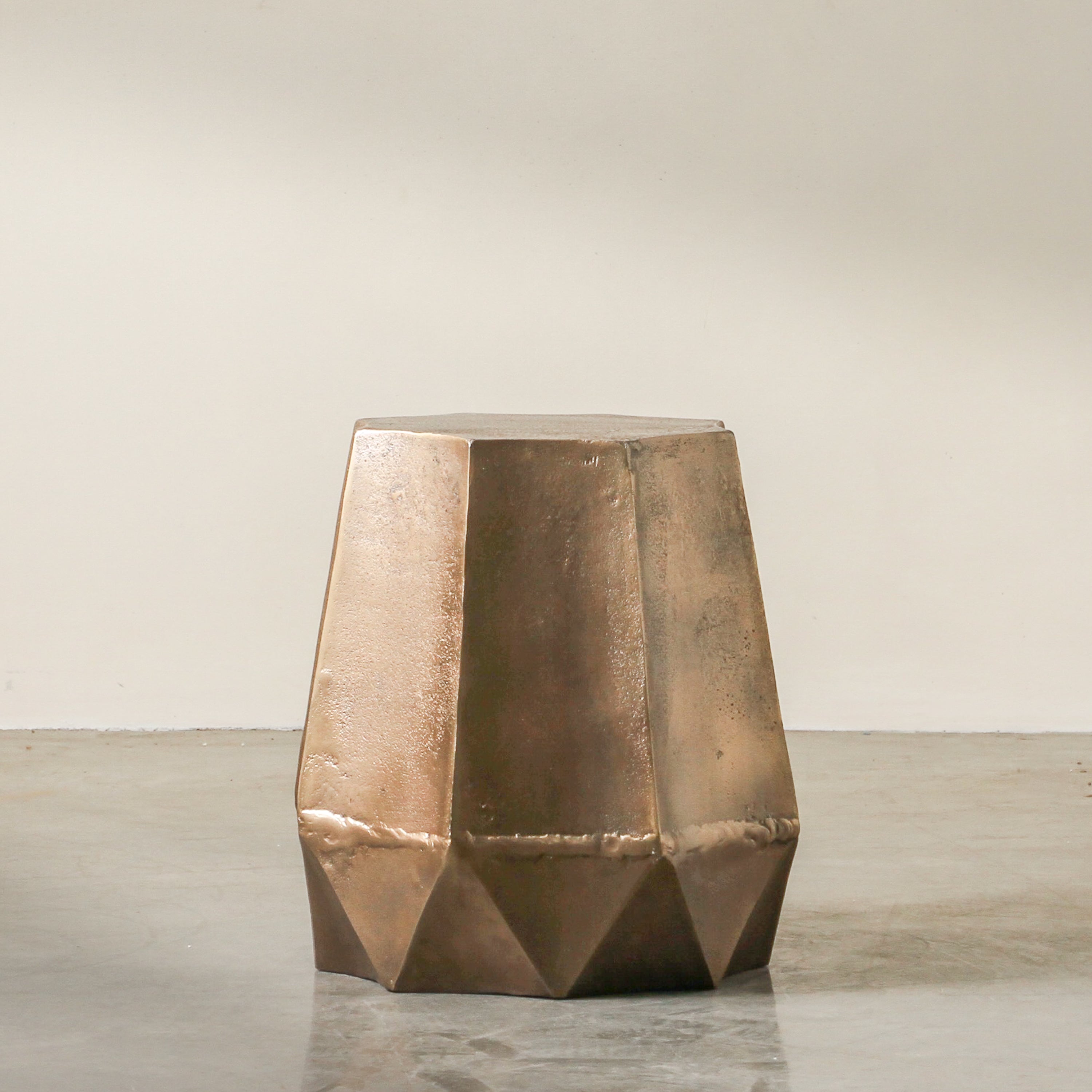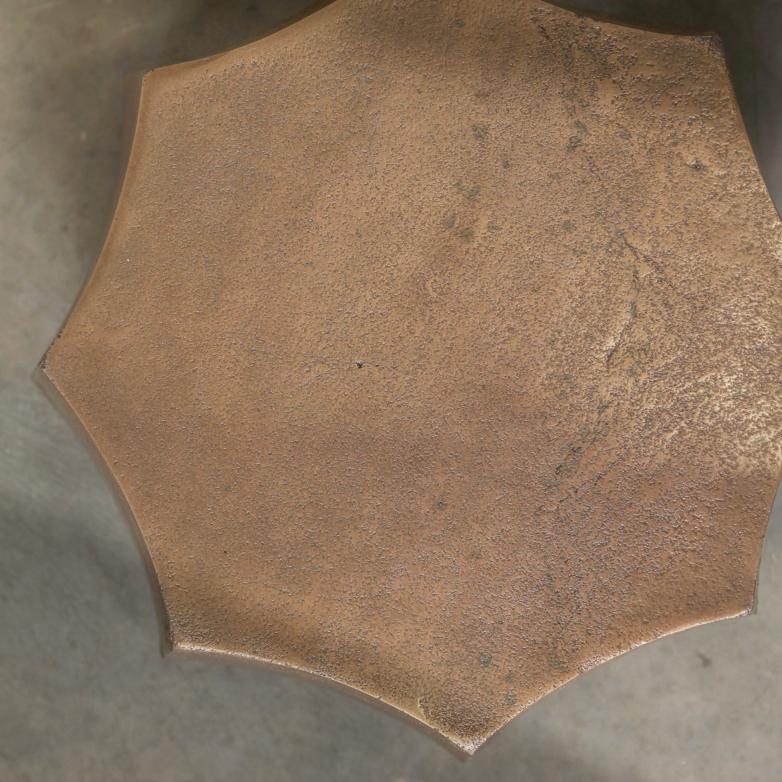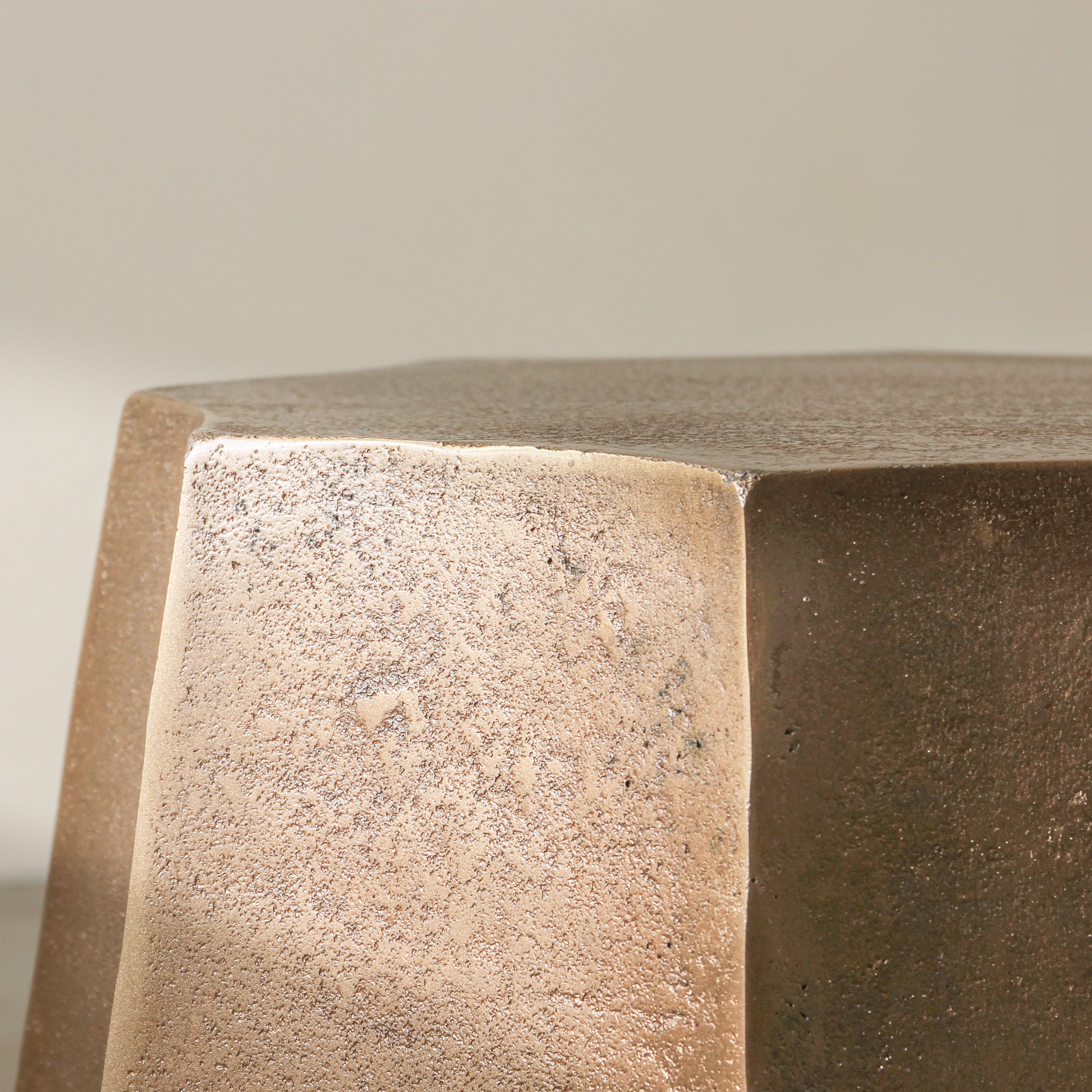 The Cameo Side Table is a study in sculptural geometry. Octagonal at the top, its faceted sides are carved with sharp lines and subtle planes—like a cut gemstone rendered in solid metal. The antique brass finish adds warmth and depth, catching the light across each angled surface in a quiet, ever-changing play of shadow. There’s a tactile strength to this piece—elegant but grounded, refined yet bold in form. Perfect as a statement beside a textured armchair or styled as a bedside accent. Style it with a low vessel, a single object, or even left bare to honour its architectural beauty.