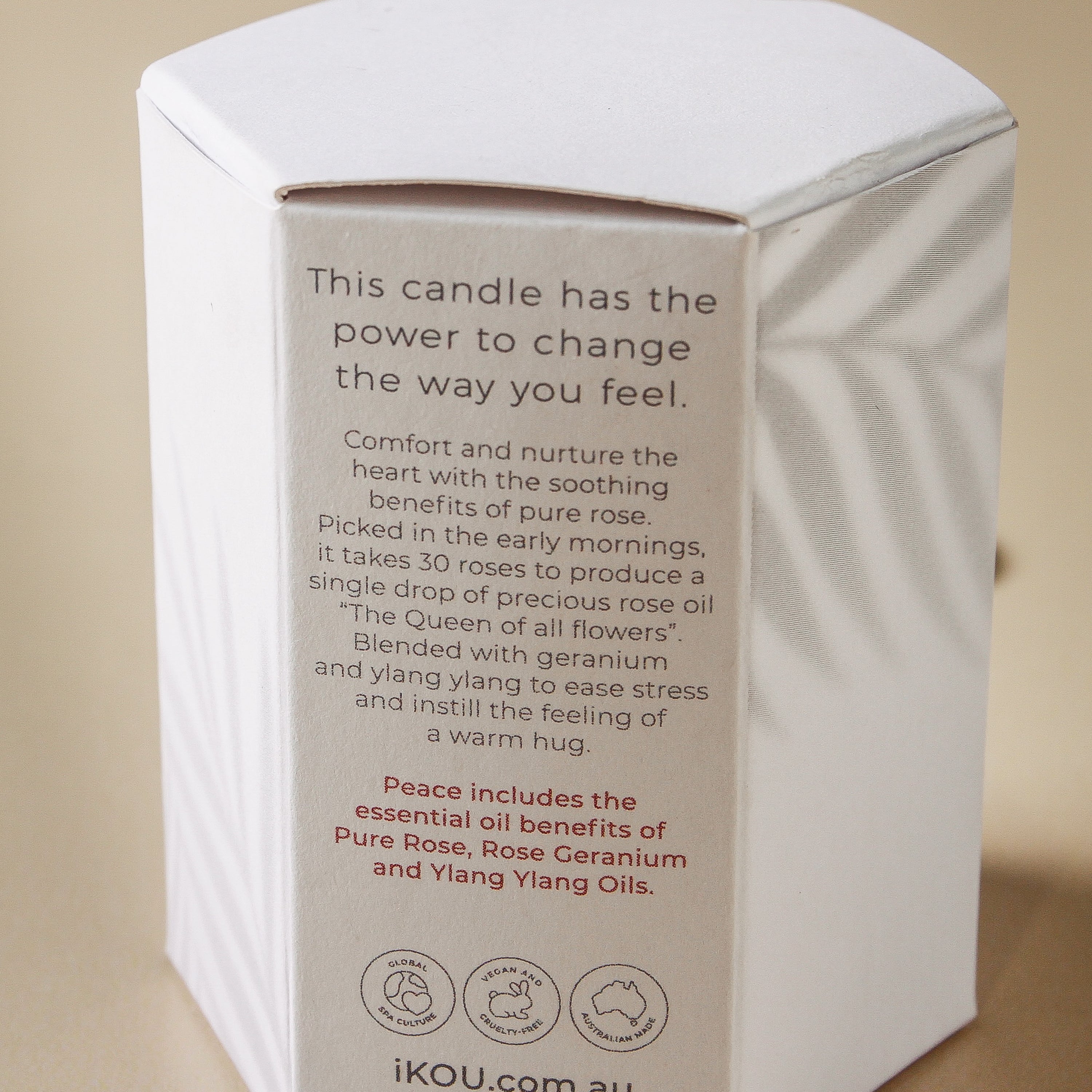 Peace: Designed to nurture and comfort the heart, this candle blooms with Turkish rose, rose geranium, and ylang ylang. It's a soul-soothing ritual in a glass jar-hand-poured and all-natural.