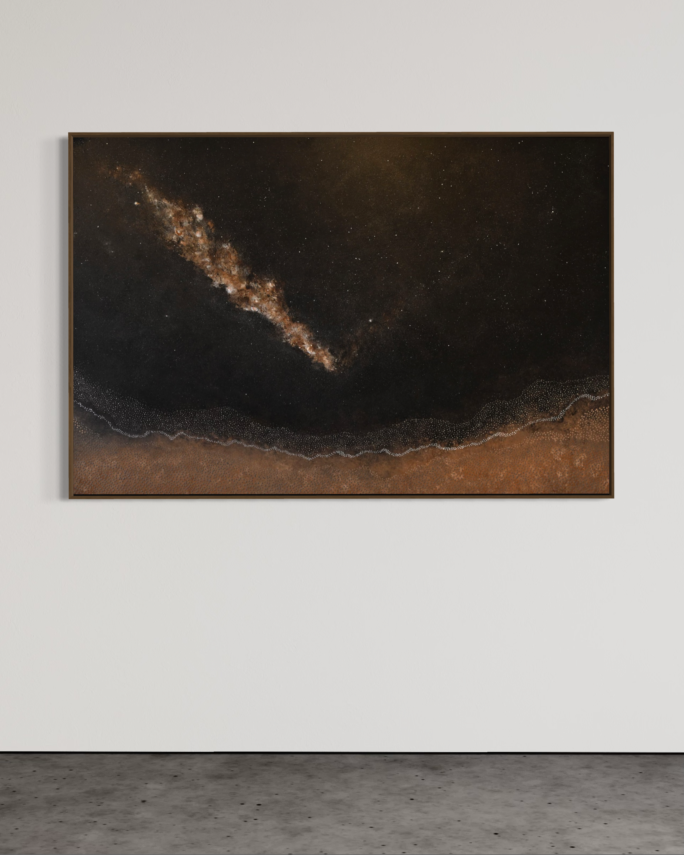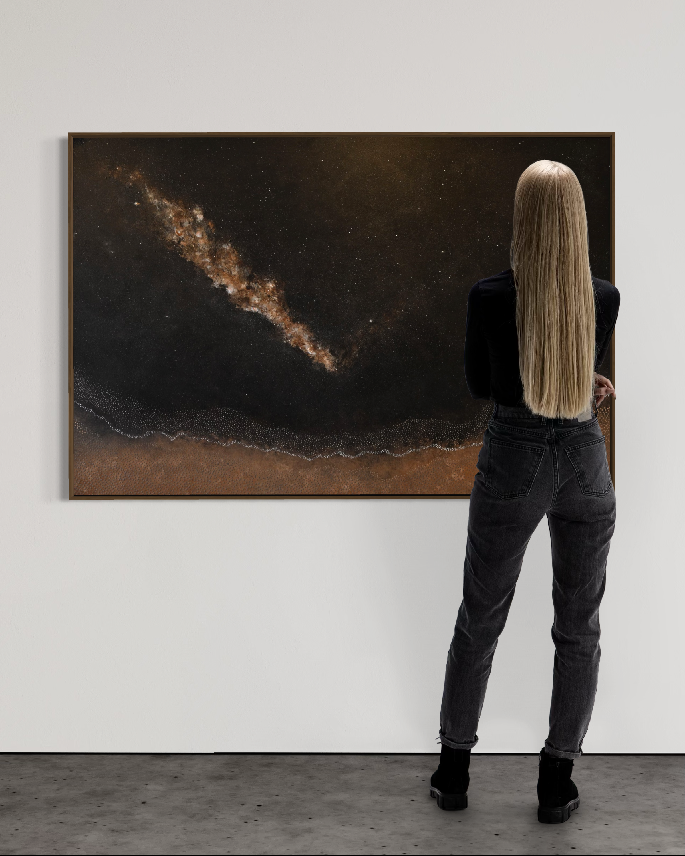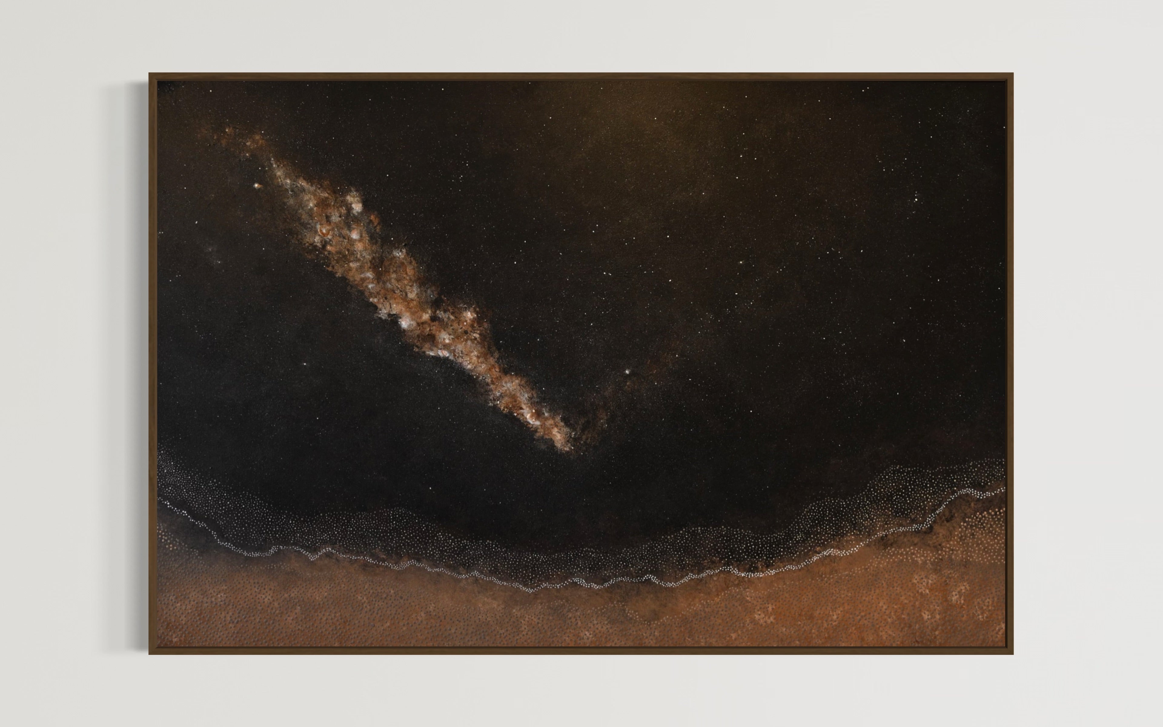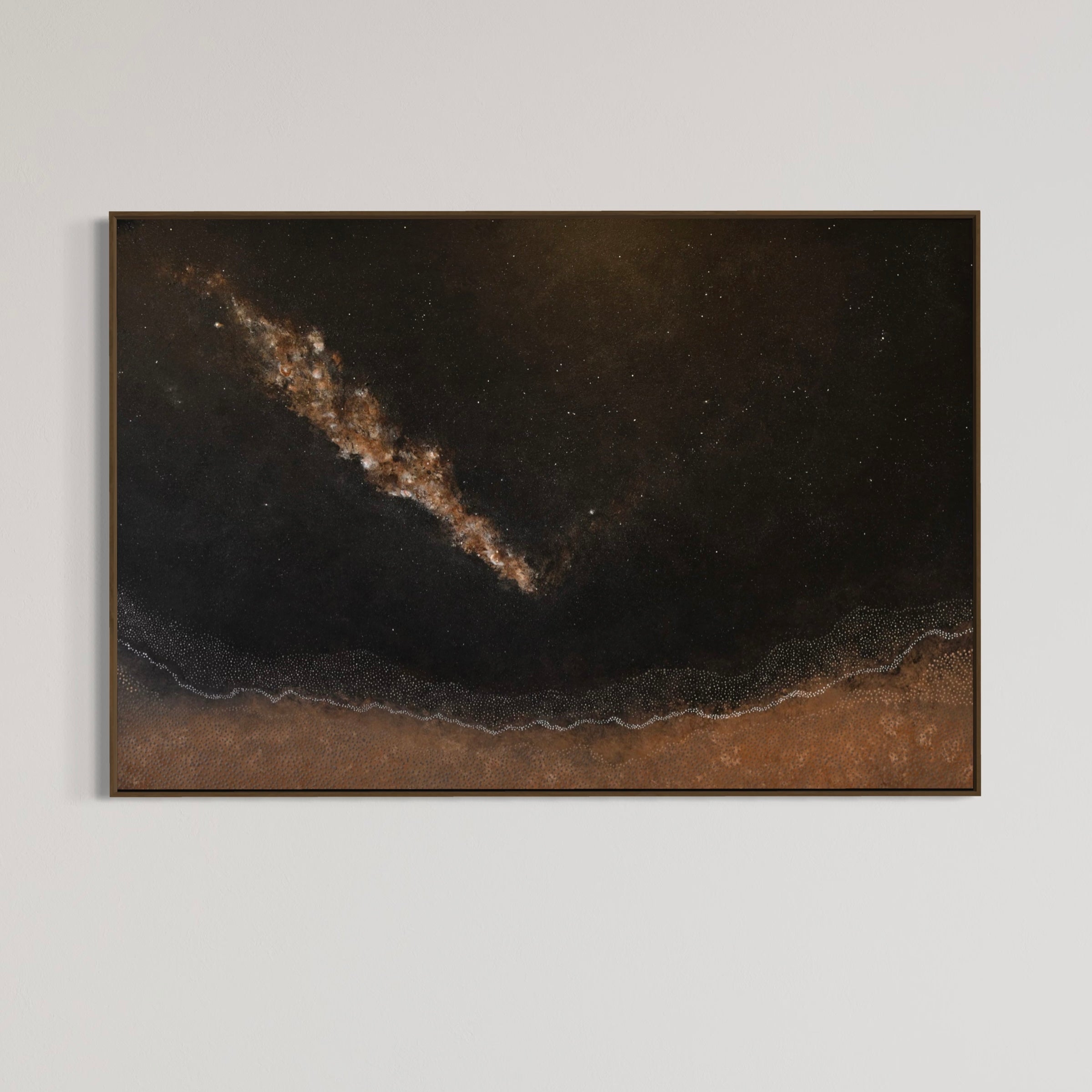 Celestial Reverence is an offering to the night sky — a quiet acknowledgment of the vast intelligence that exists beyond us. Drawing the eye upward and inward, the work reflects the ancient relationship between humans and the cosmos, where stars once guided movement, story, and meaning. At 150 x 100cm, the painting holds a sense of stillness and depth, echoing the moment of standing beneath an open sky and feeling both small and profoundly connected. Earthy tones anchor the composition, while the celestial form moves across the canvas like a whispered reminder of time, ancestry, and the infinite cycles that continue long after us. This work invites contemplation — a pause to remember that the sky has always been watching, holding, and orienting us.