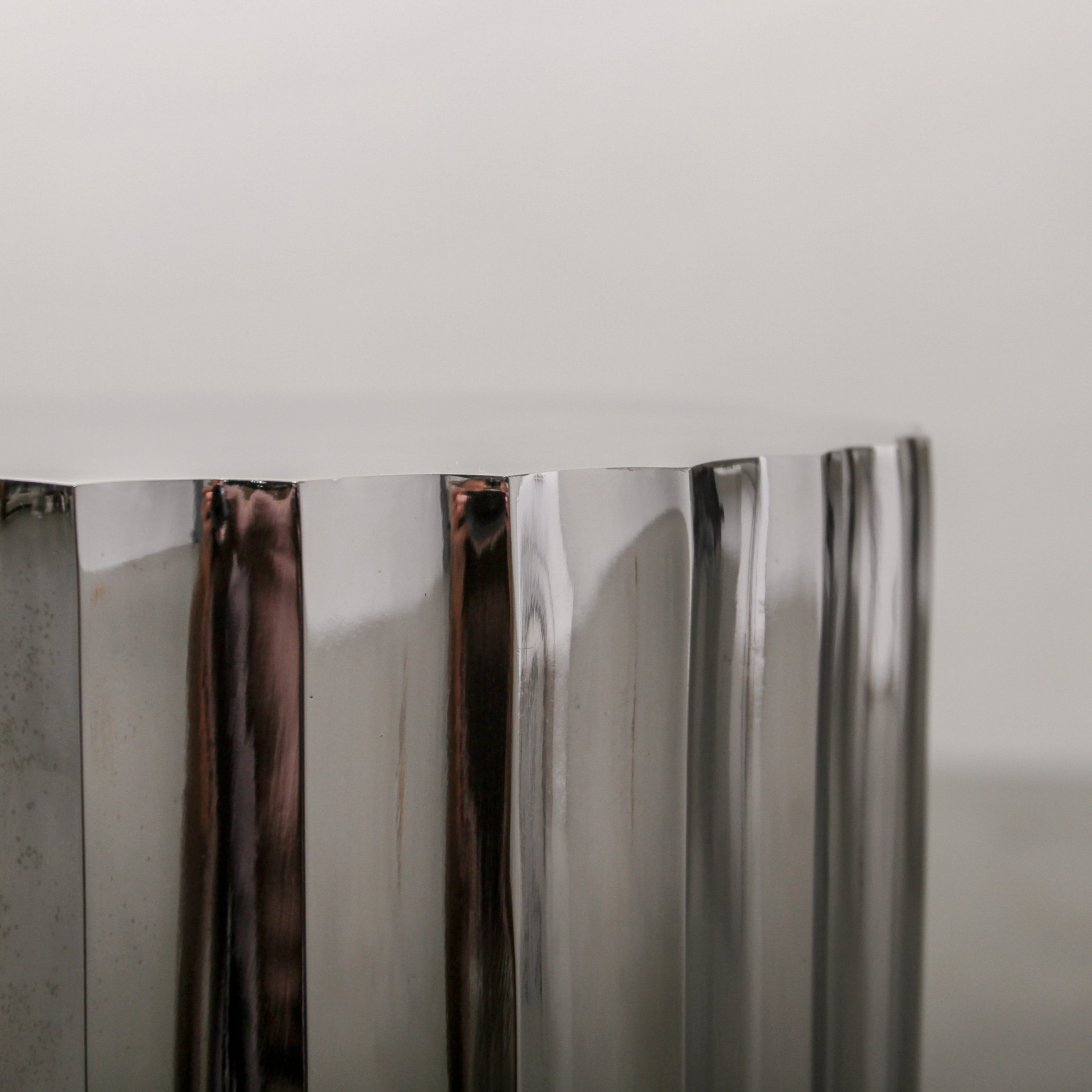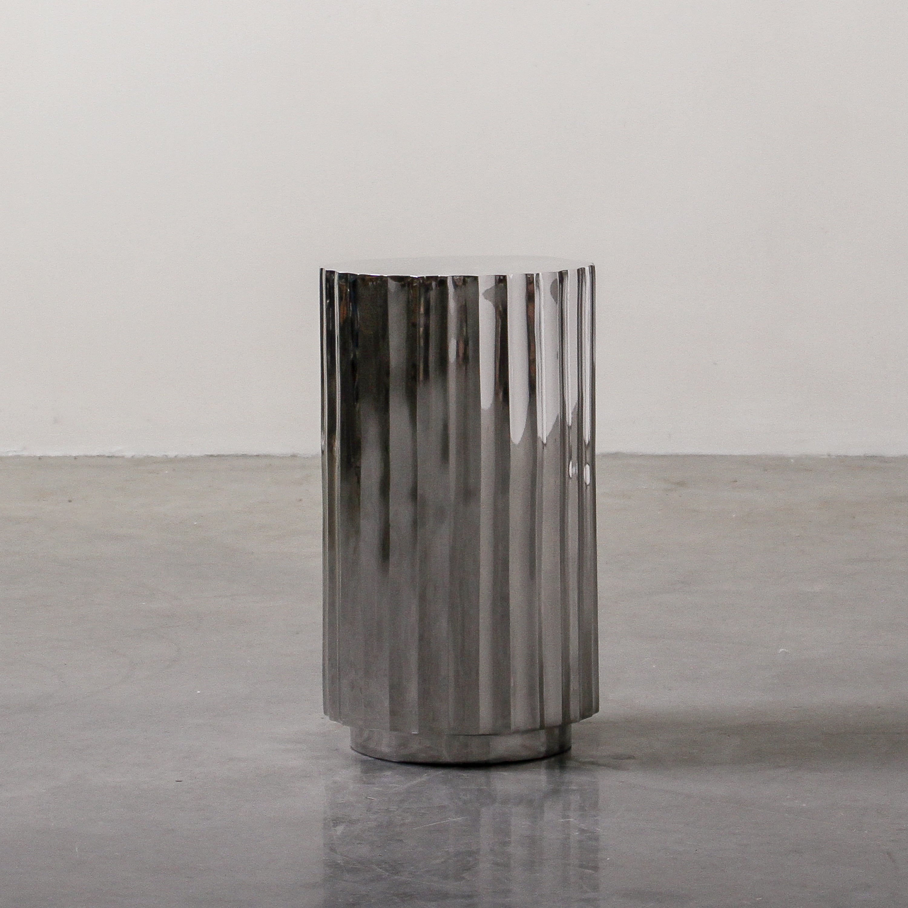 With its fluted vertical lines and mirror-like nickel finish, the Chroma Stool is a study in quiet beauty. Crafted from cast aluminium with a subtle hammered texture, it reflects light in soft waves - polished, but never stark. Its reeded surface brings a sense of order and rhythm to its cylindrical form, making it feel architectural yet understated.
