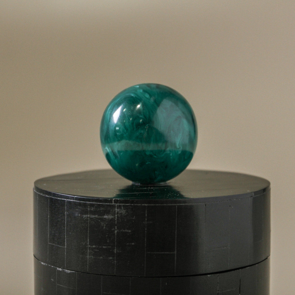 Sculptural and striking, the Clea Canister is a modern vessel imbued with quiet drama. Its cylindrical form is cast in deep black resin—smooth, seamless, and grounding—while a single emerald-green orb crowns the lid, jewel-like in its simplicity.