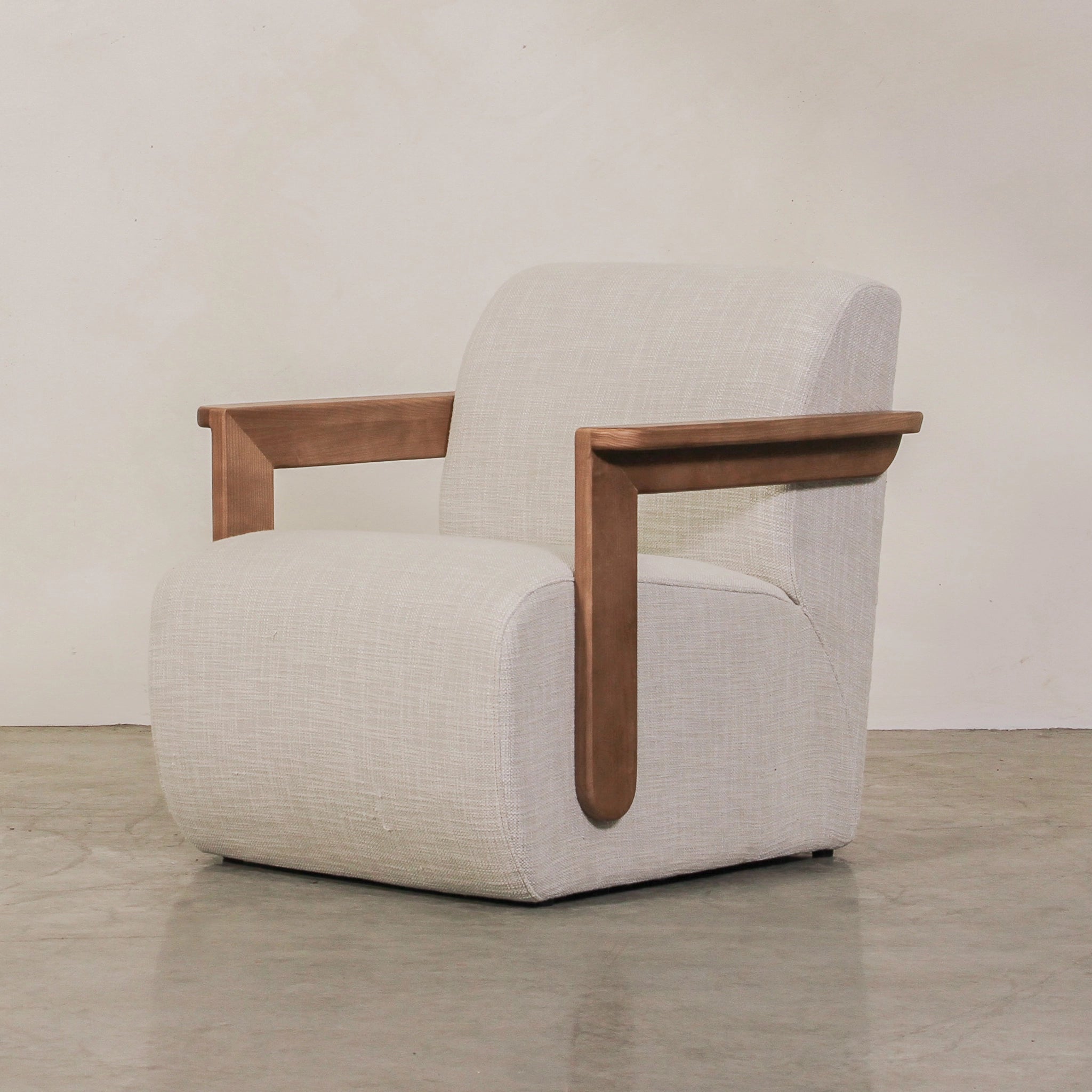 Our Corwin Occasional Armchair is mid-century inspired statement piece that blends sculptural elegance and grounded design. This unique upholstere chair features wooden arms that seamlessly extend into the base, eliminating traditional legs for a sculpturally grounded feel.
