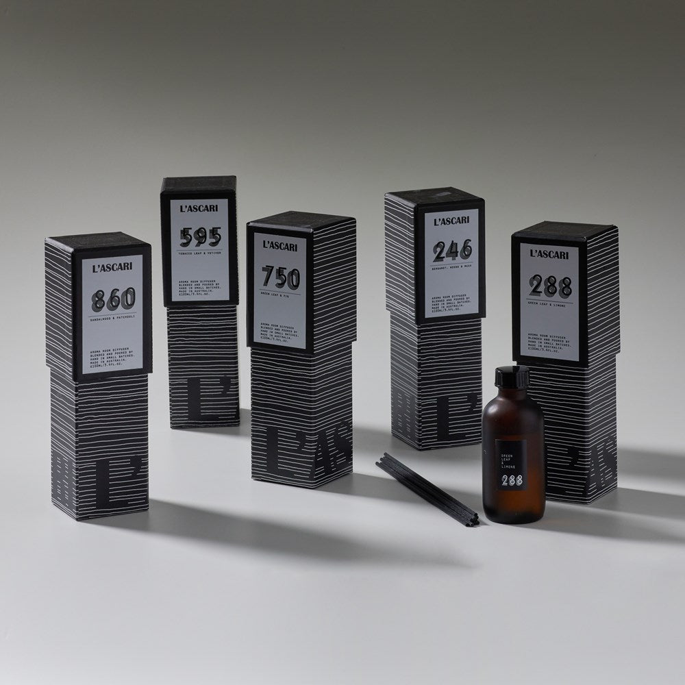 Slow made, minimalist design with complex and unique aromas. The L'ASCARI range of room diffusers is hand blended, hand poured and hand labelled; made up of 100mls of aroma oil to discreetly fill your space with a choice of 6 unique fragrances. No alcohol is used and each diffuser comes with 10 black sticks. Lasts 6-9 months. Made in Australia A powerful, sexy fragrance with bergamot, cedarwood, fruits, florals, musk and tobacco.