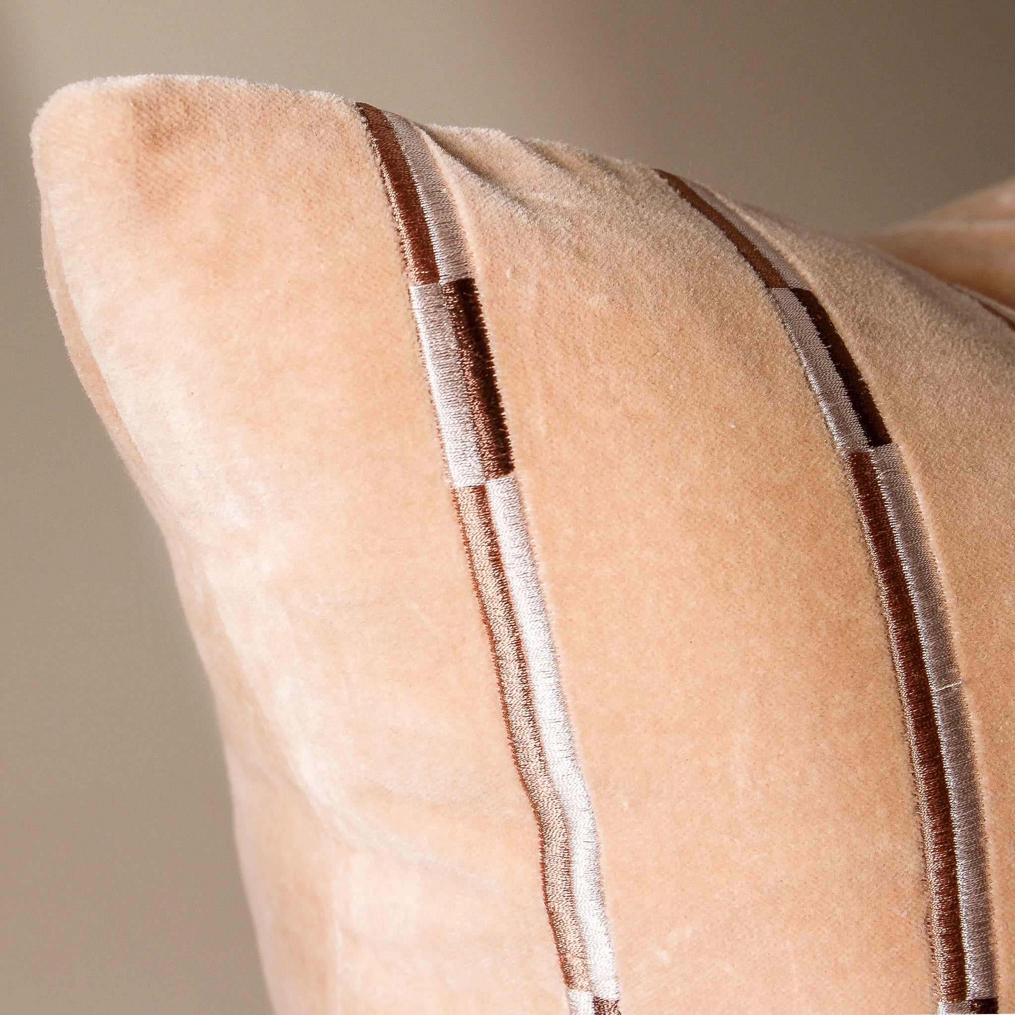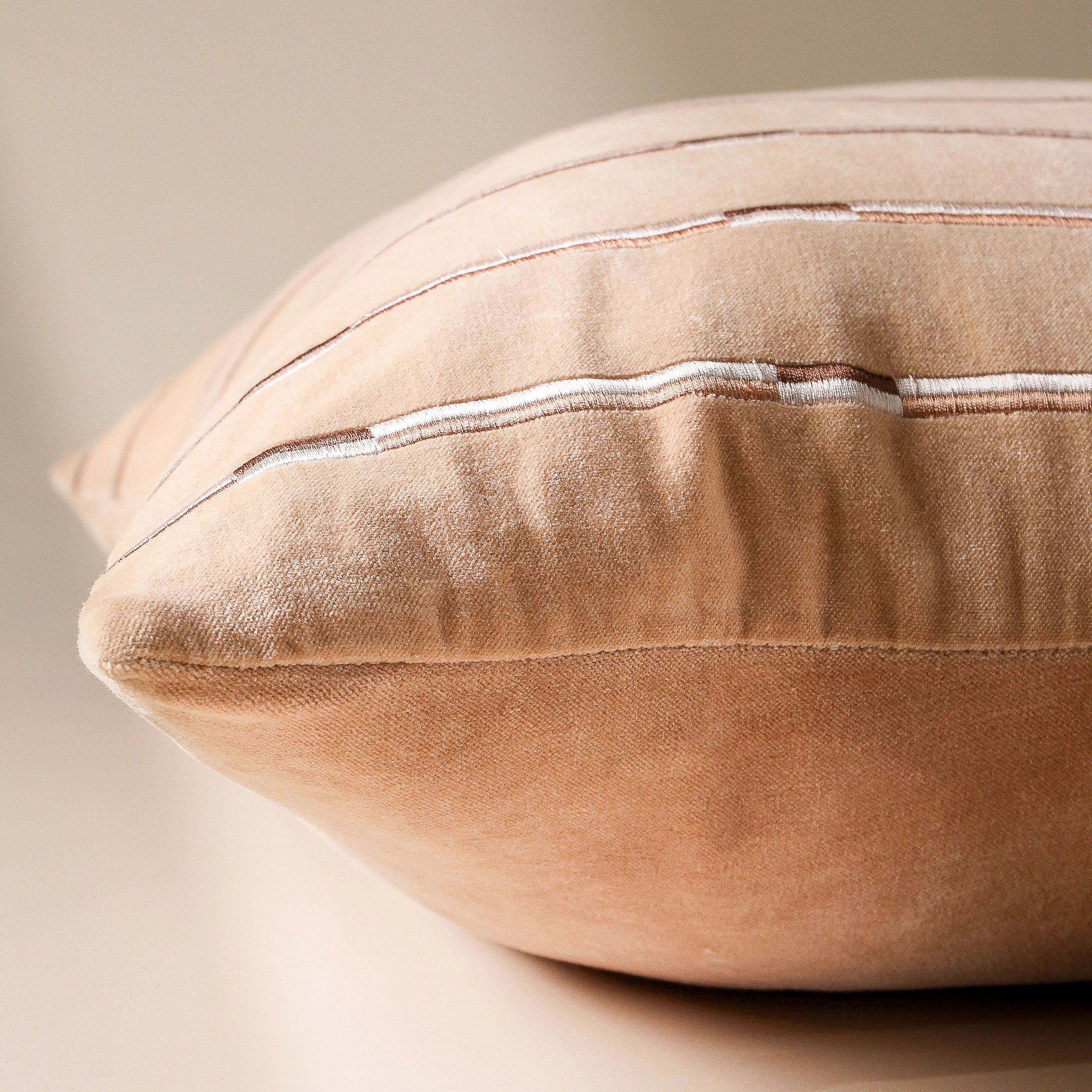 A square cotton velvet cushion brings soft sophistication to any seating arrangement. Eden's embroidered linear pattern creates subtle texture across the matte surface, while the warm nougat tone offers quiet elegance that works as beautifully with heritage pieces as it does alongside contemporary furniture. The off-set geometric detailing catches light differently throughout the day, adding gentle movement to lounges, reading chairs, or bedroom styling. Layer with contrasting textures — perhaps a chunky knit throw or smooth linen — to honour the beautiful tension between polished and organic.