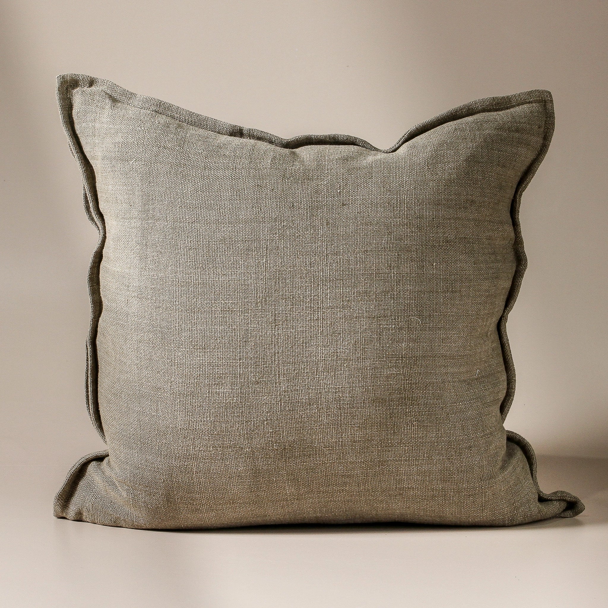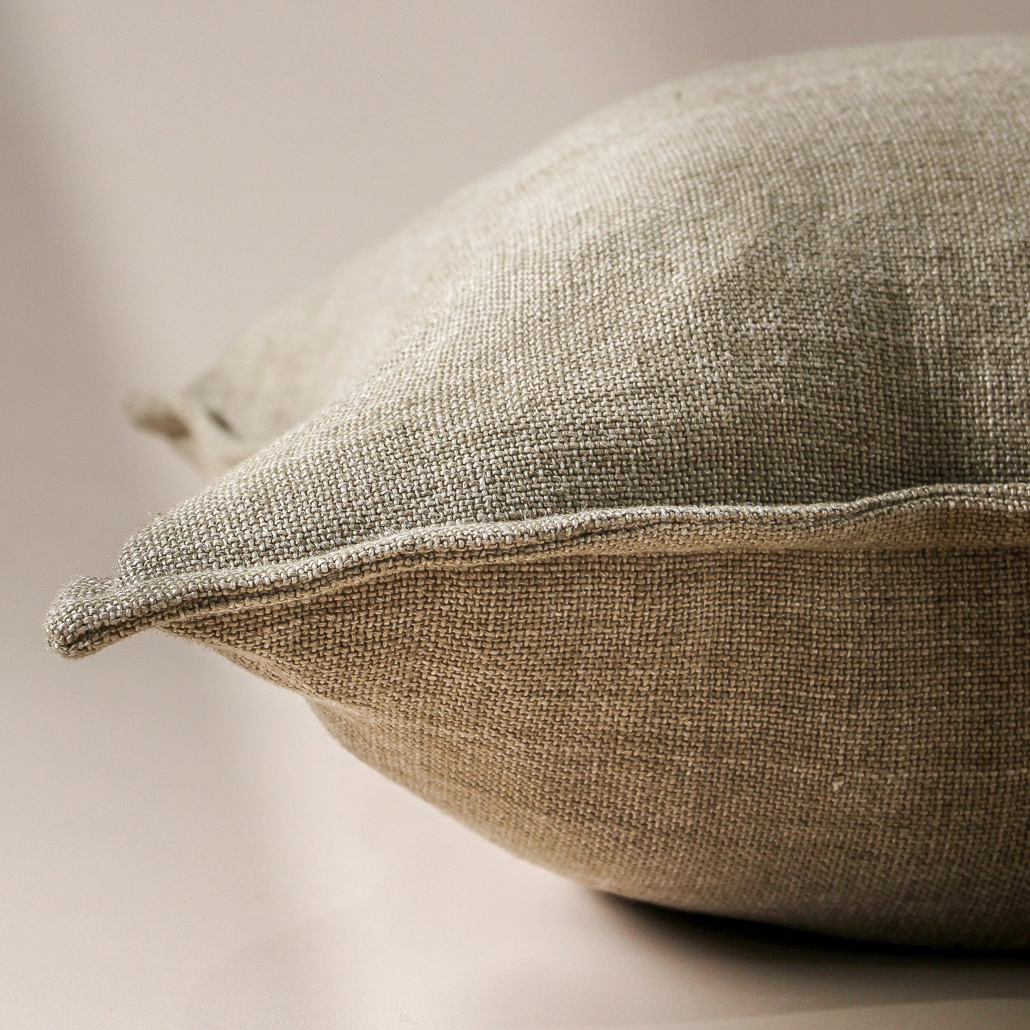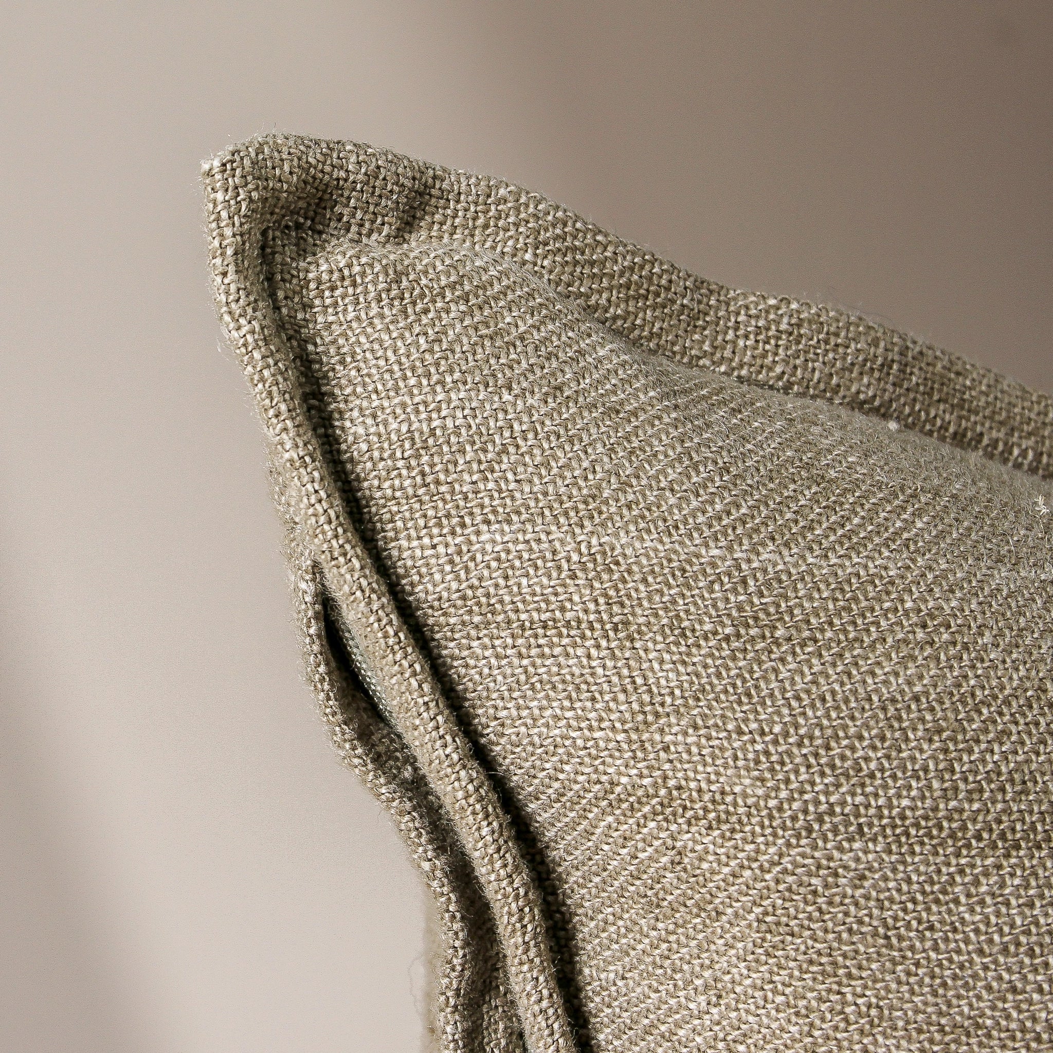 A linen cushion in kelp — the colour of dried seaweed and weathered driftwood. Heavy-weight weave celebrates the natural texture of raw fibres, each thread carrying the story of flax fields under wide skies. The earthy tone grounds contemporary interiors with organic warmth. The 1cm flange edge adds architectural detail to the organic form, creating beautiful contrast when layered against sleek leather or polished marble. This is the kind of textural foundation that makes a room feel collected over time, not decorated in a day.