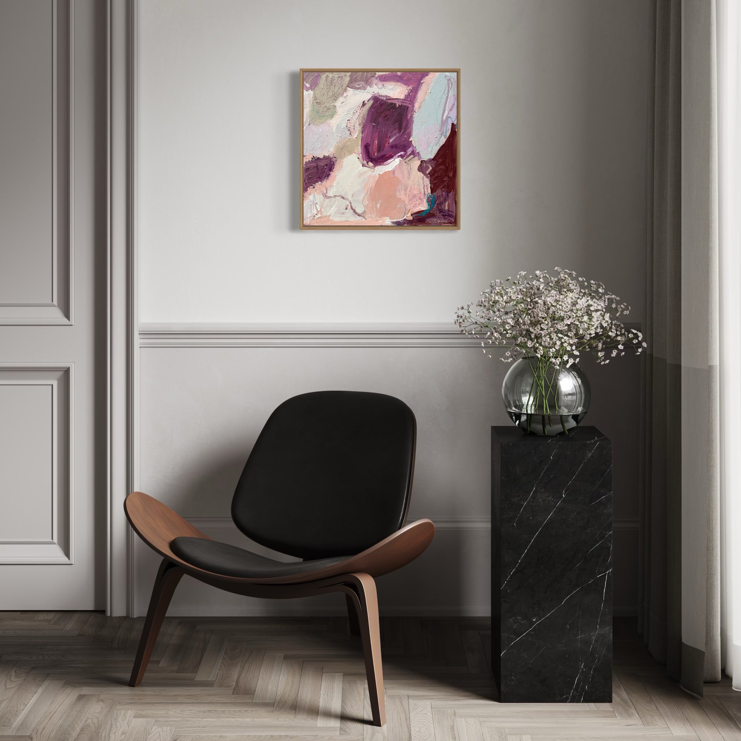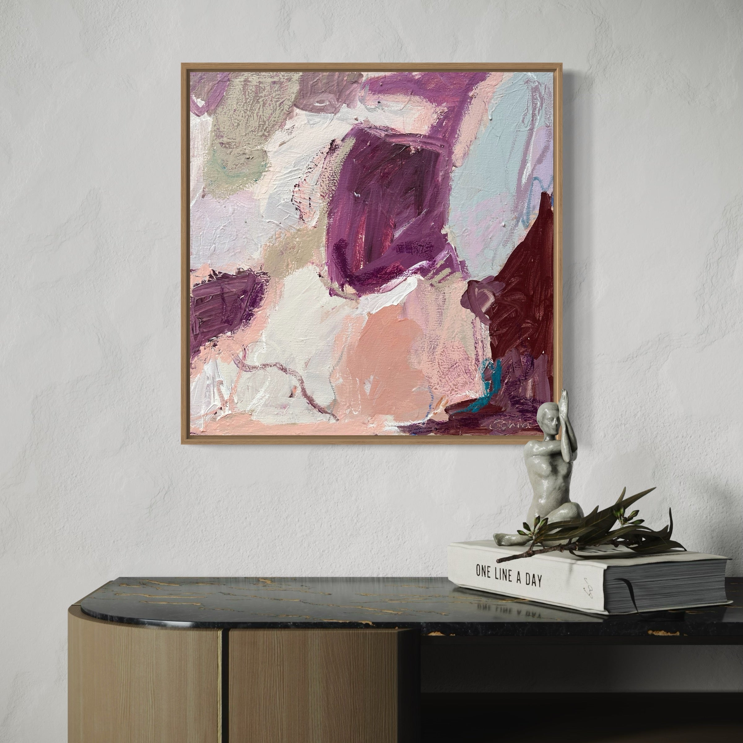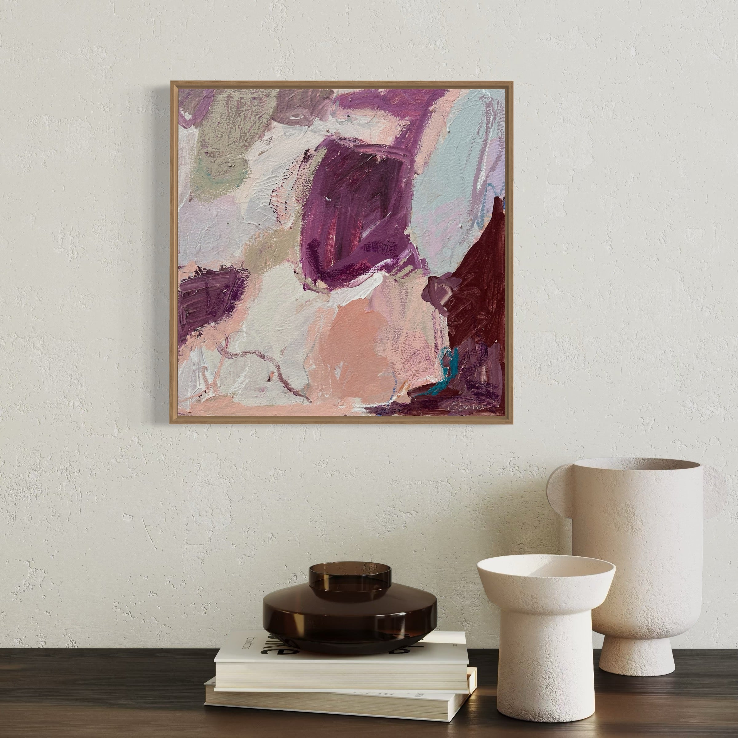 “Florence” artwork is grounded in contrast — not loud, but quietly intentional. In this series, burgundy and muted pink tones interact across layered compositions, creating tension and balance. This piece feels like a study in restraint, where texture and tone do the talking. The brushwork is deliberate and textural, holding space between colour blocks and blurred edges. The burgundy adds weight, the pink softens — together creating a sense of both movement and stillness.