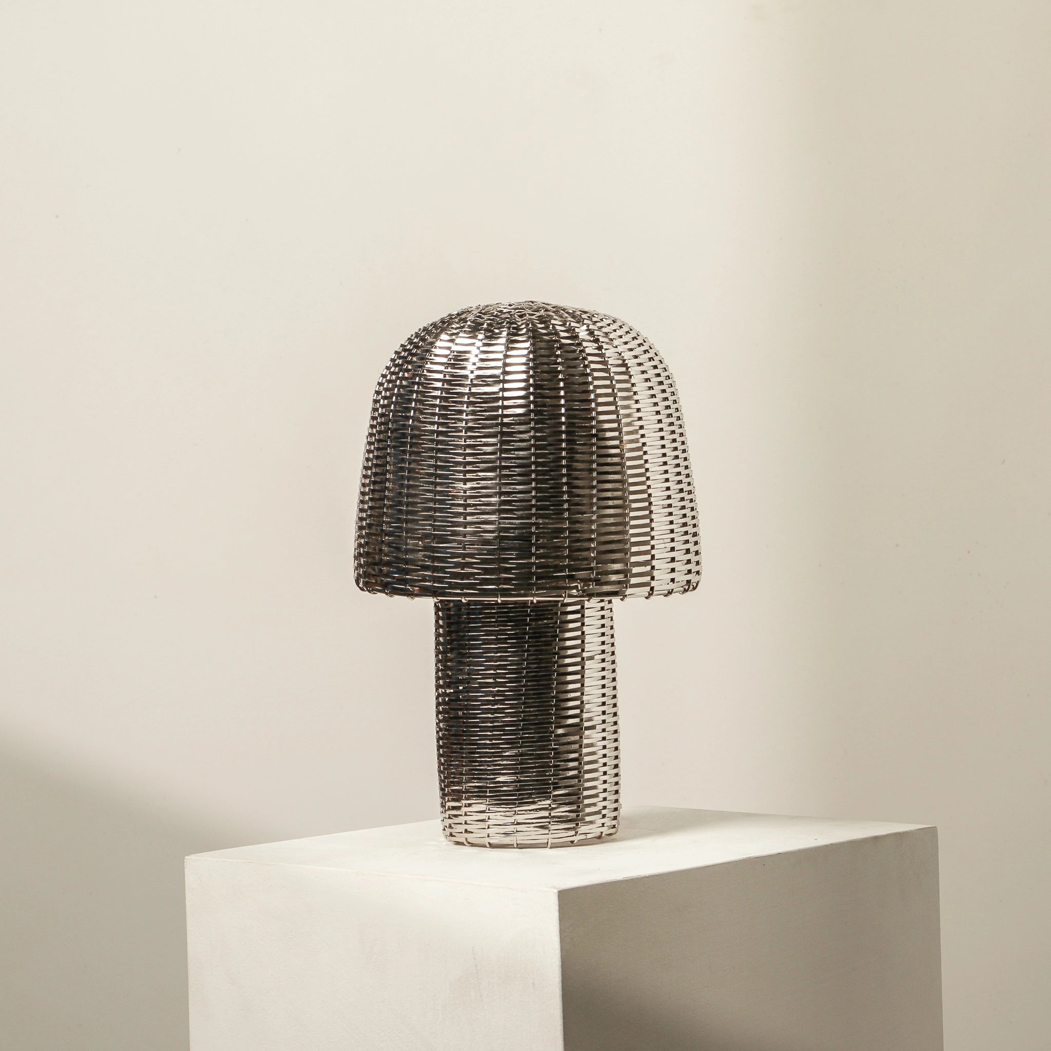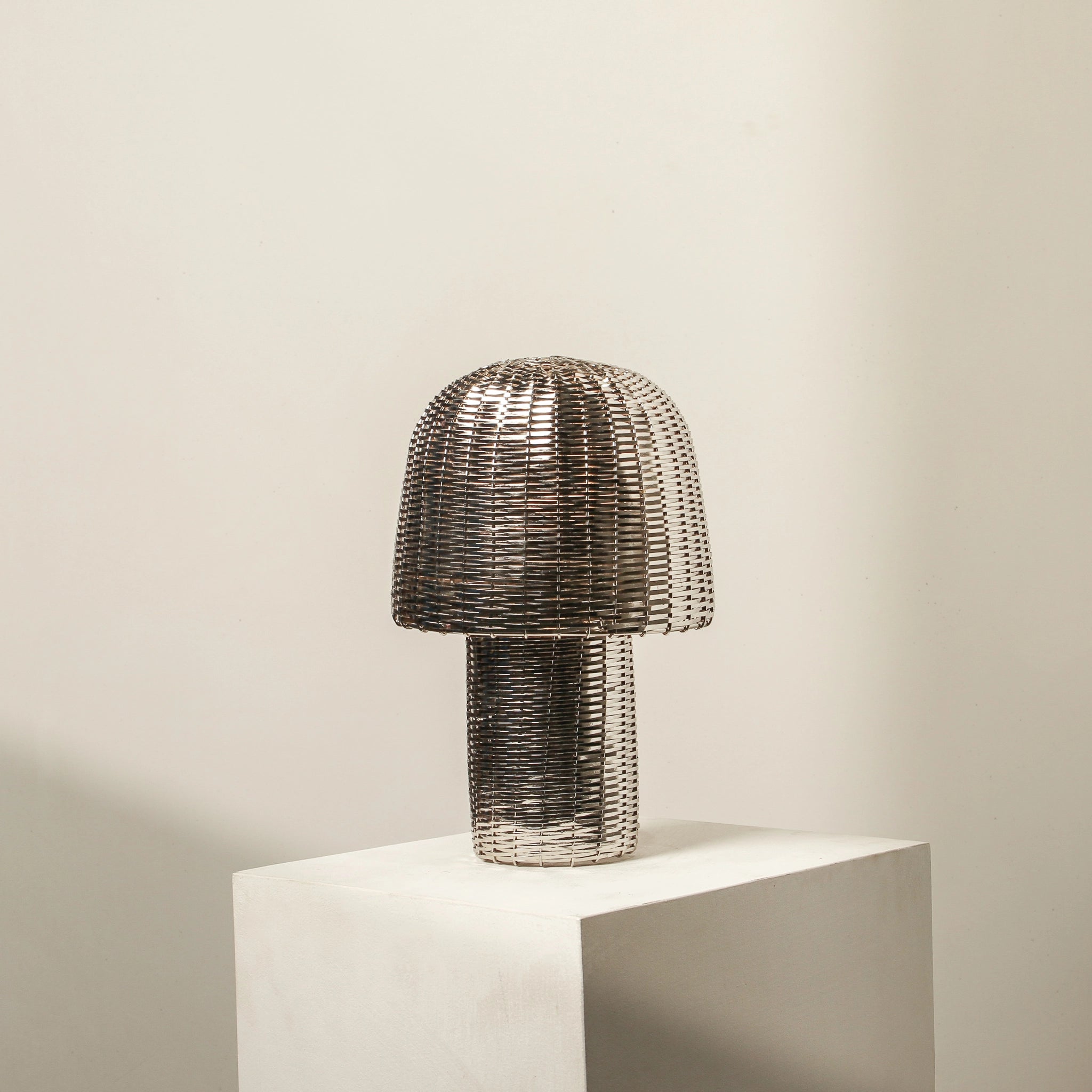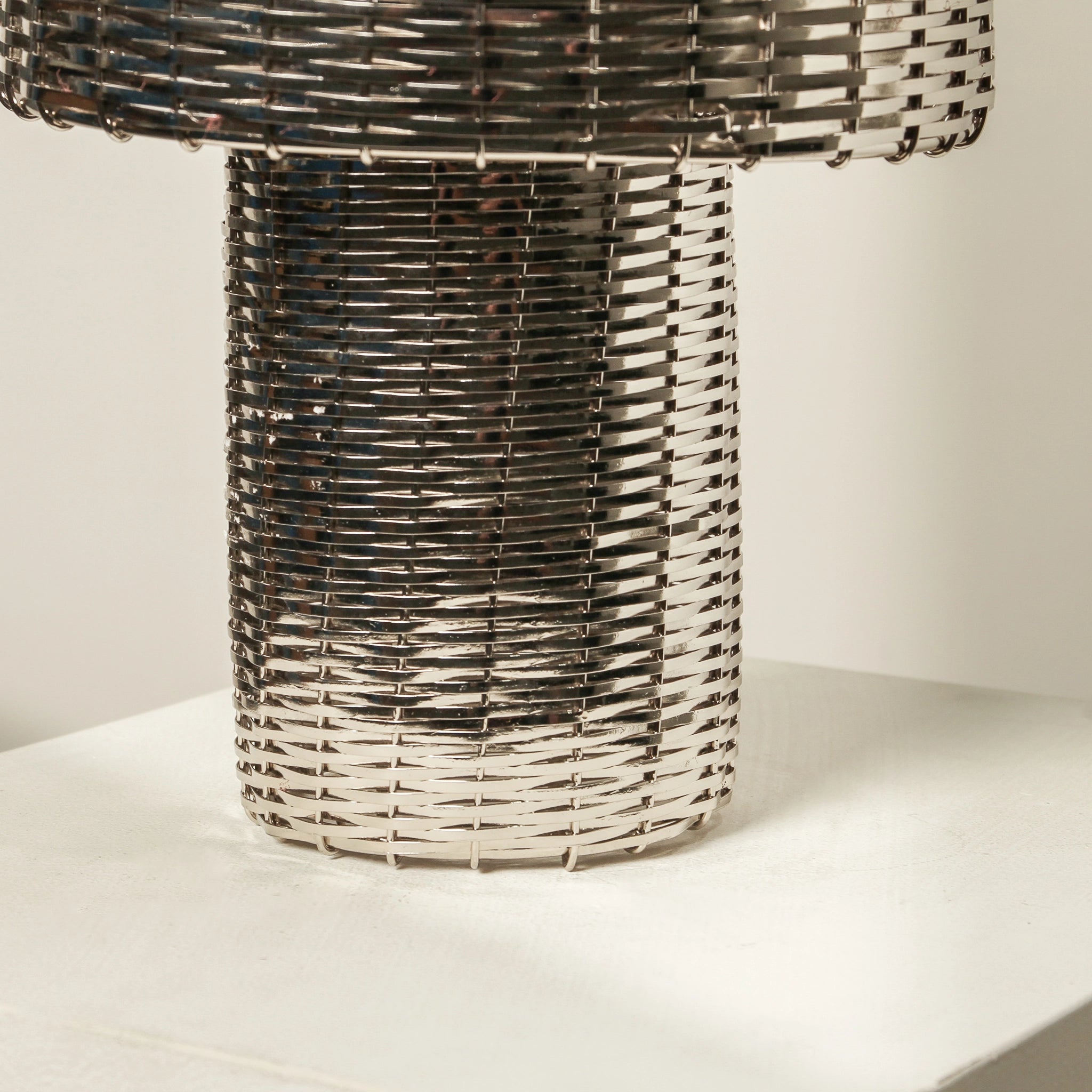 The Gild Lamp takes the timeless mushroom form and distils it down to its most delicate proportions. Crafted from iron with a brushed nickel finish, it shares the same basket-weave texture as the Solene — softly matte, quietly luminous, and rich with artisanal detail.