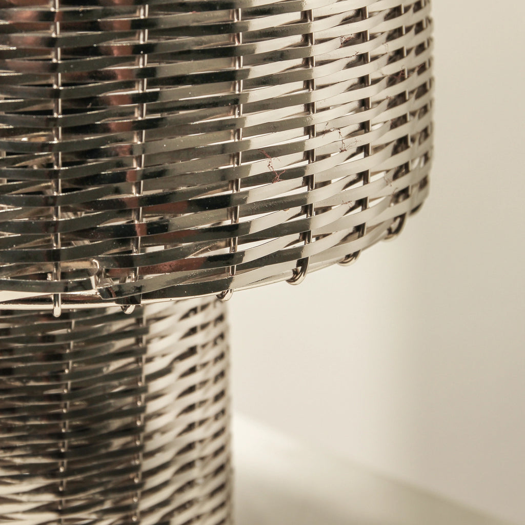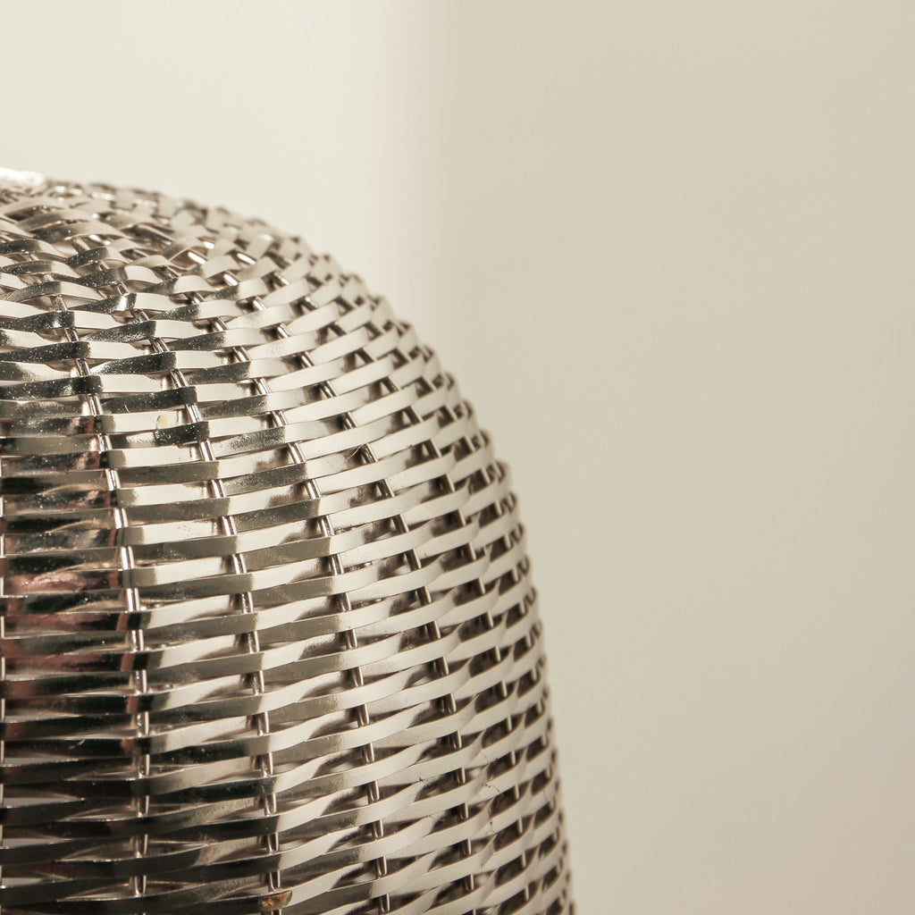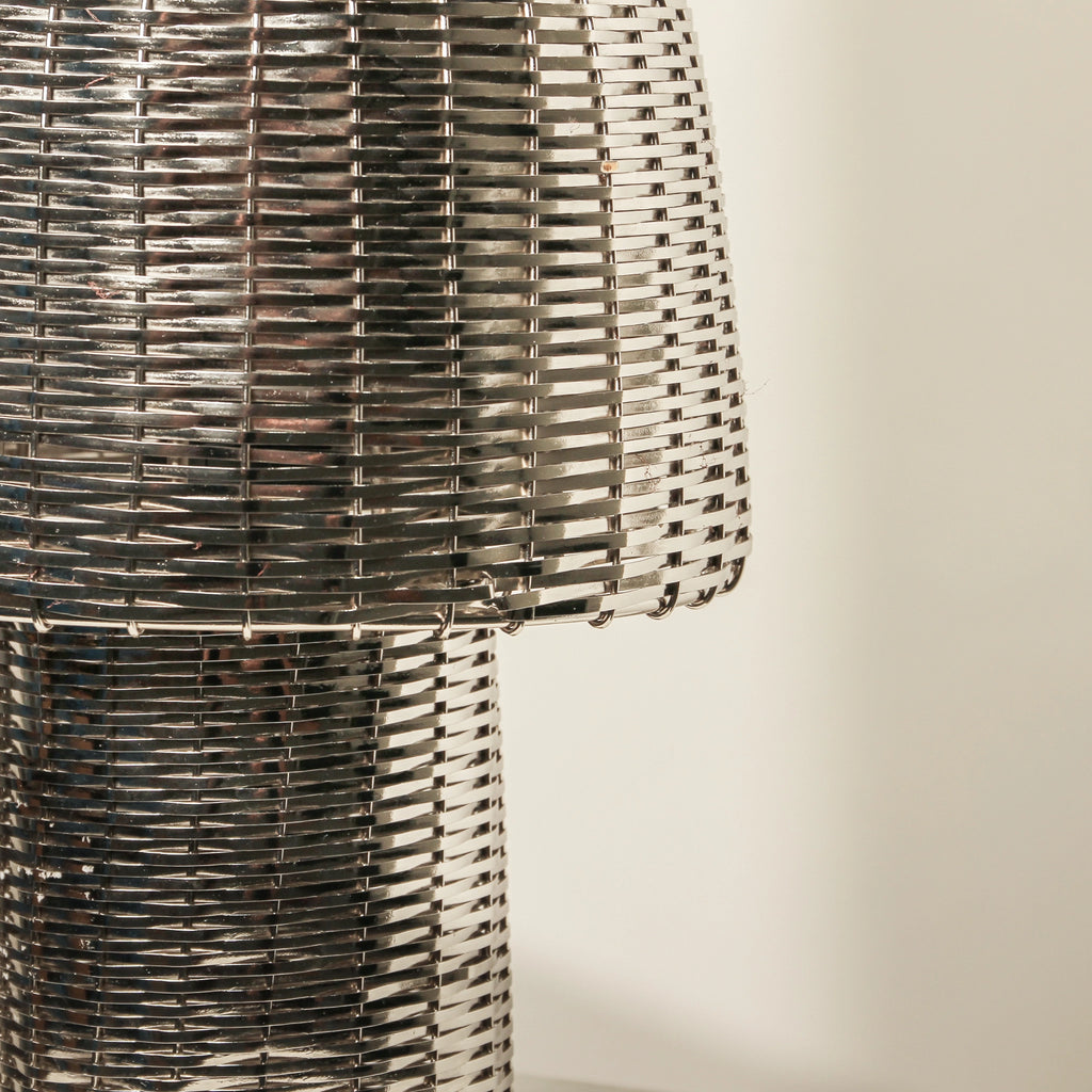 The Gild Lamp takes the timeless mushroom form and distils it down to its most delicate proportions. Crafted from iron with a brushed nickel finish, it shares the same basket-weave texture as the Solene — softly matte, quietly luminous, and rich with artisanal detail.