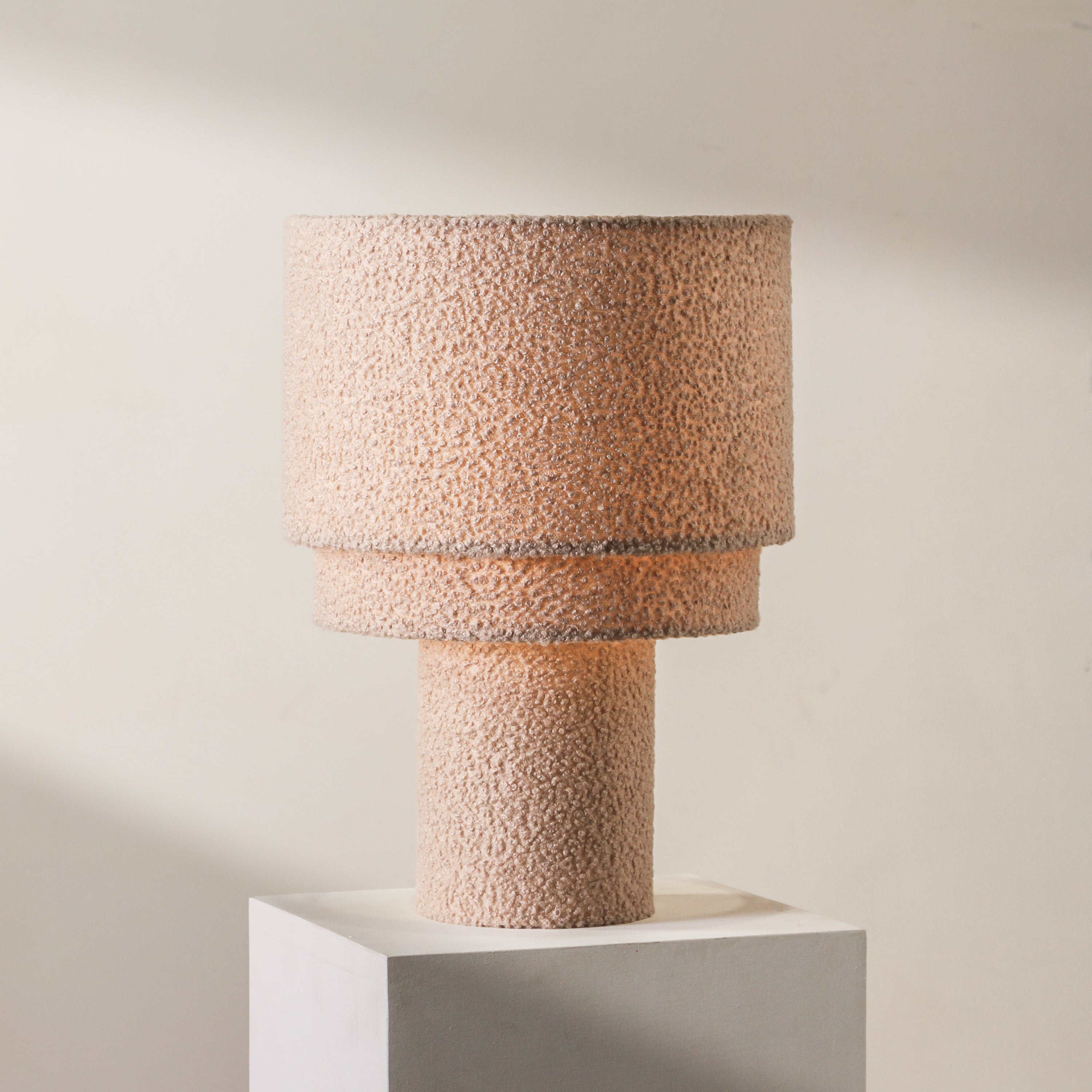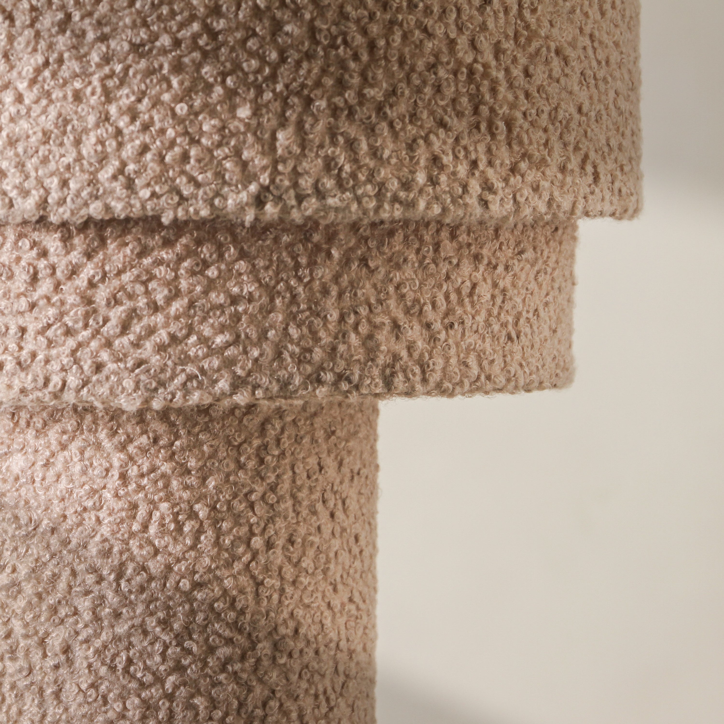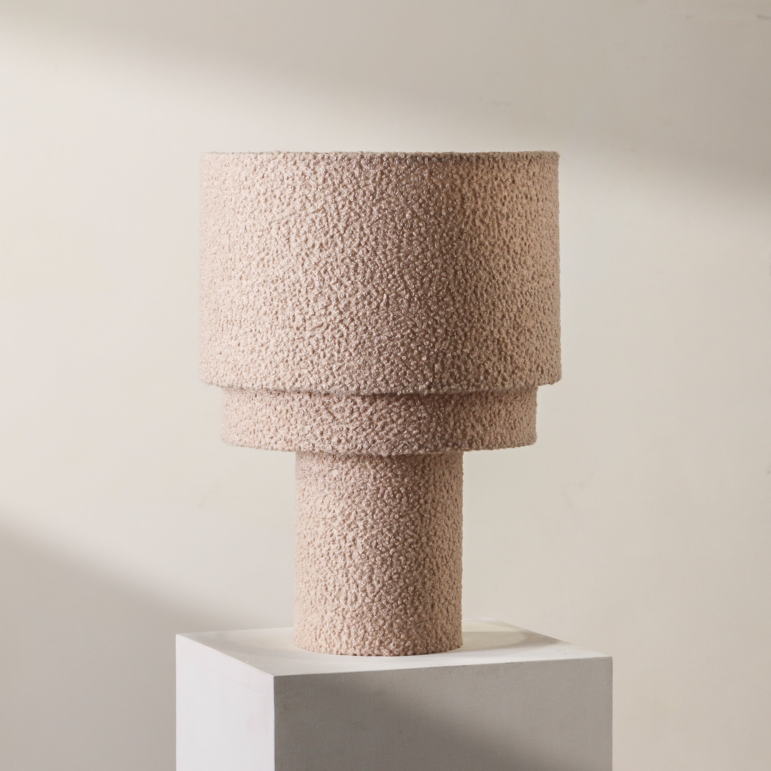 The Haze Table Lamp explores form through quiet repetition—its design composed of three cylindrical elements: a tall, sculptural base and a tiered, double-layered shade. Wrapped in a tactile bouclé fabric, the lamp’s surface invites touch, offering a soft counterpoint to its architectural structure. Available in two colourways, Sage and Beige, tones that anchor the piece in a calm, organic rhythm, echoing natural landscapes and tactile living. As part of the Tender Forms collection, Haze is a meditation on scale, softness, and silhouette. Its weighty form creates a focal point in the room, while its neutral tones offer versatility across a range of curated interiors. Place Haze where balance and grounding are needed—on a generous console, sideboard, or bedside table. Pair with natural stone, brass, or minimal ceramics to heighten the contrast between texture and restraint. Best used in interiors seeking both presence and stillness.