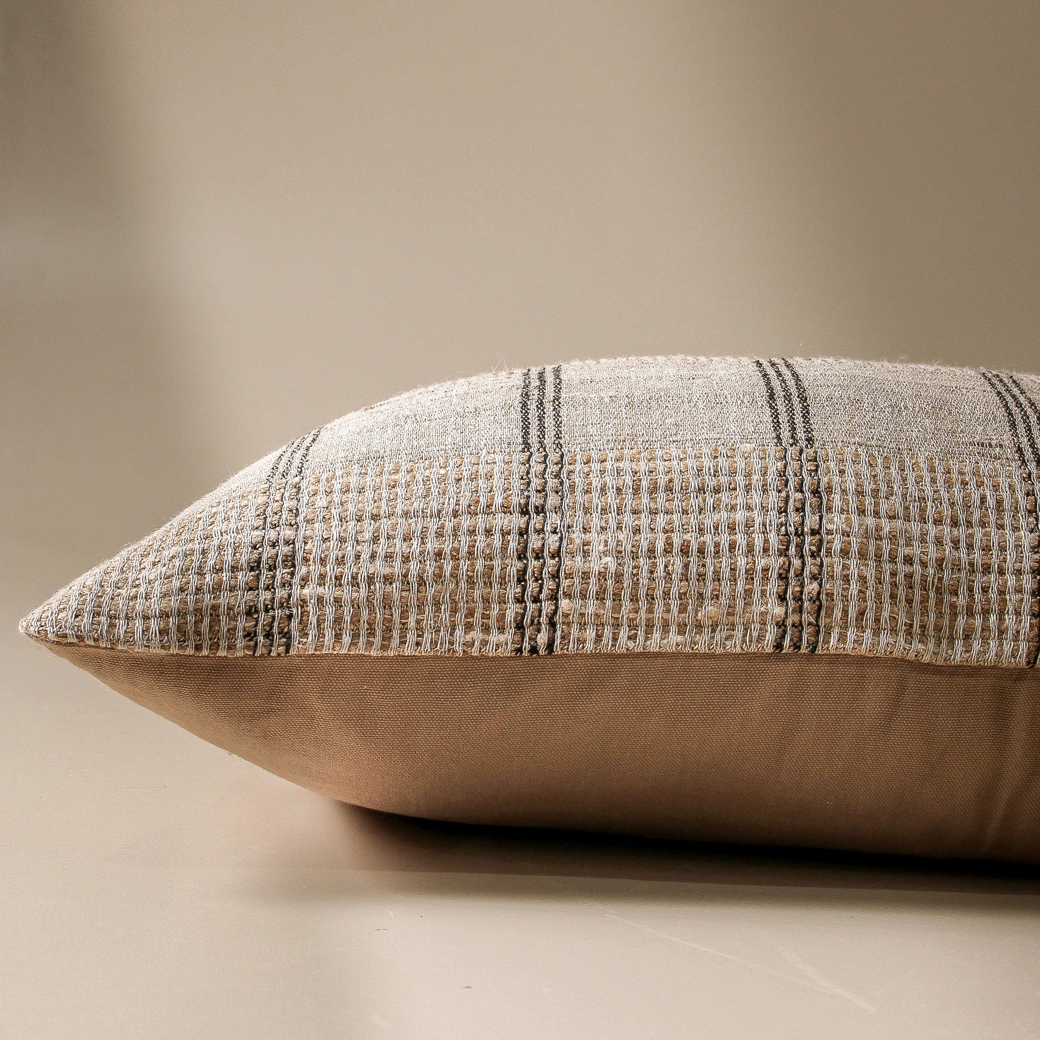 The statement, hand-loomed Husk Cushion adds style to any space with its warm, neutral tones and gentle pattern. A testament to craftsmanship and design, each item is hand-woven by artisans in India using ancient techniques. The Husk design is woven from natural wool and silk. The silk gives a natural lustre and rich, uneven texture - a result of the manufacturing process being entirely by hand. This beautiful patina improves over time as the fabric relaxes and softens with use. 65 x 40cm 60% wool, 40% silk Plain cotton reverse Hand-woven in India Includes a plush feather insert (Responsible Down Standard Certified)