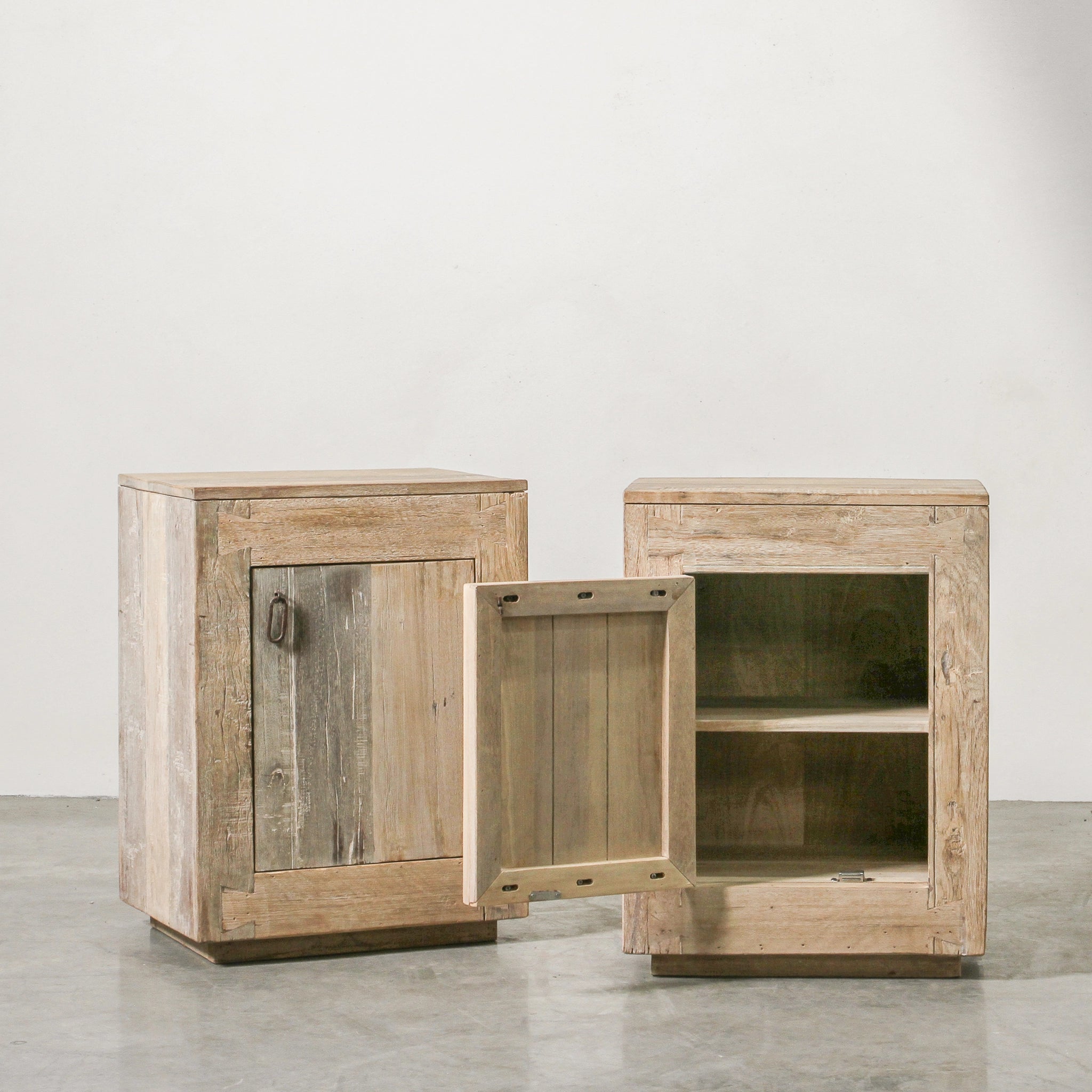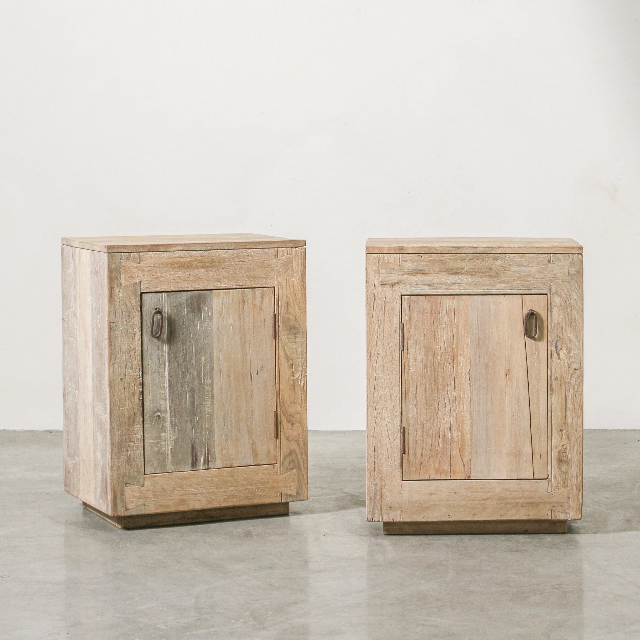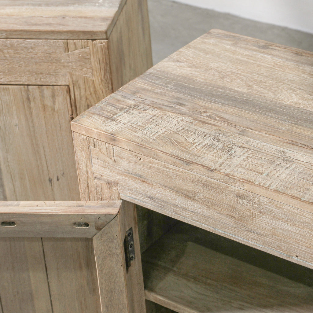Designed to bring depth and story to your home, this pair of bedside tables is handcrafted from reclaimed teak and finished in a soft bleached tone. Newly made but full of character, each carries the natural variation of aged wood, offering warmth and texture. Balanced in design and practical in scale, they make ideal companions beside the bed or as accent cabinets in living spaces.