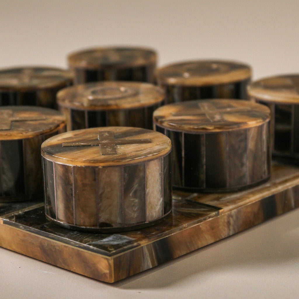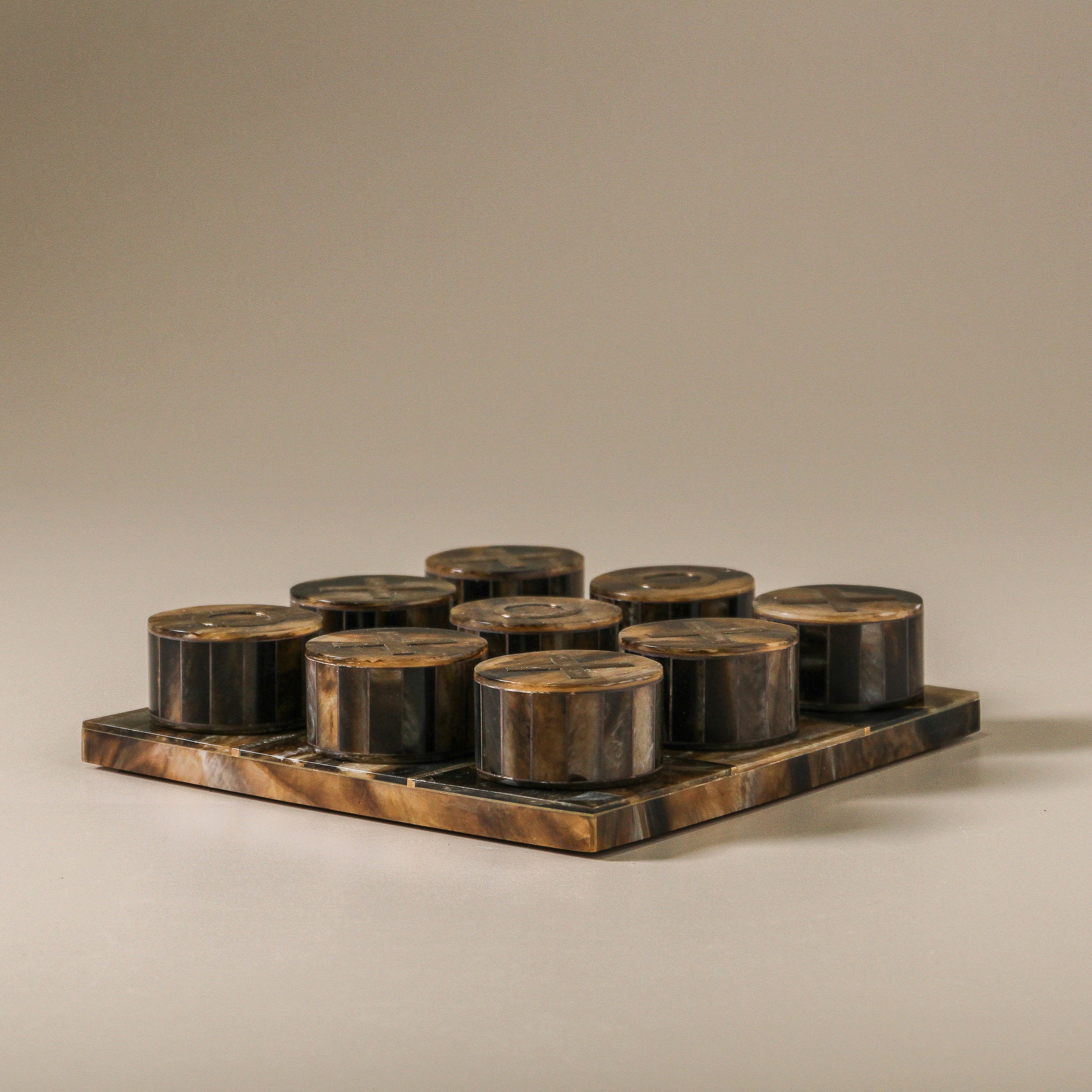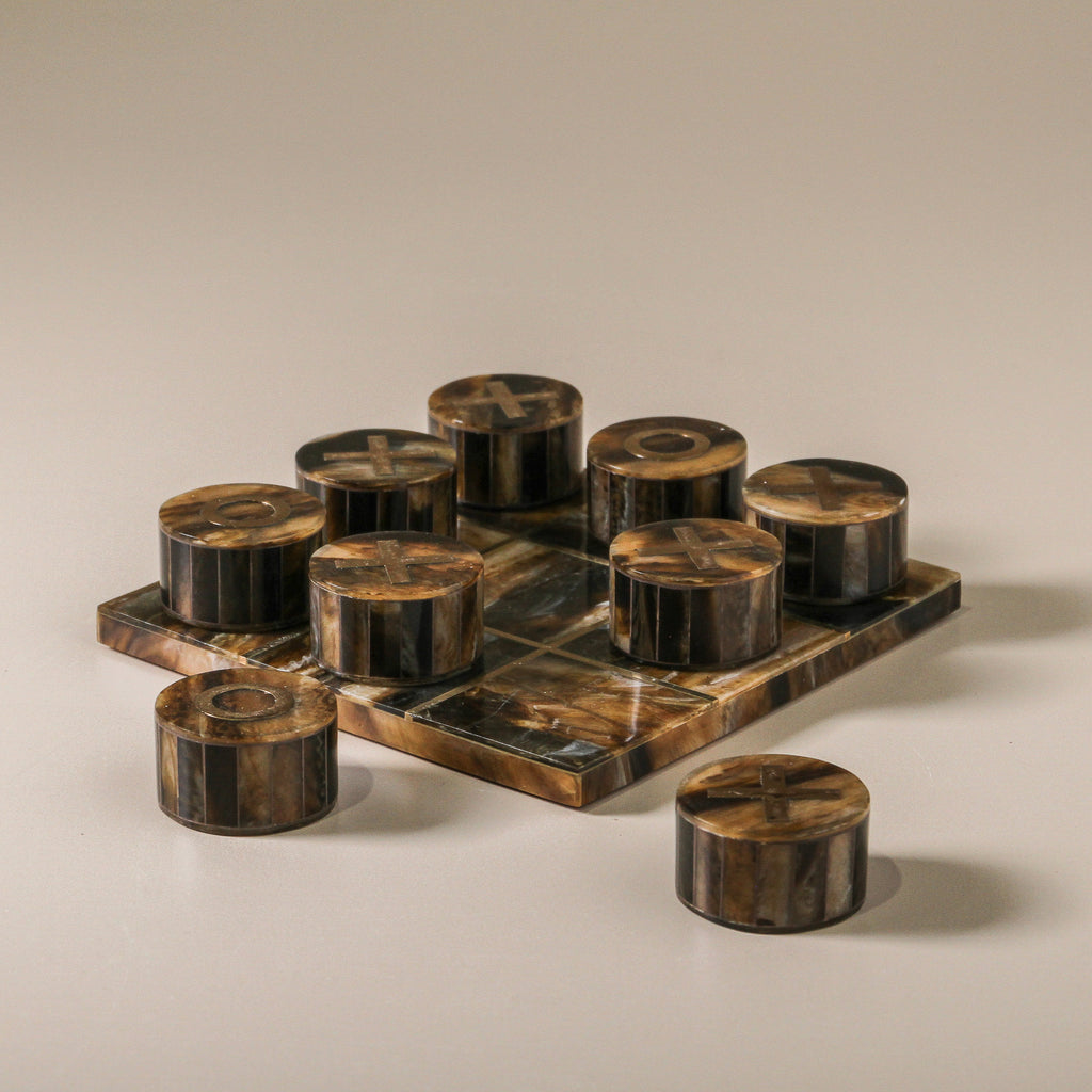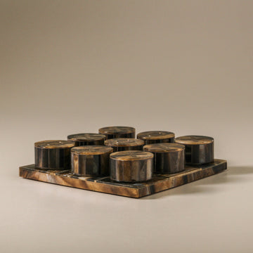 There’s a playfulness to the Jasper Tic Tac Toe Game—lighthearted yet grounded in craftsmanship. Handcrafted from resin and inlaid brass, each piece is rich with character, its surface a swirl of warm tones and subtle variation. The Xs and Os feel sculptural in the hand, weighty and smooth, inviting touch as much as play.