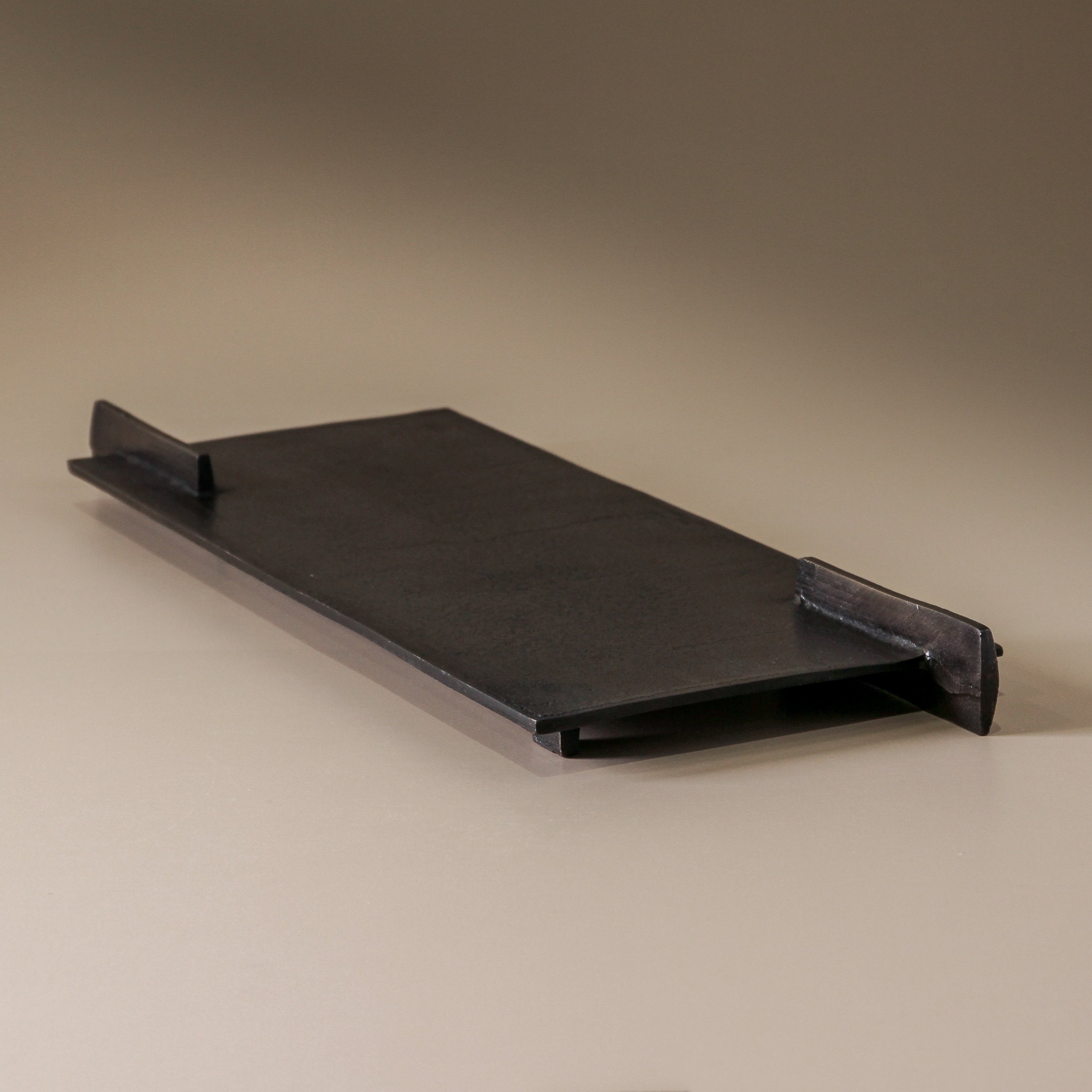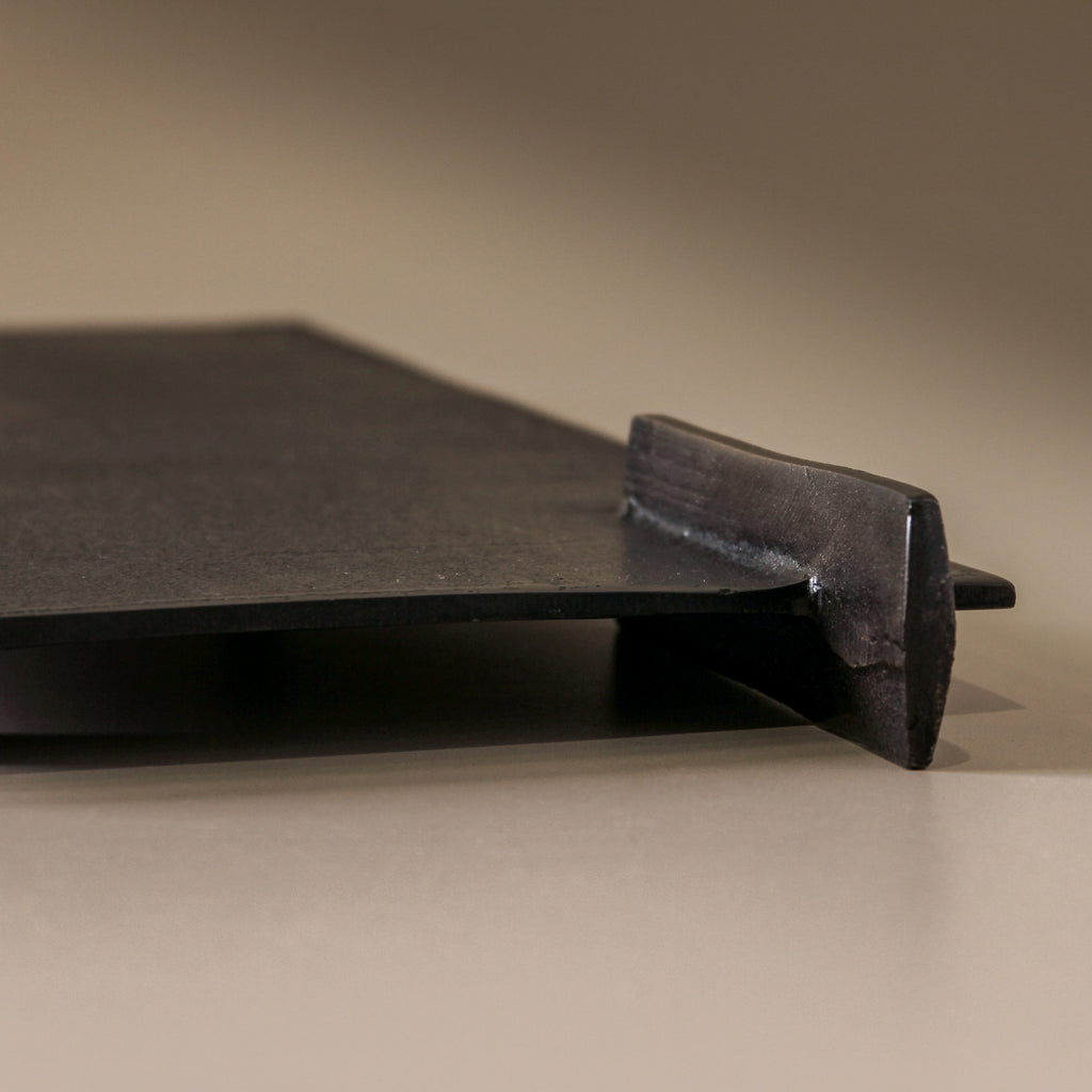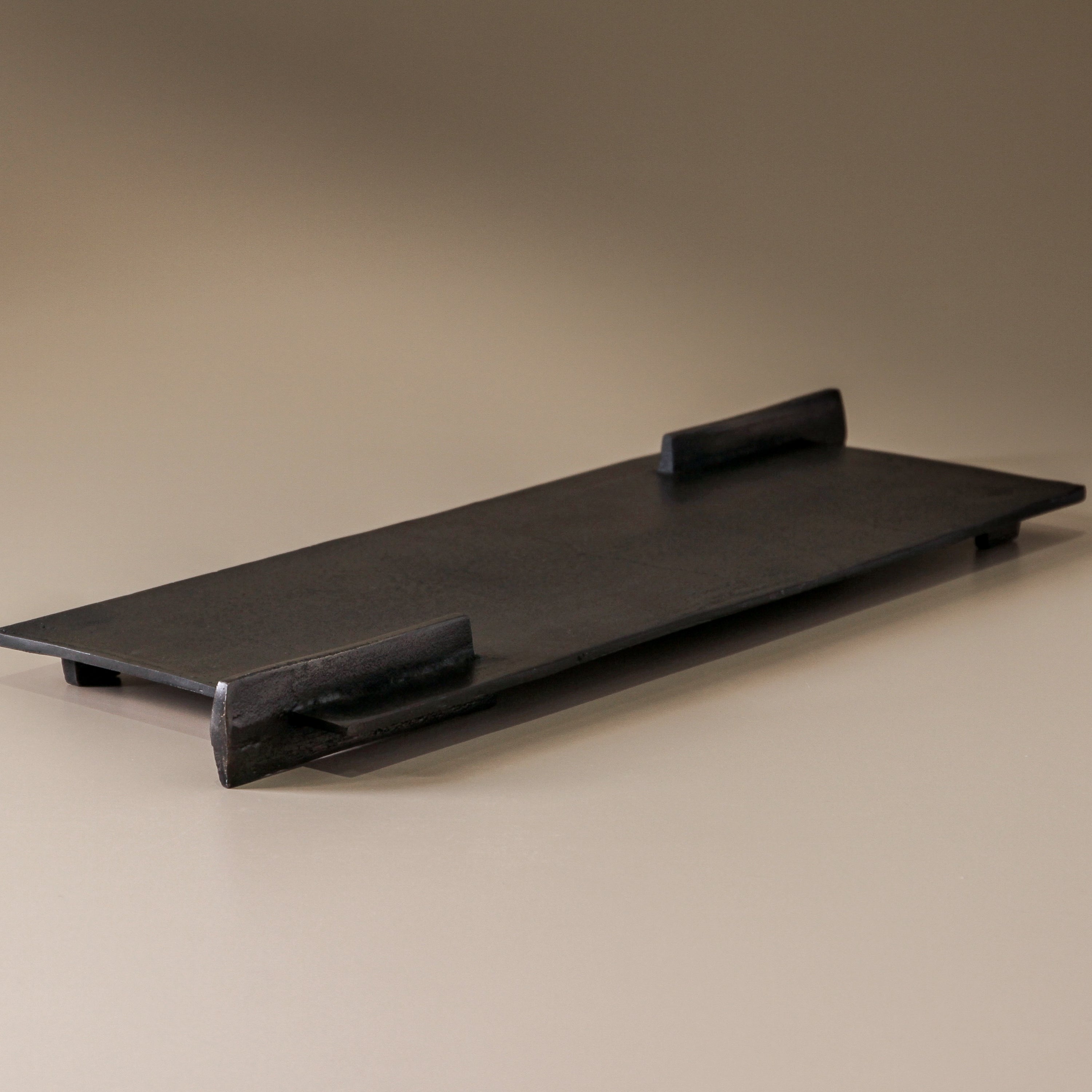 Minimalist yet considered, the Kindle Tray is an elongated rectangle with sharp, sculptural edges. Its slender handles are seamlessly integrated into the form, giving it a purposeful silhouette that feels architectural rather than ornamental. The black brass finish adds weight and grounding, while its simplicity allows it to adapt to any setting. Perfect as a base for styling—layer with books, a candle, or a single vessel. Use it on a coffee table, console, or shelf where its quiet strength can anchor softer elements.