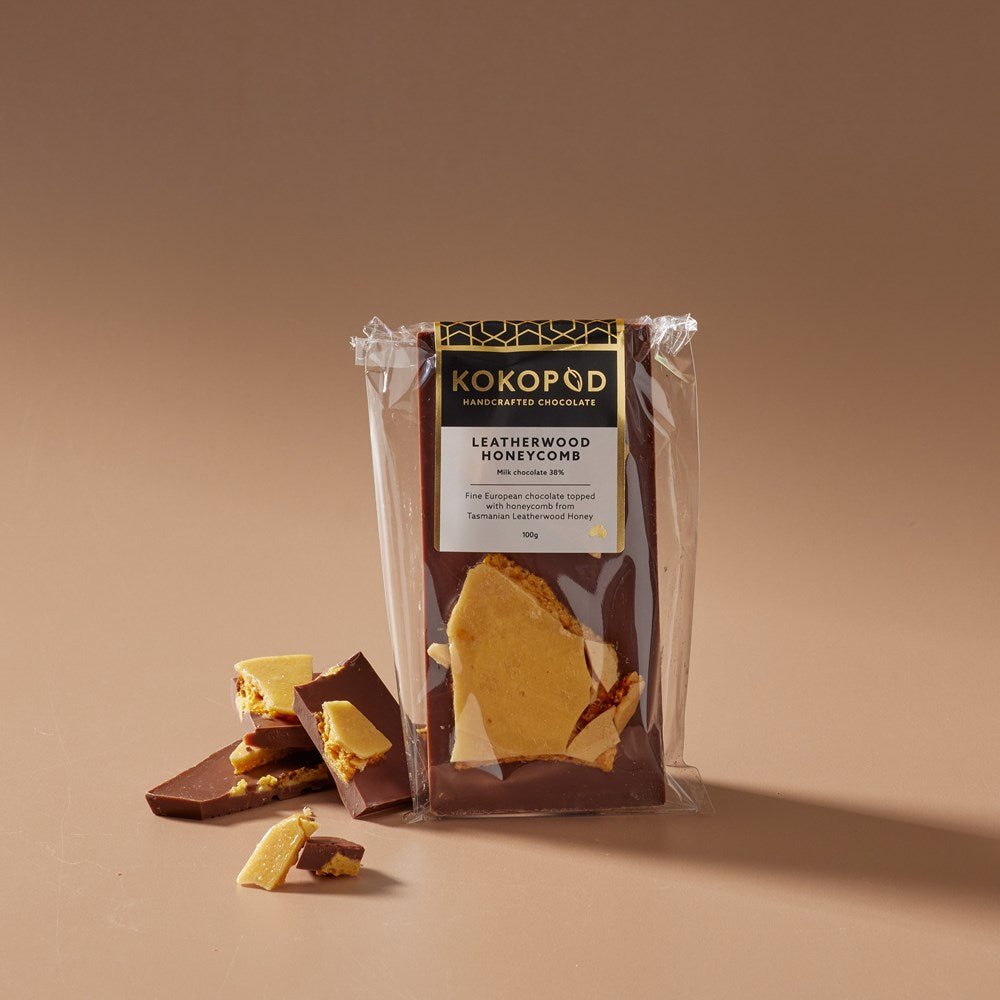 Kokopod Chocolate Blocks only the finest ingredients. European couverture chocolate with superior ingredients sourced from regional Australia to create unique and refined flavours. Fine European chocolate topped with honeycomb from Tasmanian Leatherwood Honey