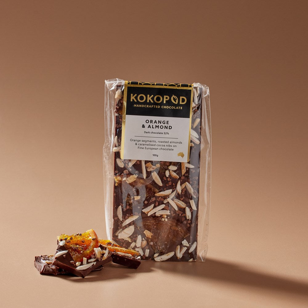 Kokopod Chocolate Blocks only the finest ingredients. European couverture chocolate with superior ingredients sourced from regional Australia to create unique and refined flavours. Orange segments, roasted almonds & caramelised cocoa nibs on Fine European chocolate