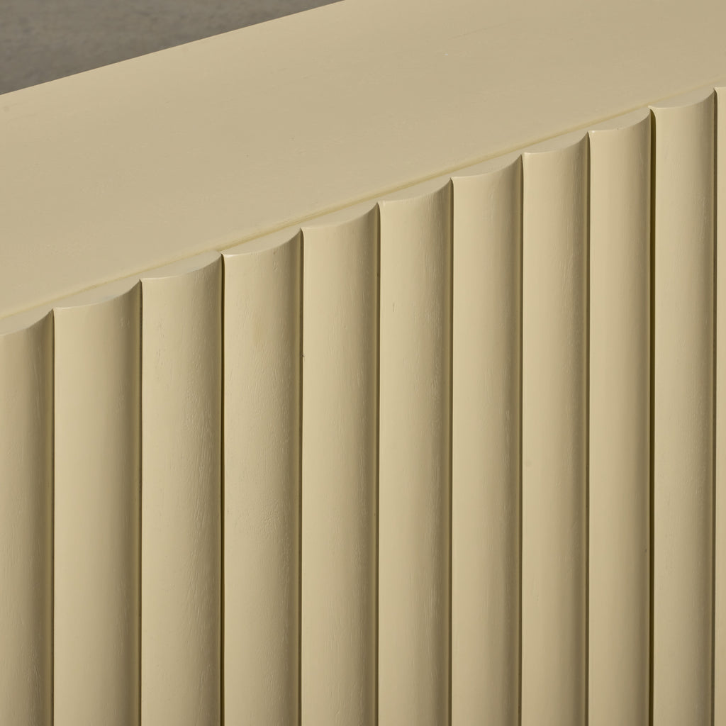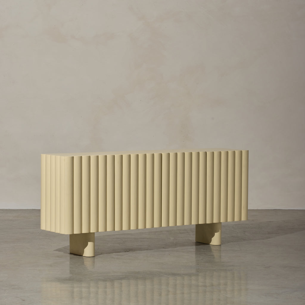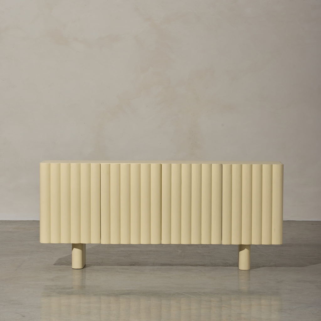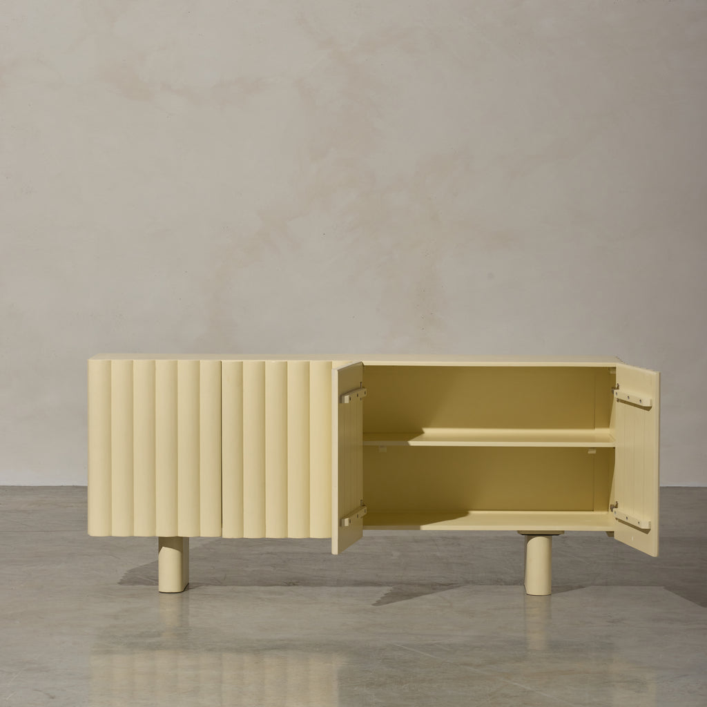 Introducing our latest addition to the collection, the Lief Sideboard, a blend of retro-inspired design and modern silhouette. Crafted from high-quality timber, this sideboard features distinctive linear battened front panels that add depth and softness to its appearance. The Lief Sideboard comes in a buttery yellow finish, injecting a nostalgic yet sophisticated touch to any space. Its bold hue brings a sense of warmth and vibrancy, instantly uplifting the ambiance of the room. With its retro-inspired design and practical storage solutions, the Lief Sideboard is the perfect choice for those who appreciate fine craftsmanship and innovative design with a slight nod to the past. Stylist's tip: consider incorporating vintage or retro accents to complement its aesthetic. Look for mid-century modern decor pieces like ceramic planters, glass vases, or retro-inspired table lamps.