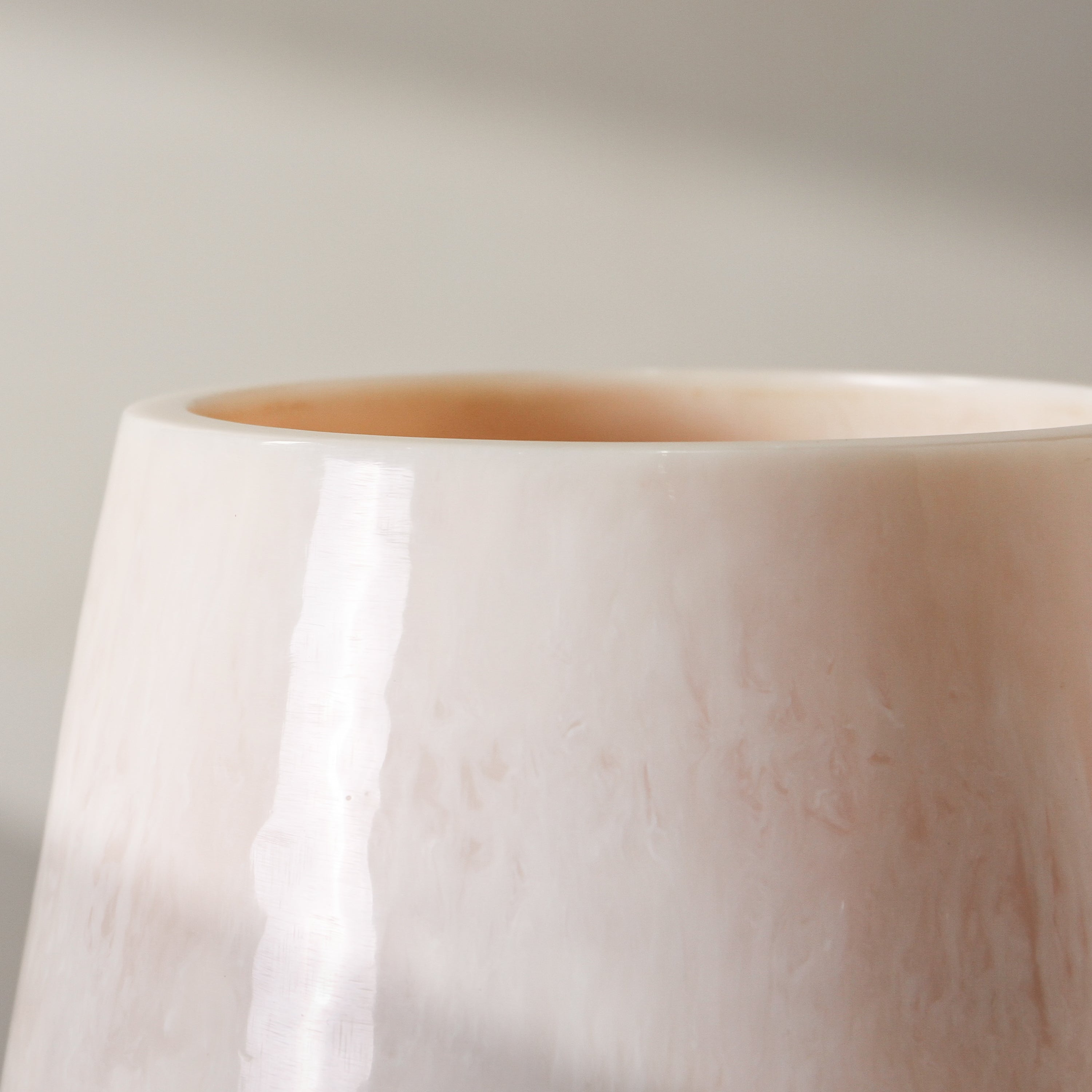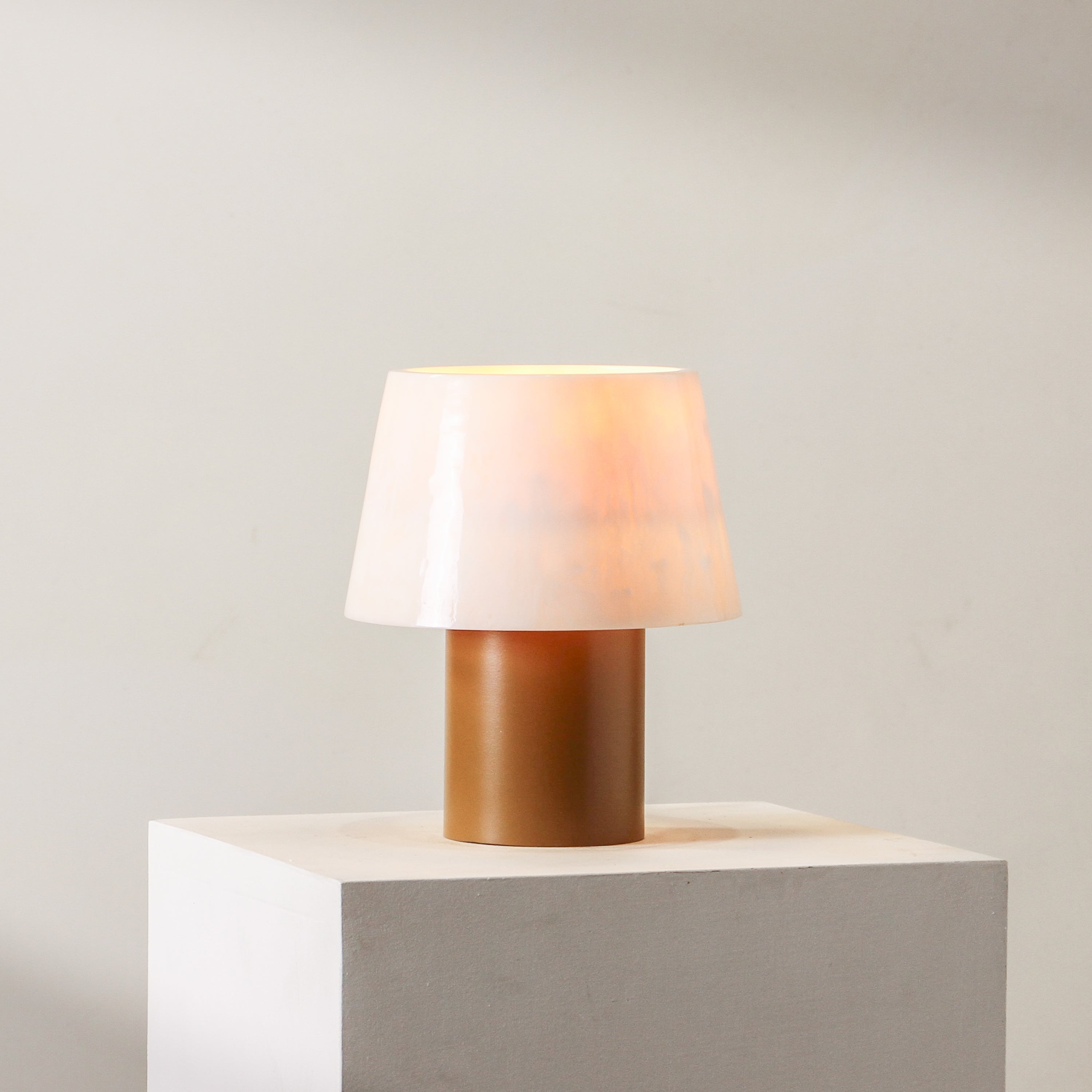 Part of the Tender Forms collection, the Liora Table Lamp explores proportion through contrast. Its low, cylindrical form is grounded by a rounded metal base in a warm caramel tone, paired with a subtly tapered resin shade in soft, milky hues. The combination of matte and gloss finishes creates a quiet interplay of texture, while the compact, sculptural shape offers a sense of grounded simplicity. With its short and deliberate silhouette, Liora brings scale and warmth to intimate spaces—ideal for bedside tables, shelves, or reading corners. This is a piece that adds dimension without excess, offering both functional light and visual rhythm to the room.