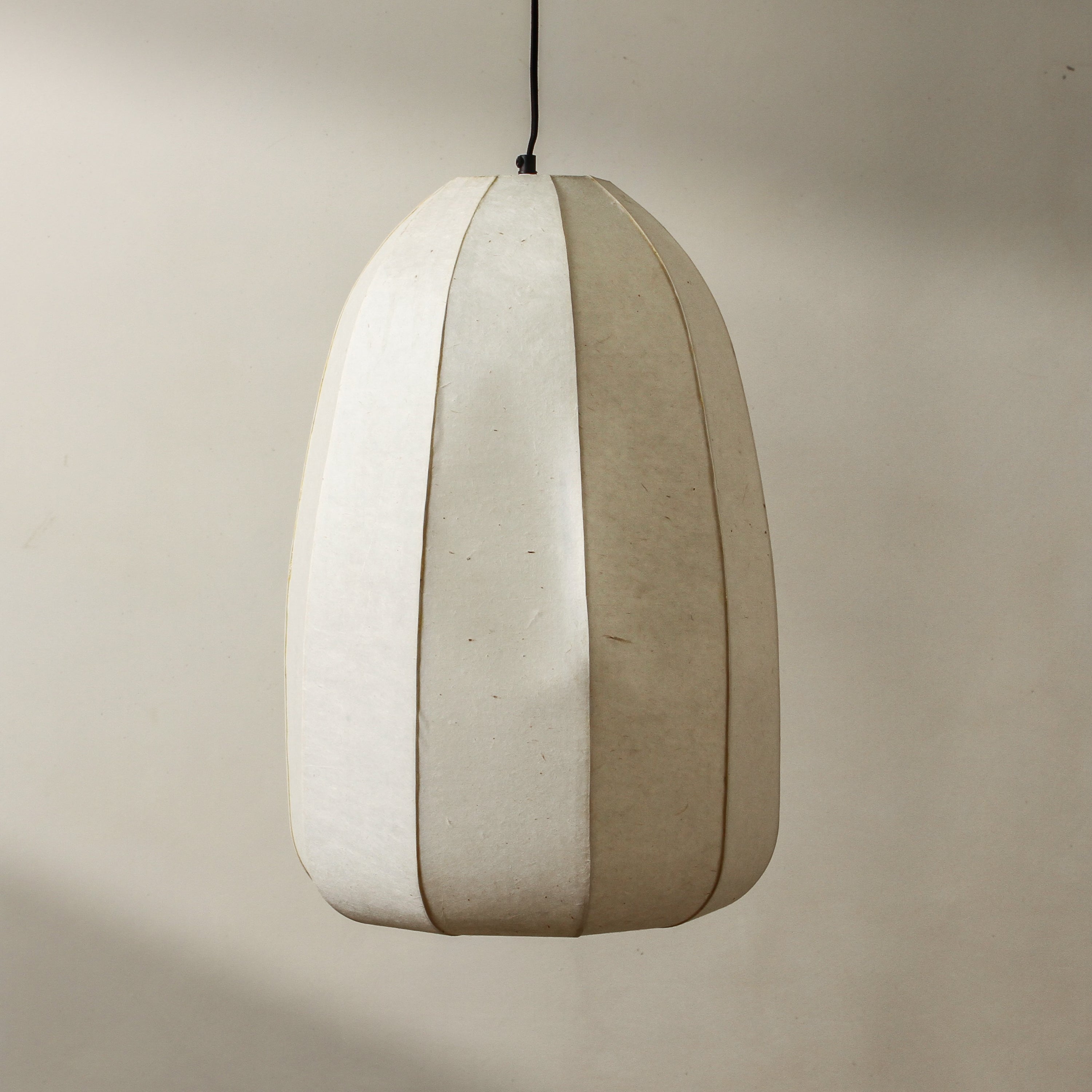 Elongated and arched like a bell caught in motion, the Lumen Pendant plays with proportion and light. Its semi-sheer paper shade radiates a warm, diffused glow, while its form adds vertical elegance to a space. Hang two over bedside tables, cluster above a dining table, or let it shine alone in a hallway.