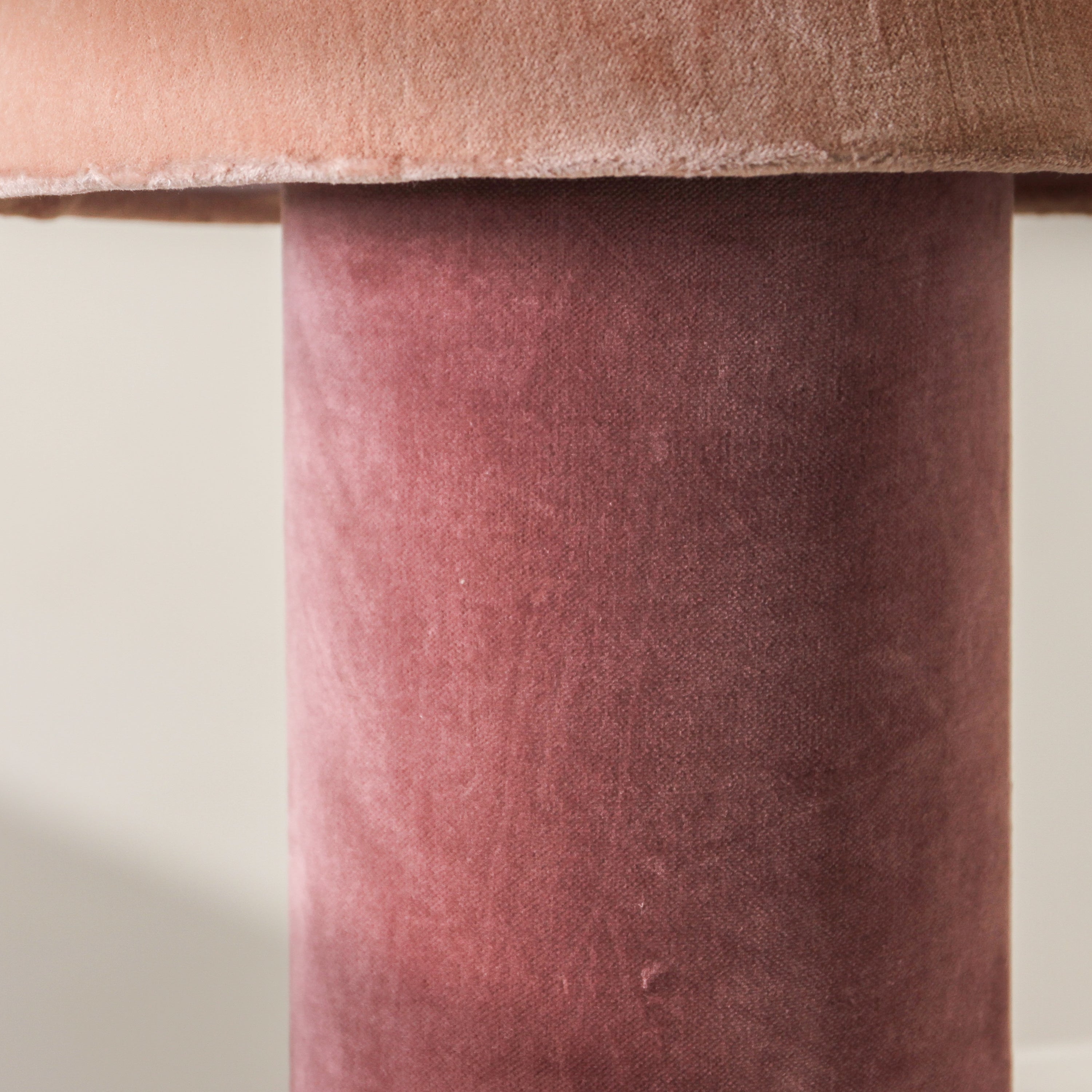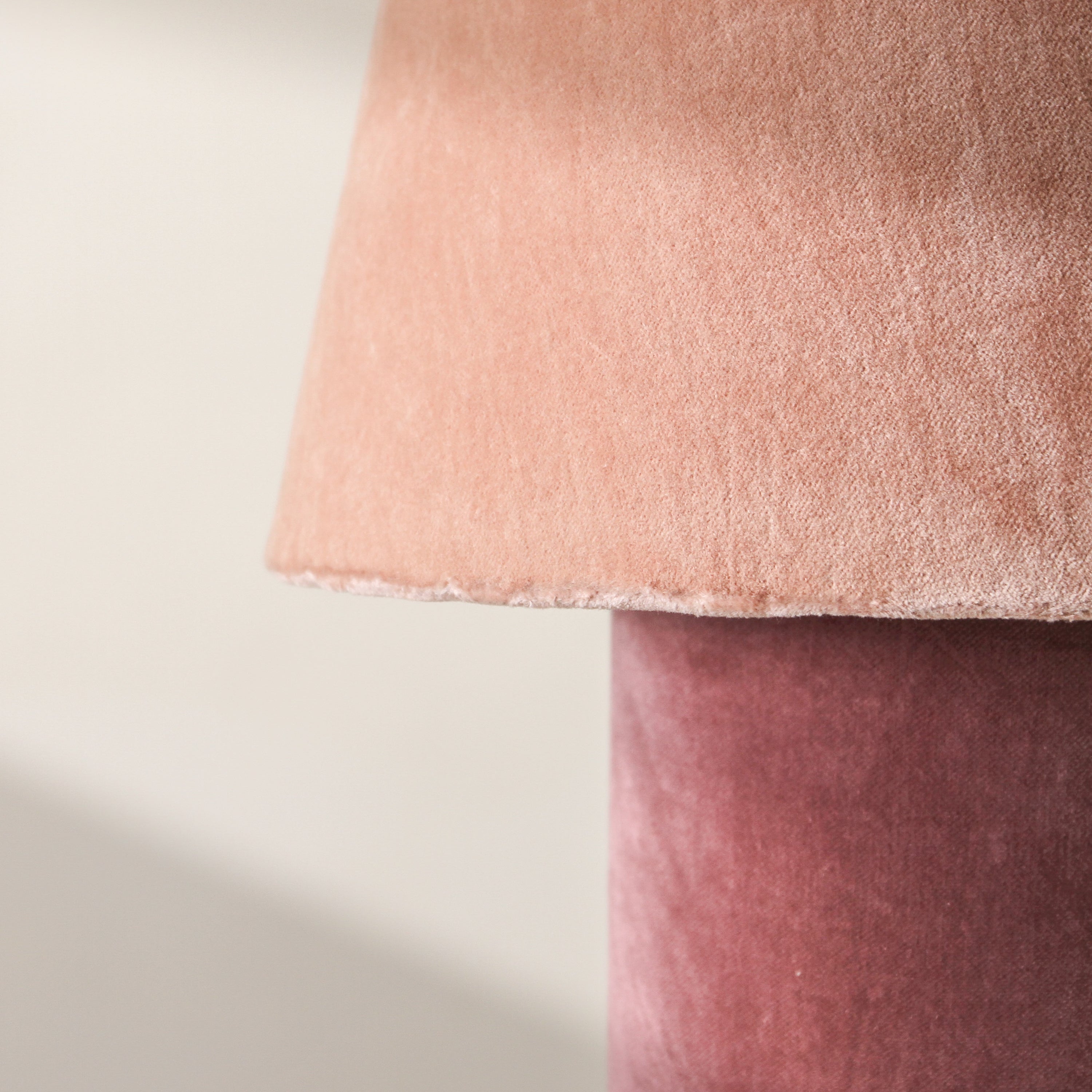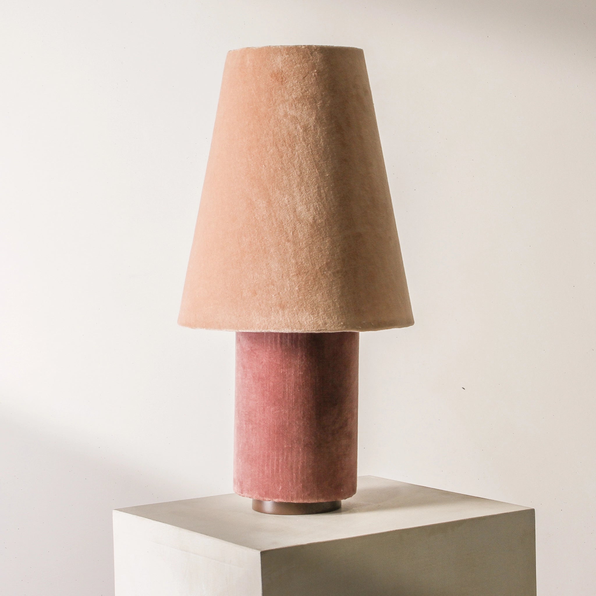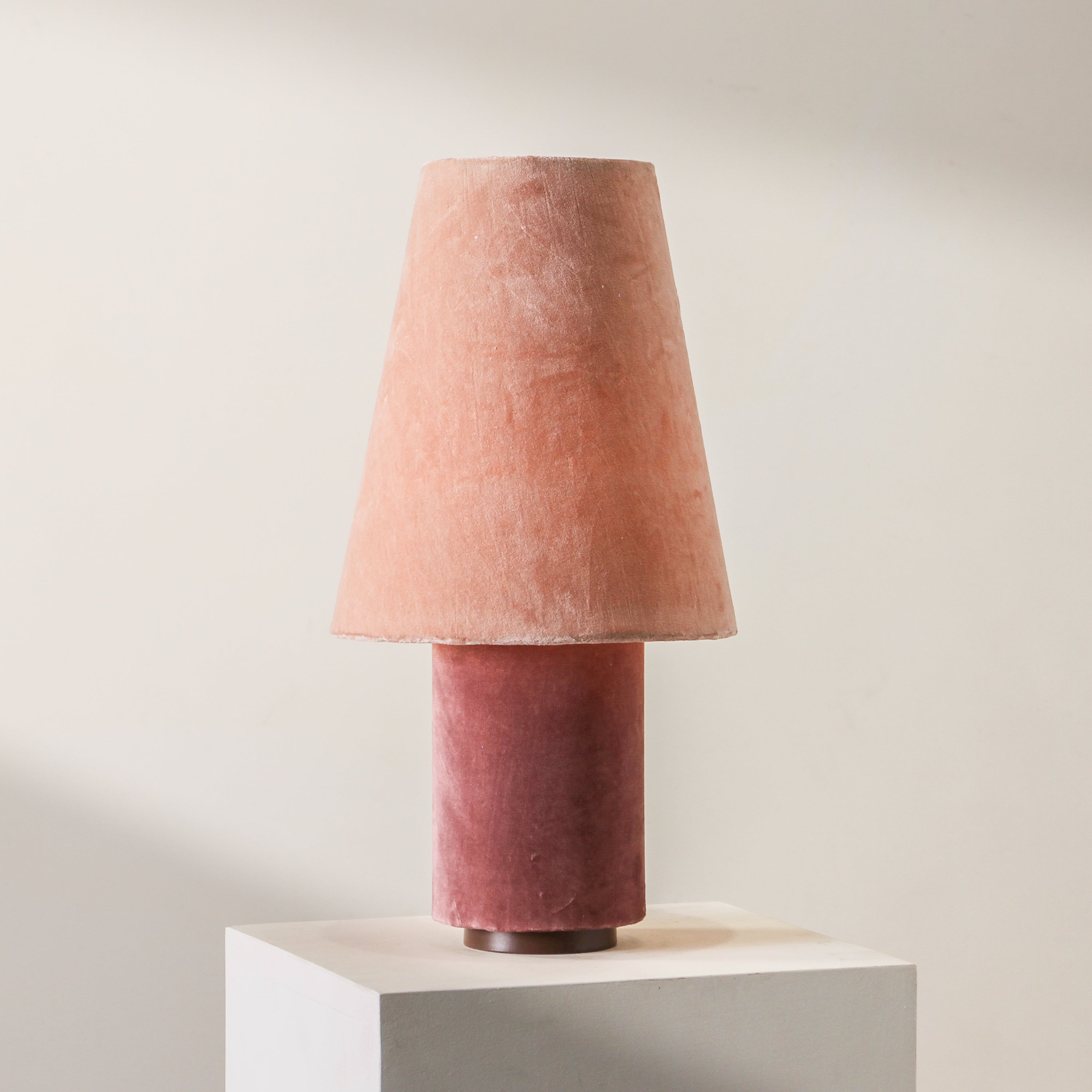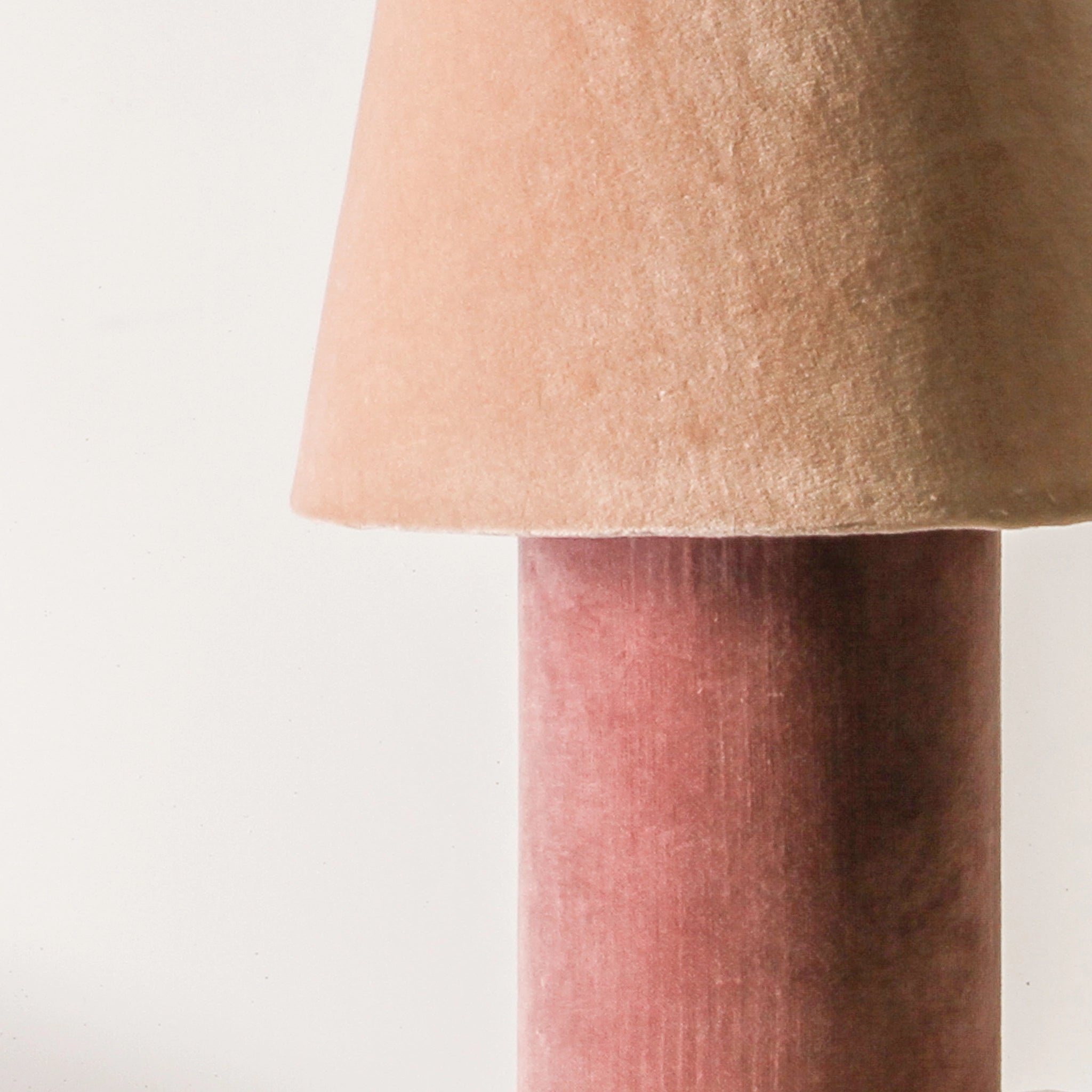 Elegant and vertical, the Lumen Table Lamp plays with height and material contrast. The velvet base, in muted mauve, offers a gentle sheen and solid foundation. Its shade tapers upward in dusty pink velvet—elongated and narrow, creating a sense of movement and lift. This vertical emphasis gives the lamp a quiet elegance while remaining grounded in material richness. Designed as part of the Tender Forms collection, Lumen is a light sculpture—meant to draw the eye and anchor a space through texture, colour, and scale. Position it on a console or sideboard with layered books, brushed metals, or natural stone. Works beautifully where vertical space needs rhythm or visual lift.