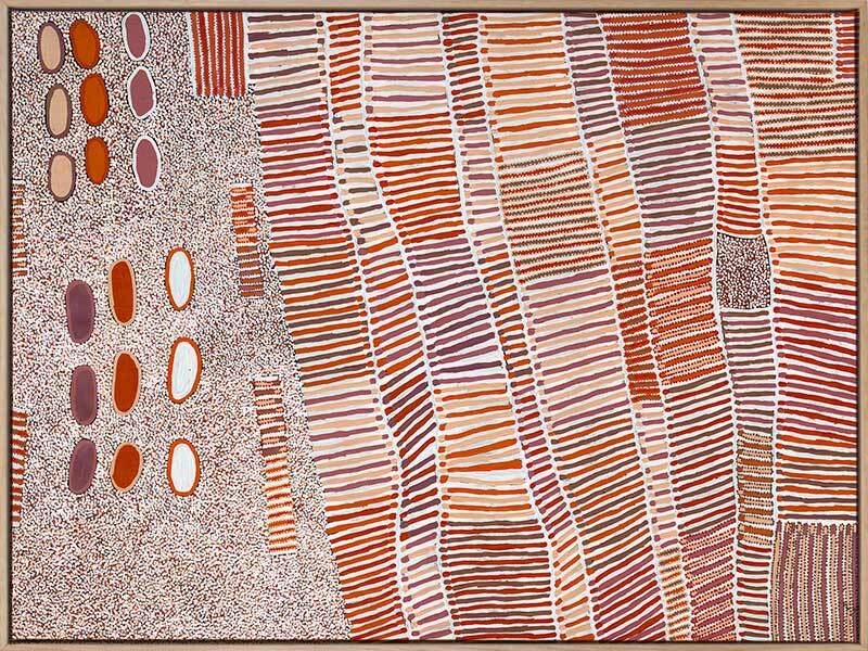 Helen Reed has painted a Jukurrpa (dreaming) related to water. This story is associated to a rock-hole site, Lupul south of Kintore. The Jukurrpa tells the story of the rainbow serpent travelling through the country creating large storms, with the storms the land flourishes creating the flora and fauna.