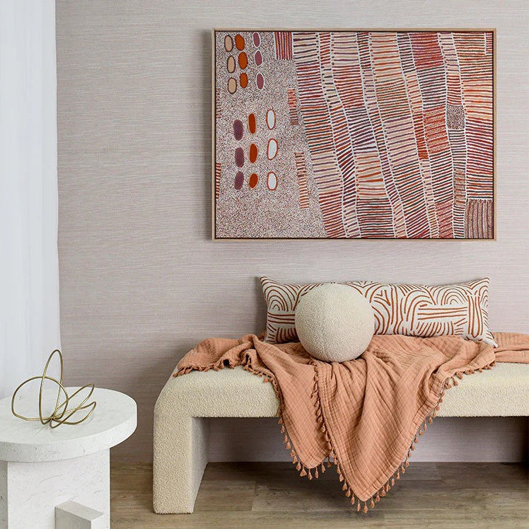 Lupul Jukurrpa Red Canvas Art Print - An eye-catching array of straight lines and oval shapes make this a unique Indigenous Aboriginal artwork piece to liven up any wall. An energetic, rich palette of purple, pink, yellow and red-orange are set off by the intricate dot painting in the lower half. A contemporary take on nature and its many complexities.