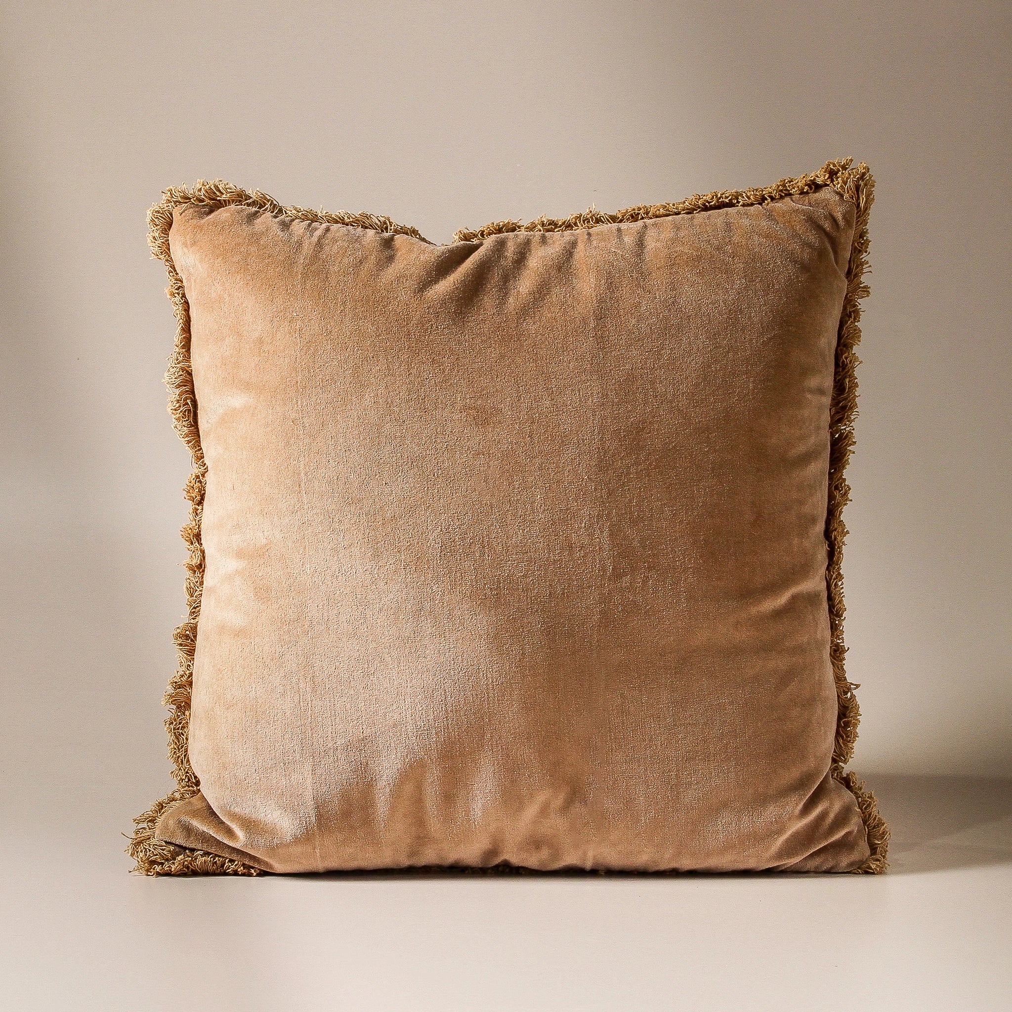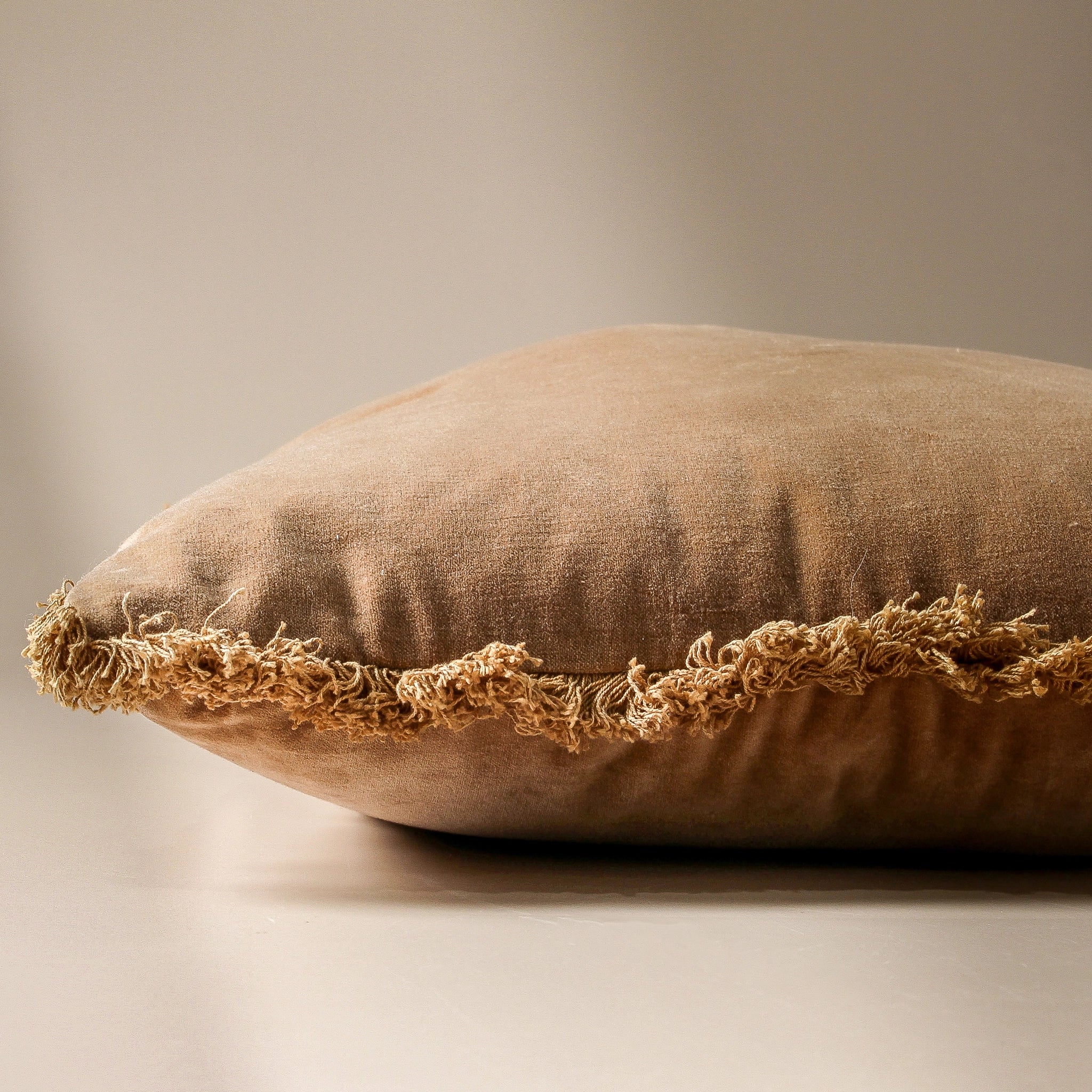 A cotton velvet cushion with gentle fringing that brings the warmth of terracotta earth into contemporary interiors. Handcrafted in India, the Matilda's plush velvet surface catches light like brushed clay, while delicate cotton fringe adds textural movement that softens modern edges. This is the kind of piece that grounds a minimalist sofa with organic warmth, or layers beautifully against crisp linen for studied contrast. The removable cover speaks to modern living, while the dacron fill maintains its sculptural form through countless evenings curled into favourite corners.