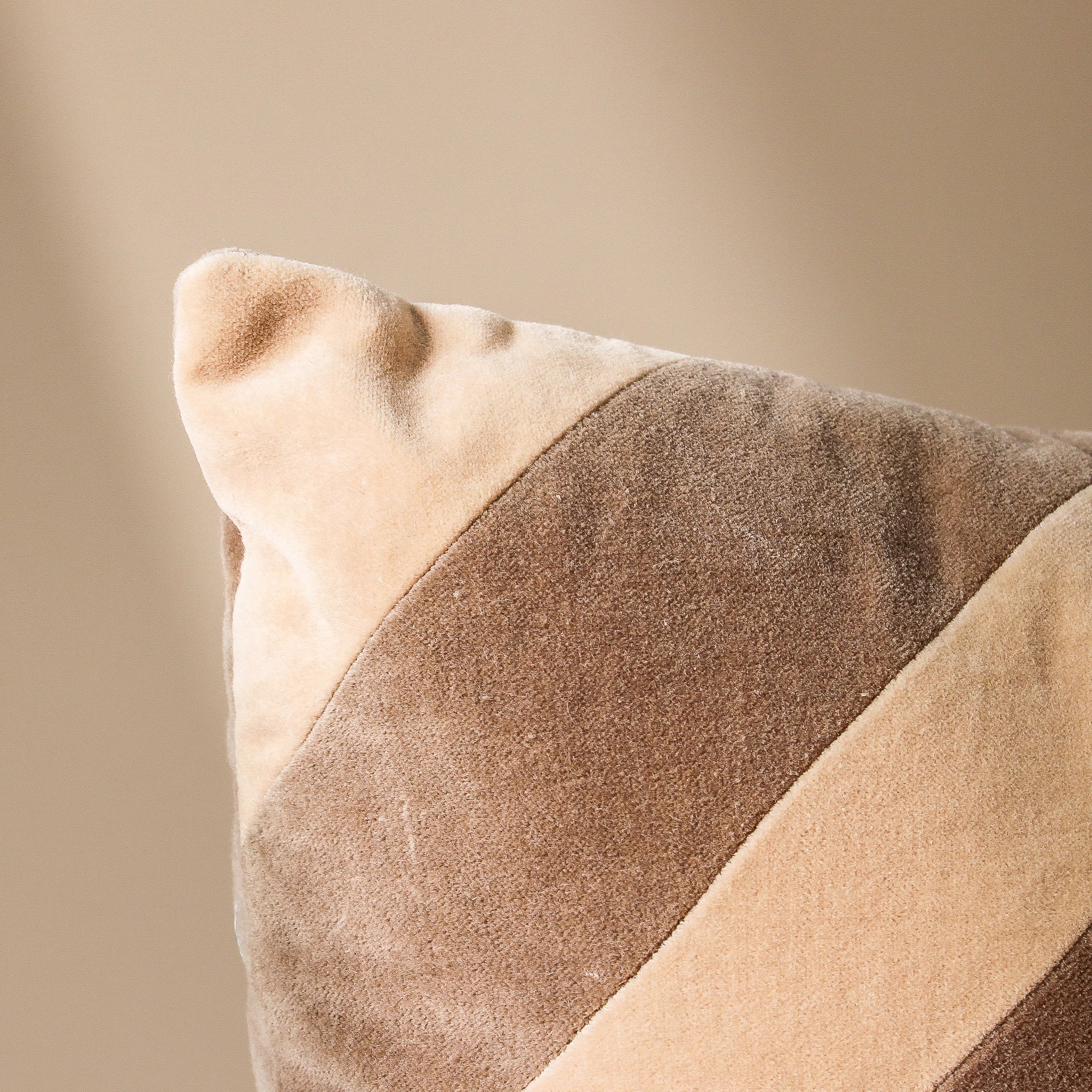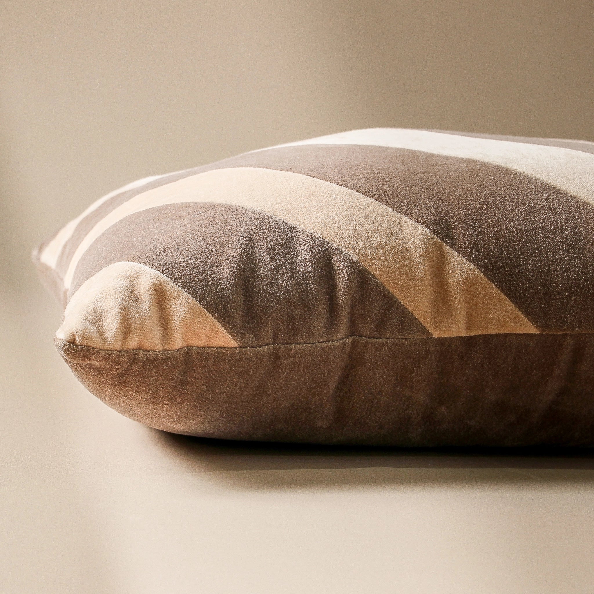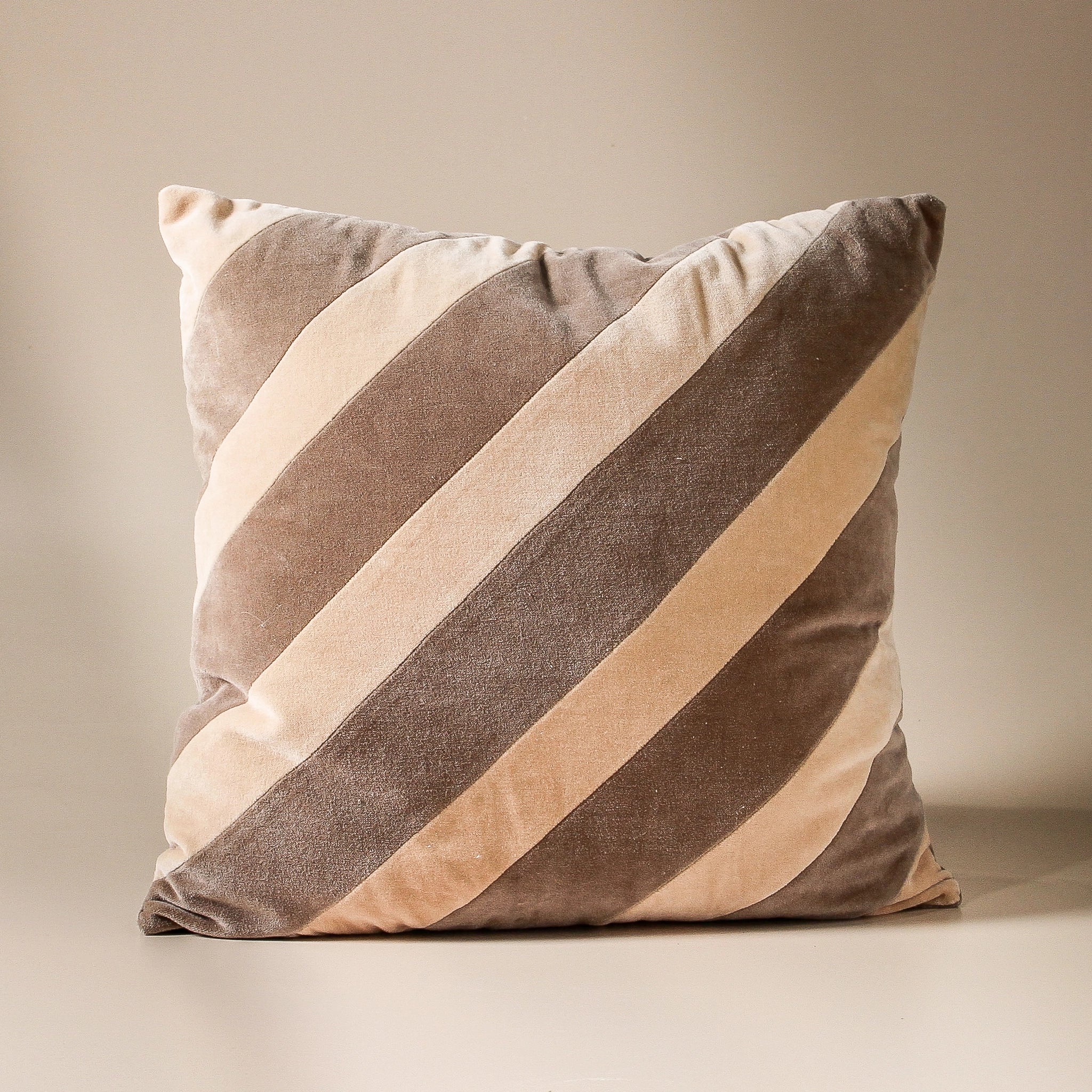 A cotton velvet cushion where mushroom and beige diagonal stripes create movement across the square frame. From Indigo Love's Modern Nostalgia collection, this piece draws from mid-century design codes while speaking to contemporary interiors. The dacron fill provides considered support, while the removable cover acknowledges the practicalities of daily life. Layer against crisp white linen or place atop a weathered leather chair — the contrast between velvet's luxe texture and worn patina creates the tension that makes a room feel collected rather than curated.