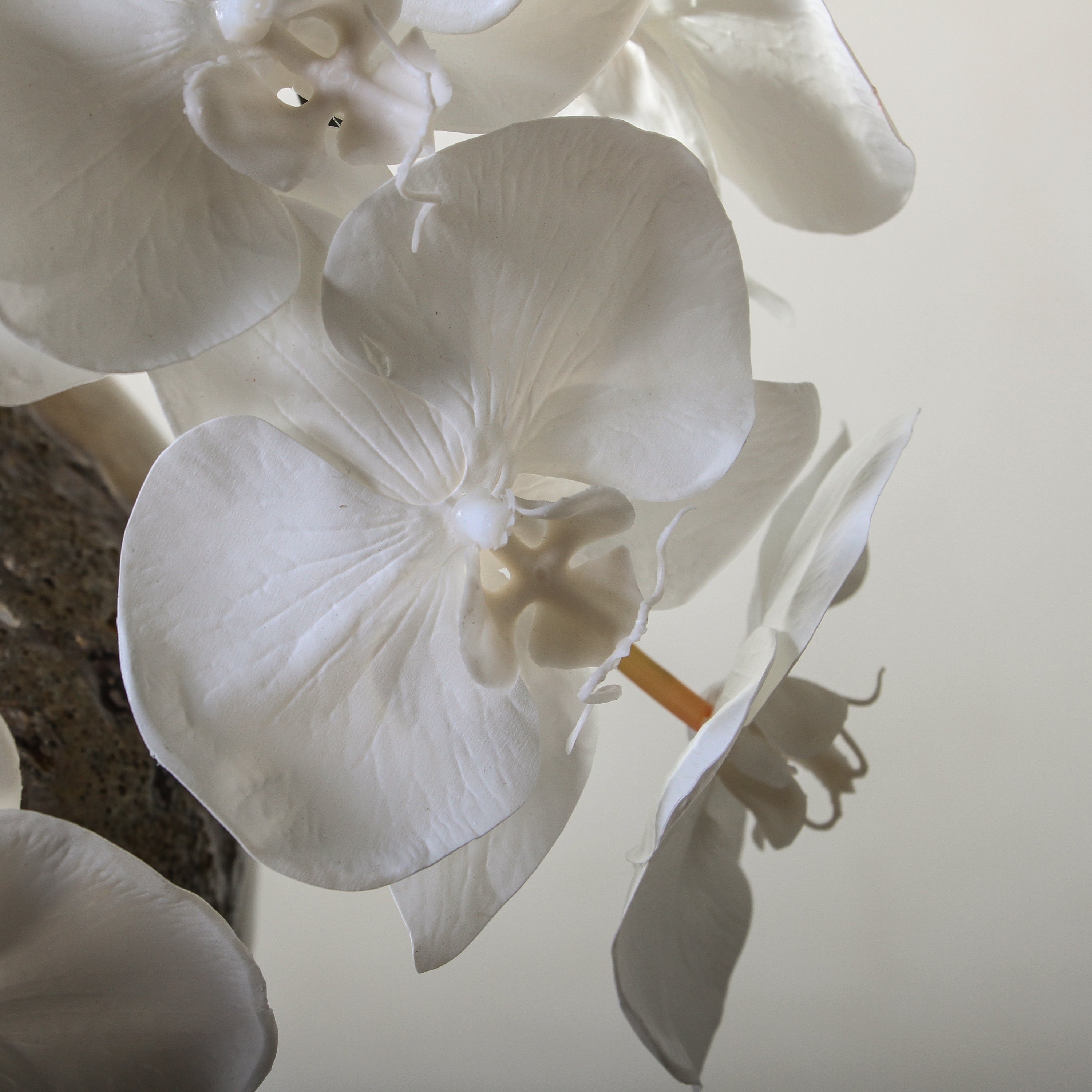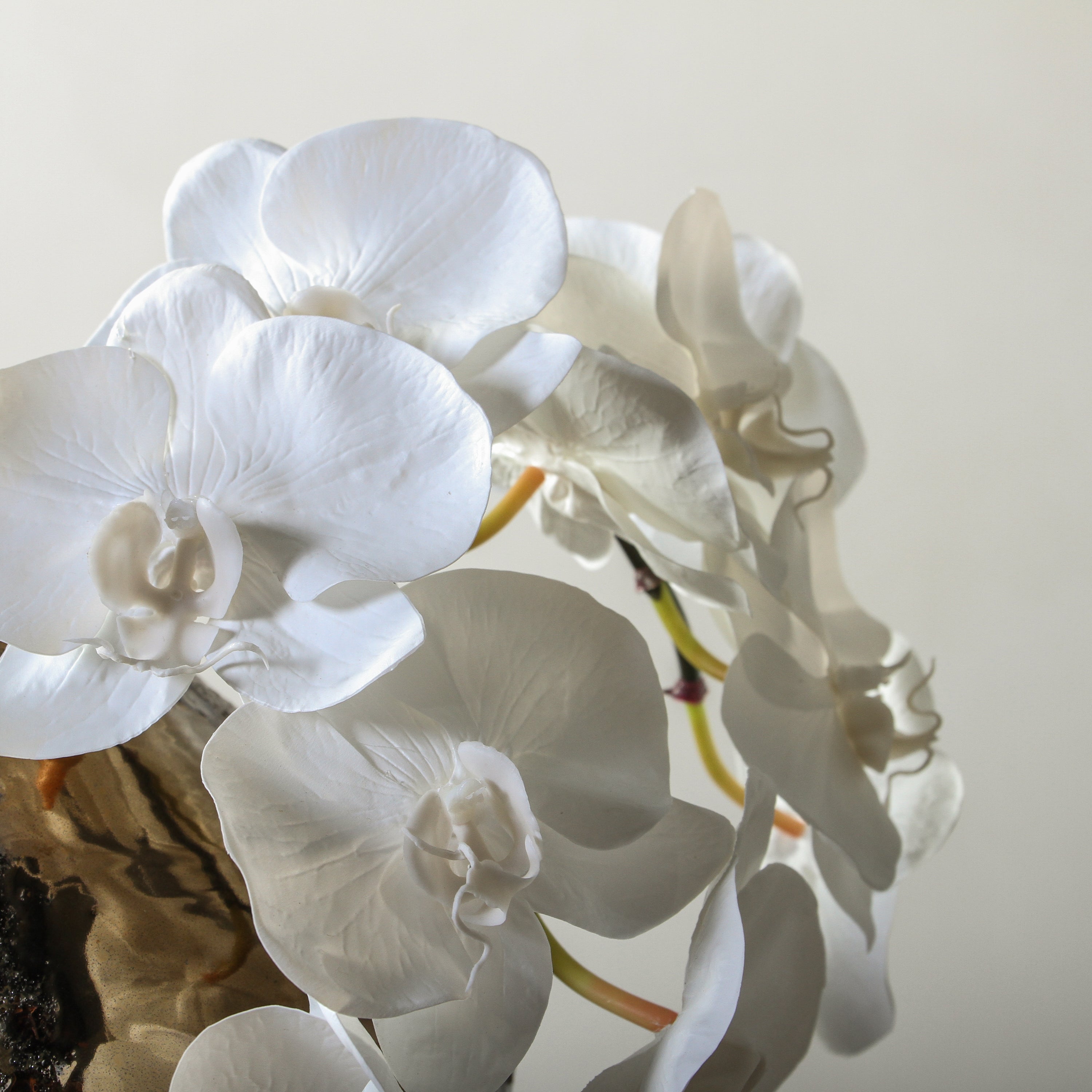 This faux floral arrangement by Flowers on the Mill offers a study in minimalism and form, the Modern Sculpture Arrangement distills floral design to its purest expression. Two sculptural white orchids arc beautifully, their delicate petals and sinuous stems creating a quiet yet impactful presence. With no excess, the focus remains on balance, negative space, and organic movement.