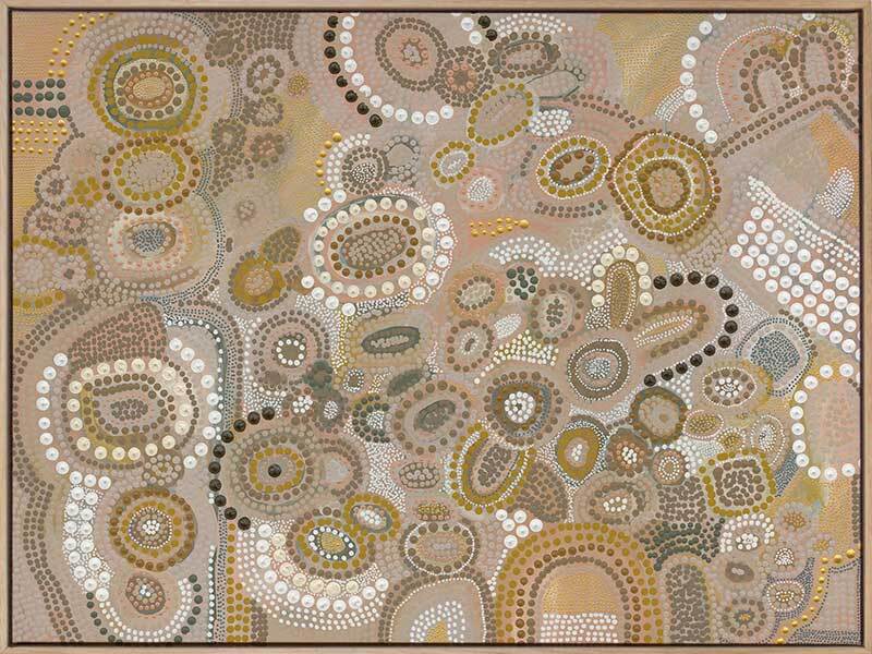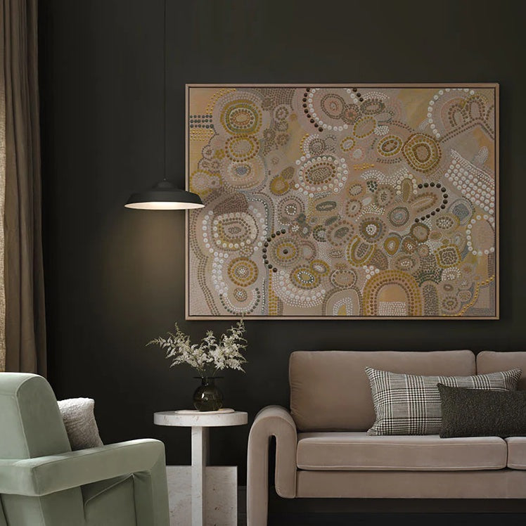 Light, earthy and deeply grounded in rich ancestral culture, this contemporary Indigenous Aboriginal artwork has been created by Wiradjuri artist Amanda Hinkelmann. Featuring clusters of intricately painted concentric circles, surrounding three hill like structures, the piece is representative of the Creation period - where all life came into being. The colour palette features a warm midtone colour palette of mustard, ochre, clay and white. A complimentary piece to Dharrang, Marramarra and Wiraywinhangin Marramarra, as a part of Amanda's visual representation of the Dreaming.