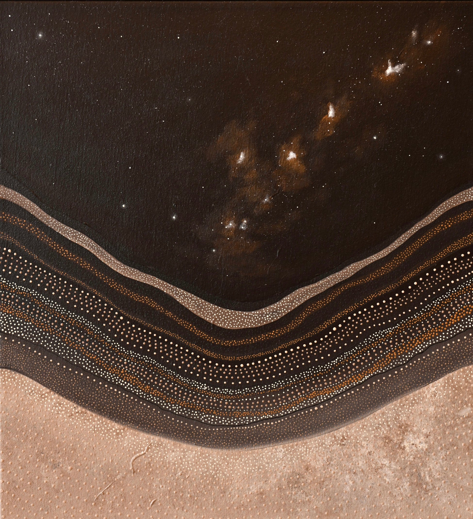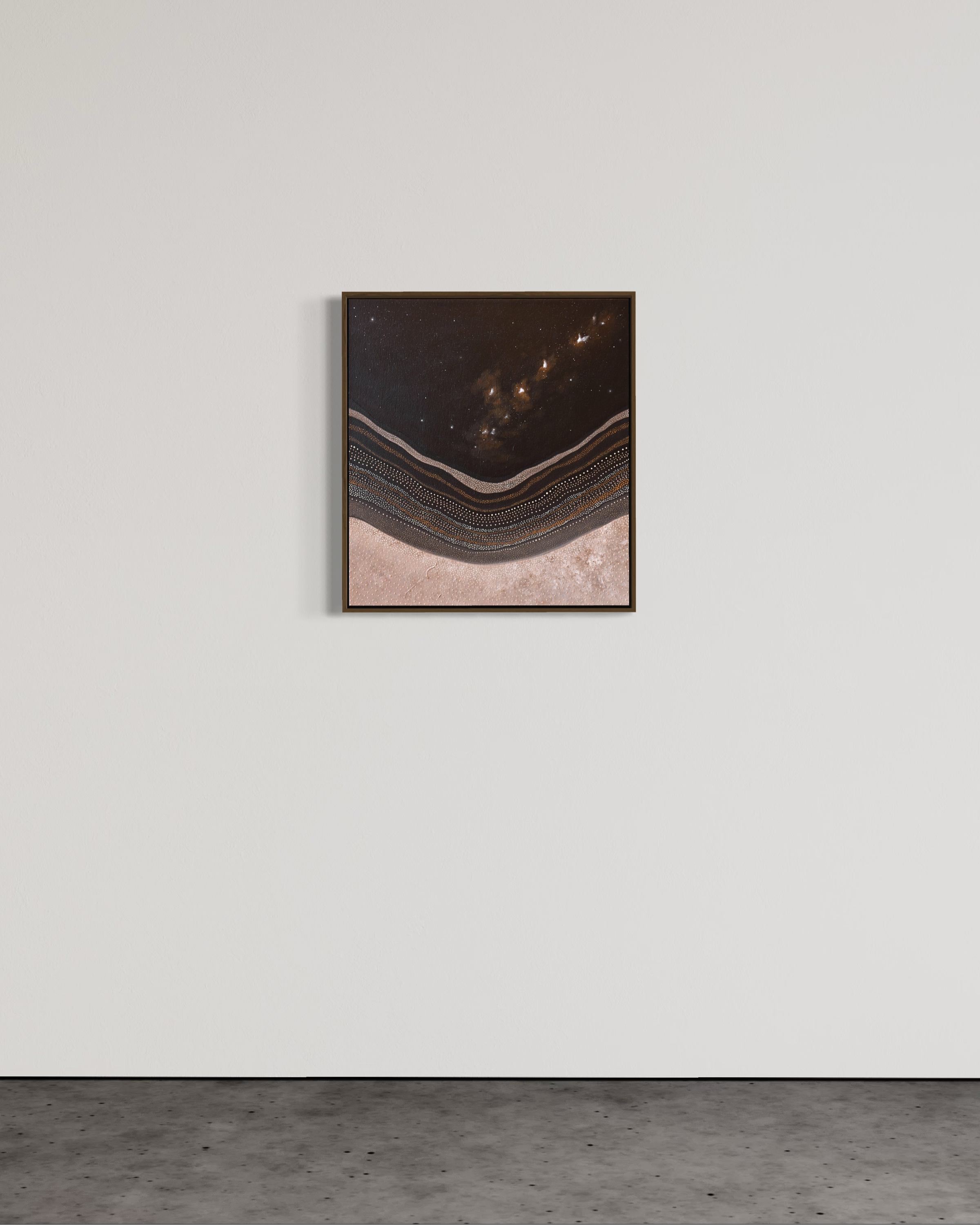 Framed in coyote-stained Australian oak, Night Sky Dreaming holds a sense of warmth and grounding, anchoring the work in material connection while allowing the composition to drift gently into the unknown. It is a quiet offering — a moment of reflection, imagination, and reverence held in night.