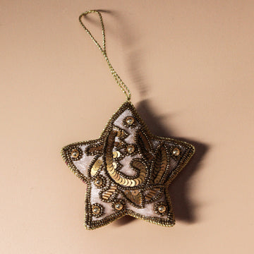 This delicate Nola Star Decoration is handcrafted with a focus on intricate detail, showcasing a soft felt background adorned with golden beads and sequins. Its design brings a sense of nostalgia and renewal, offering a unique touch to your holiday decor. Whether hung on a tree or displayed as part of festive home decor, this decoration adds a layer of warmth and texture to your festive celebrations, making it a memorable addition to your seasonal collection.