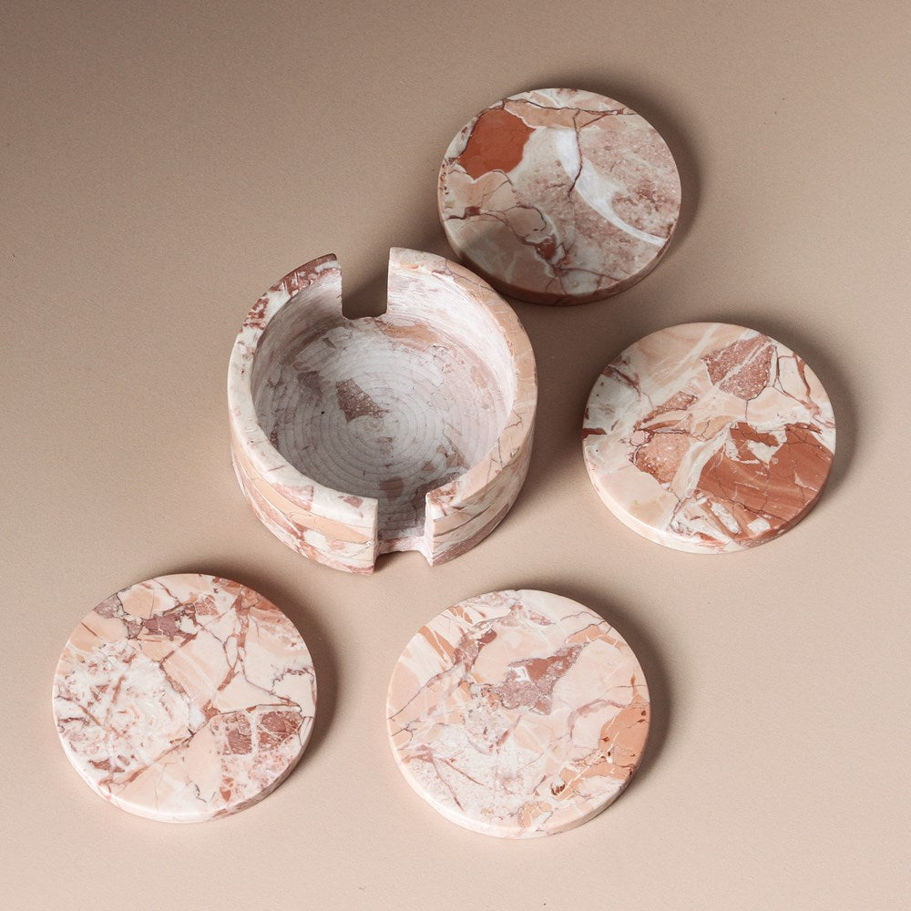 Elevate your table setting with the exquisite Odite Coasters, a set of four round coasters crafted from luxurious marble stone. Each coaster showcases its own unique marble veining, making them truly one-of-a-kind pieces that add a touch of natural beauty to your decor. The Odite Coasters come with a stylish marble stand that acts as a coaster holder for neatly storing these coasters while not in use. Choose from four captivating materials, including pink lagoon, grey lagoon, onyx travertine, and multi travertine. Each option showcases its own distinctive charm, providing you with a range of choices to match your personal style and complement your dining space. Whether used during everyday meals, special occasions, or entertaining guests, these coasters add a touch of elegance and sophistication to any setting.
