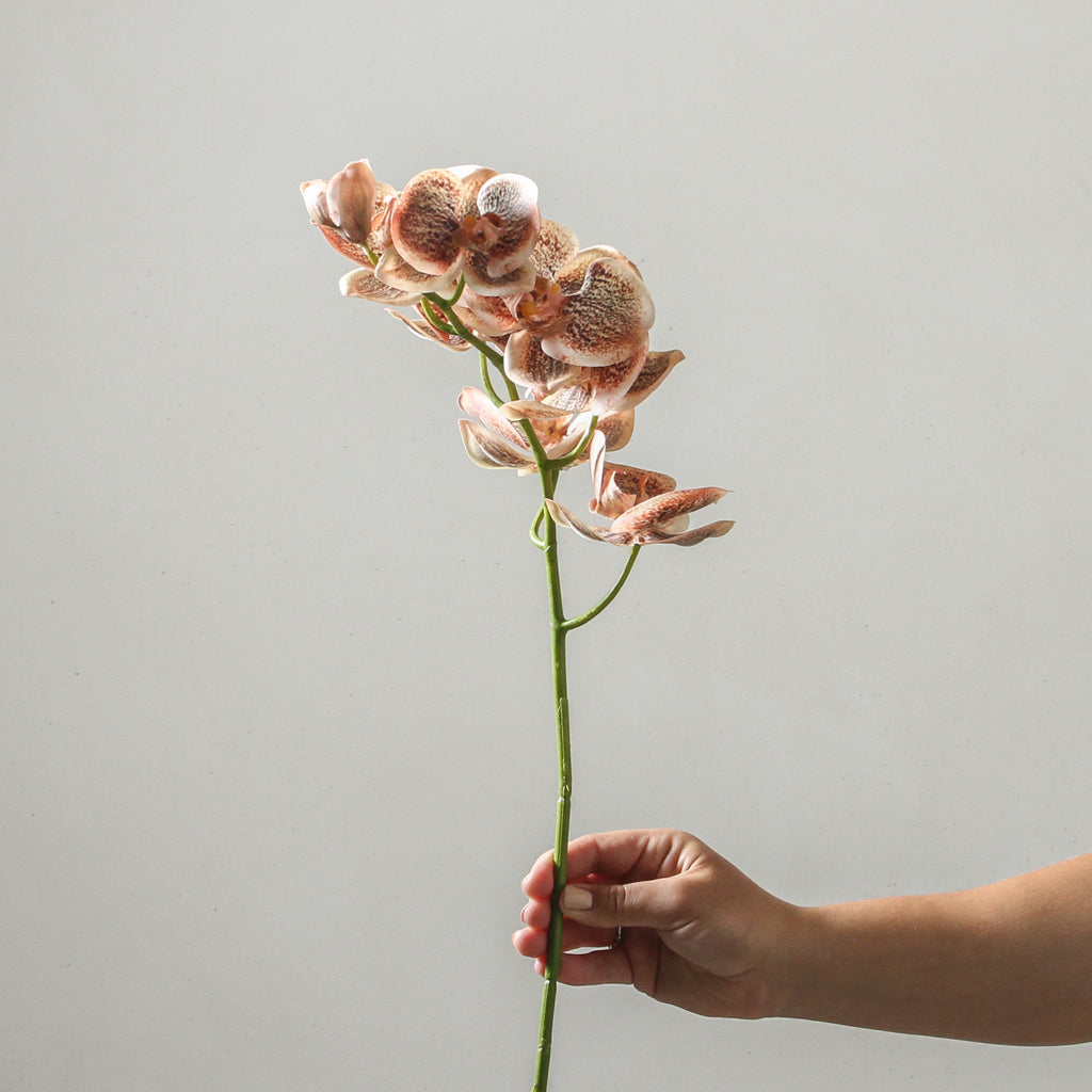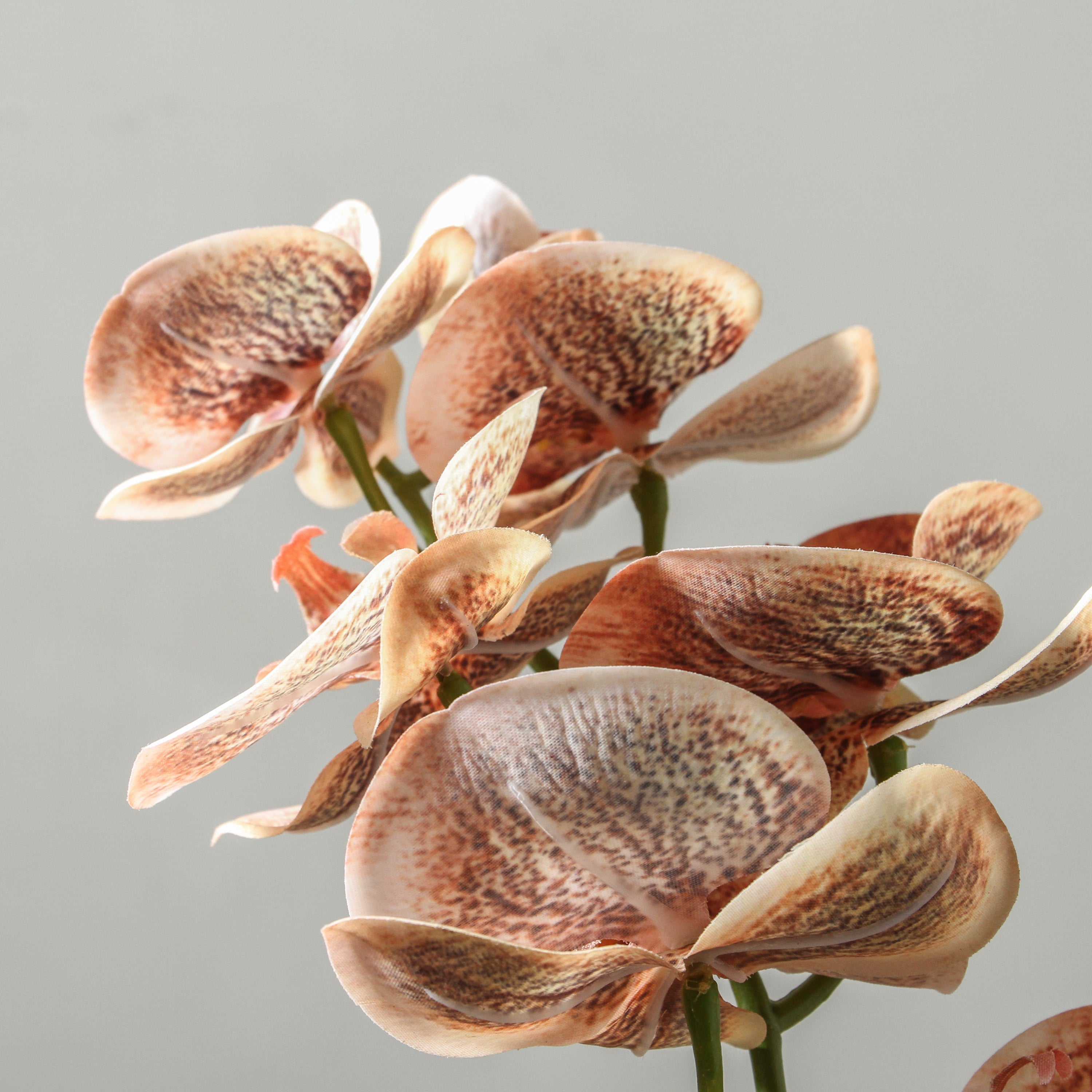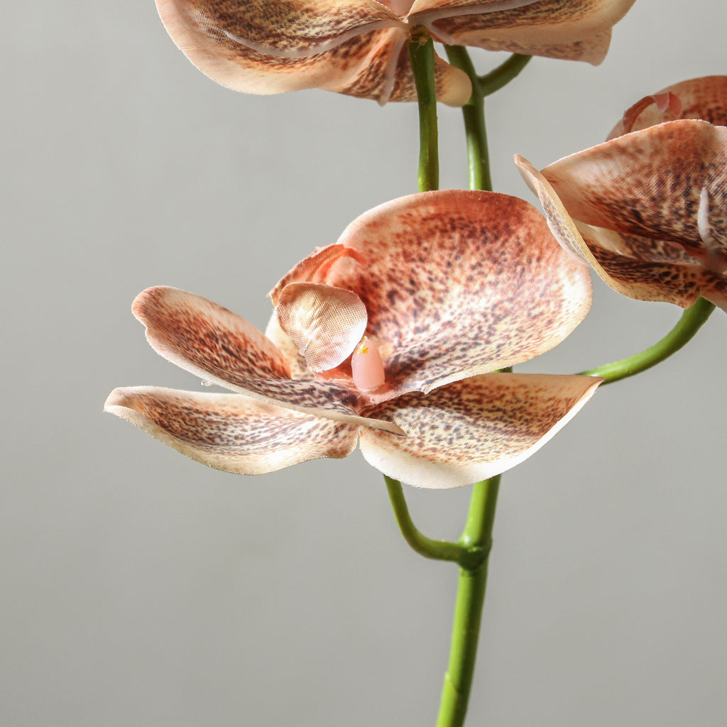 Embodying classic beauty with its warm toffee-toned petals, the Orchid Phalaenopsis Spray in Toffee captures the graceful arch and soft texture of real Orchid blooms. Each petal is showcasing a beautiful gradient that shifts from deep caramel to softer amber, creating a rich, layered effect.