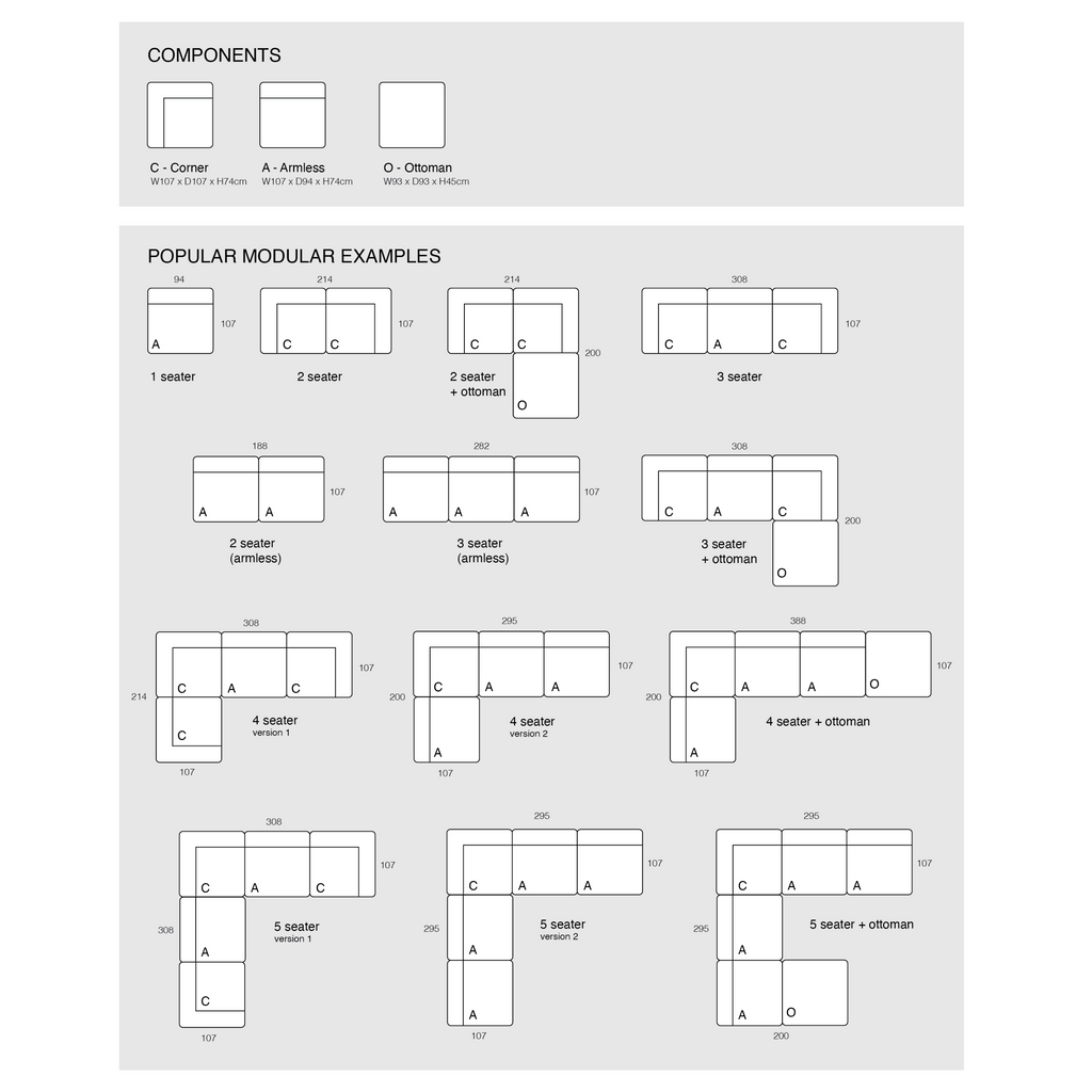 Dimensions: Wedge - W107 x D107 x H74cm, Armless - W107 x D94 x H74cm, Ottoman - W93 x D93 x H45cm