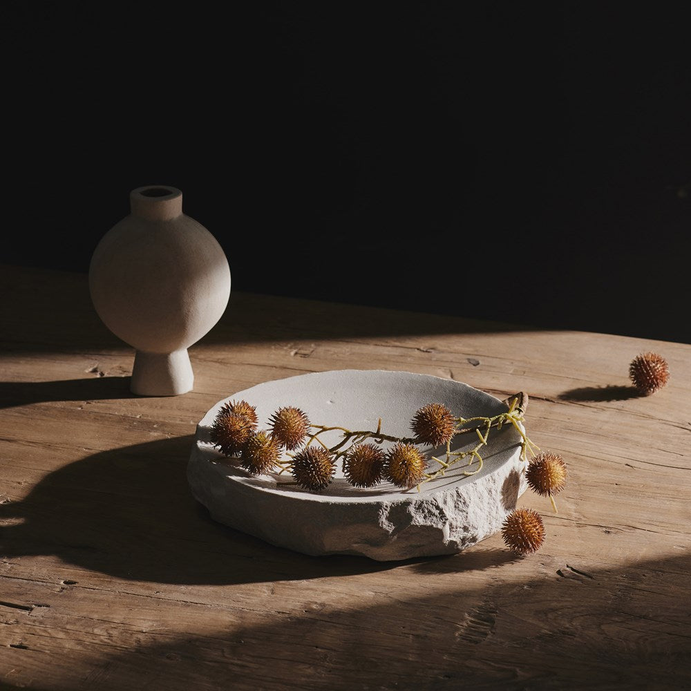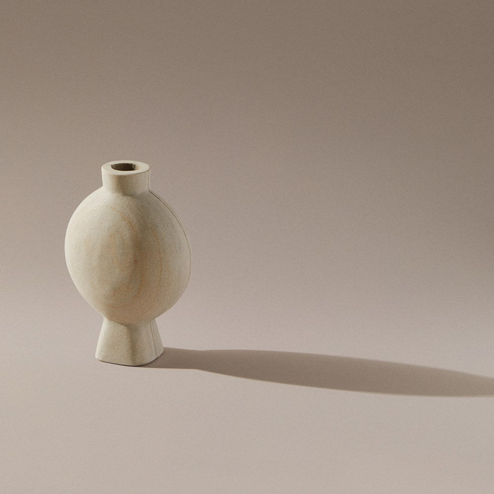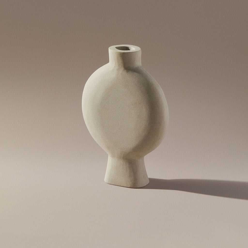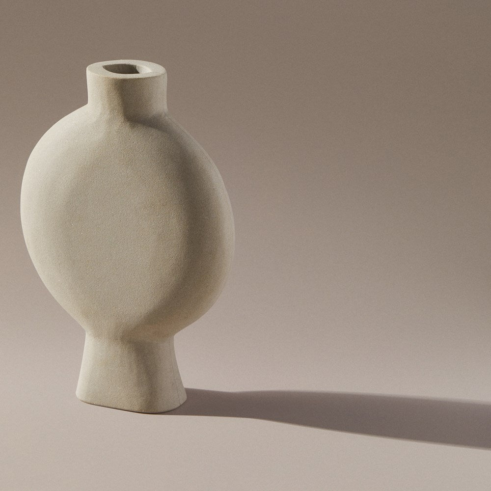A combination of earthy finishes and an interesting design makes the Ray Sandstone Vase a firm favourite. This small vase is the perfect decor accent, with a striking curved shape and soft sandstone texture. Handcrafted from mint sandstone marble, we like to style our vases with a single stem or a small plume of dried billy buttons to contrast its curved form. Pair it with the Ray Sandstone Vase - Large as a set.