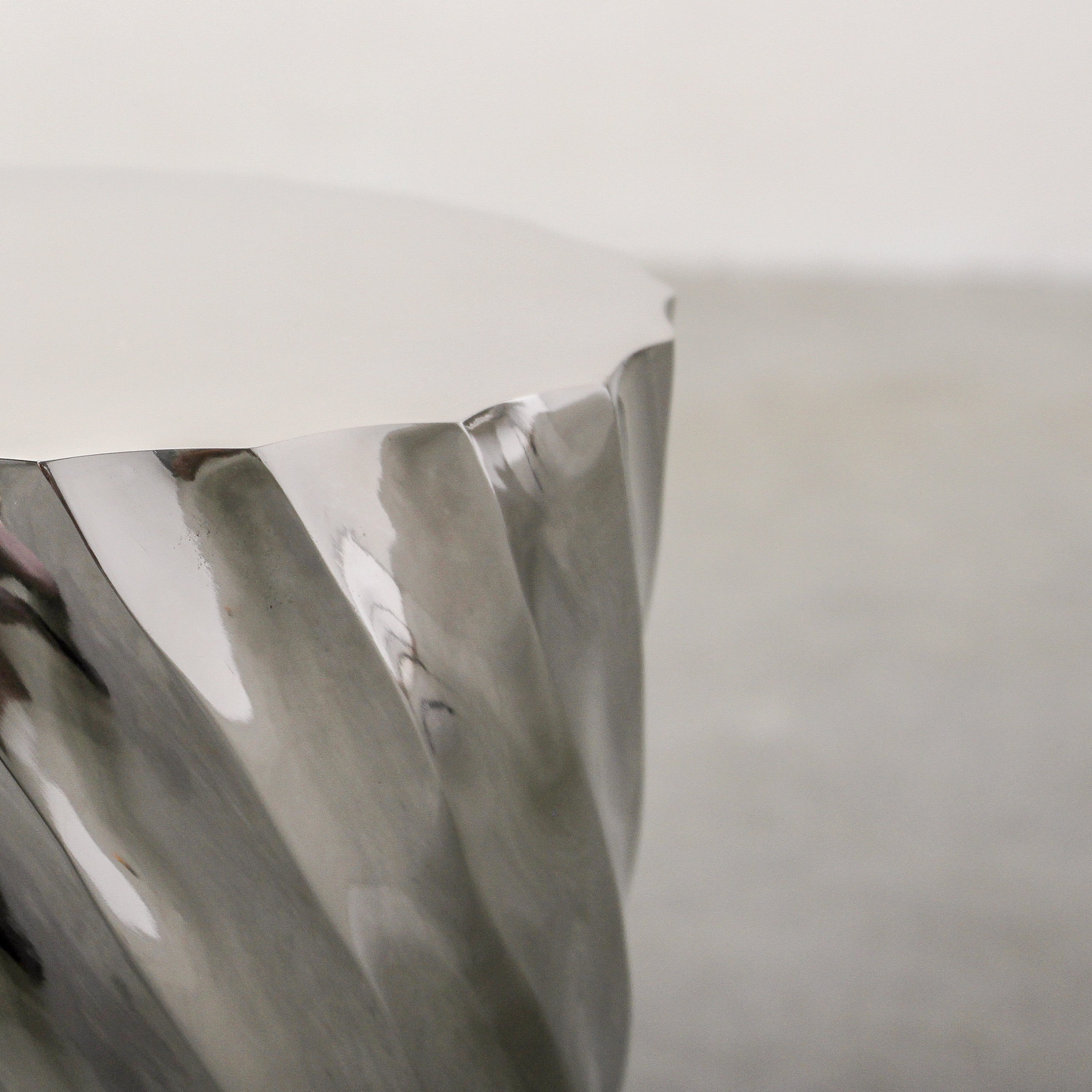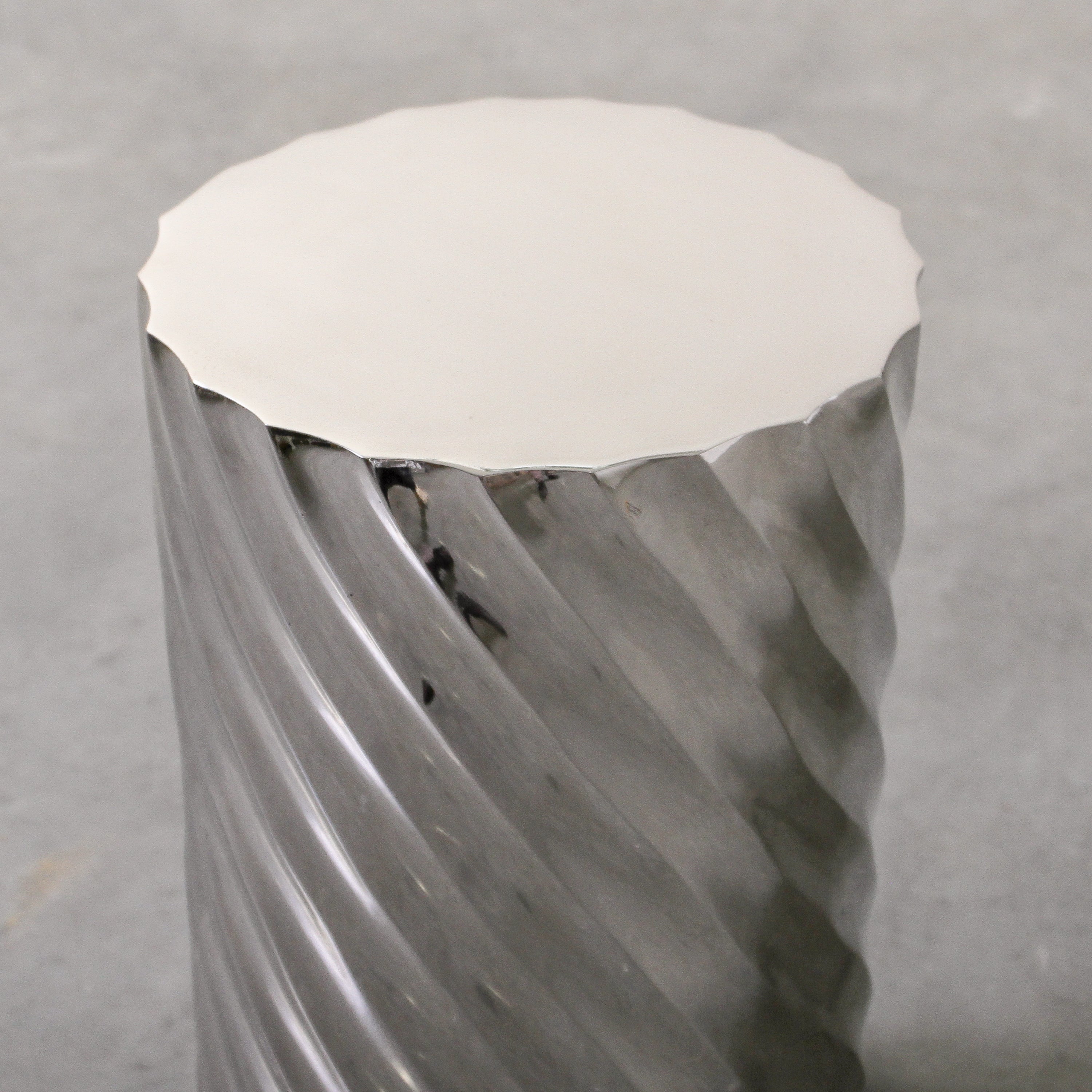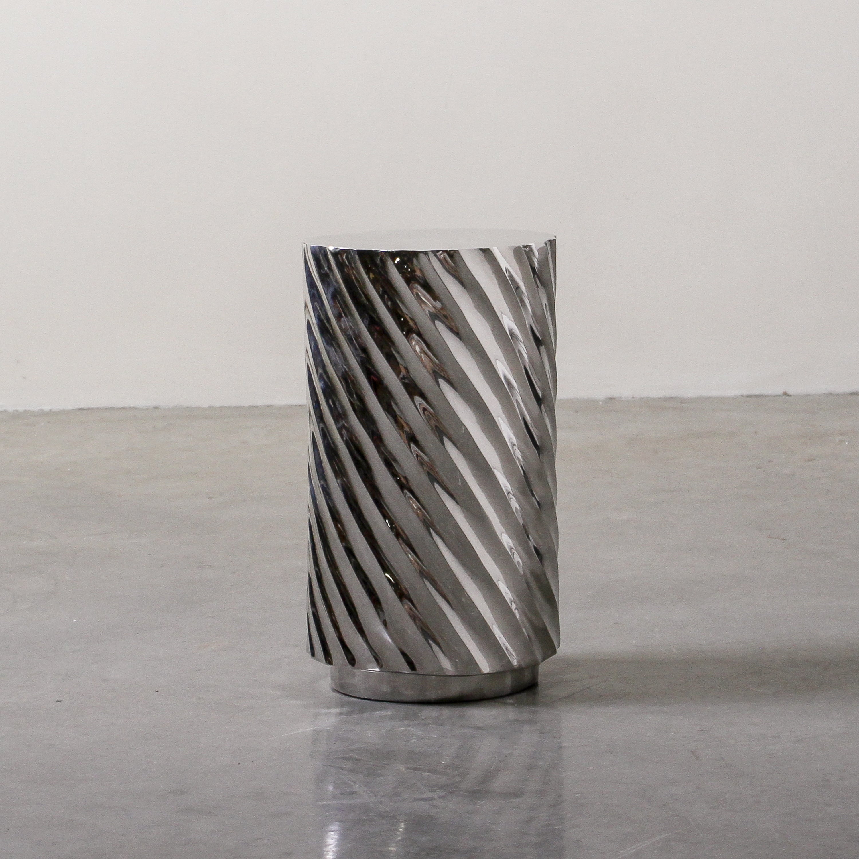 The Seraphine Stool brings movement to a room. Its angled, reeded detailing spirals around a polished nickel surface, catching the light like water in motion. Slightly hammered in texture, it feels handmade and tactile - refined, but with a human touch.