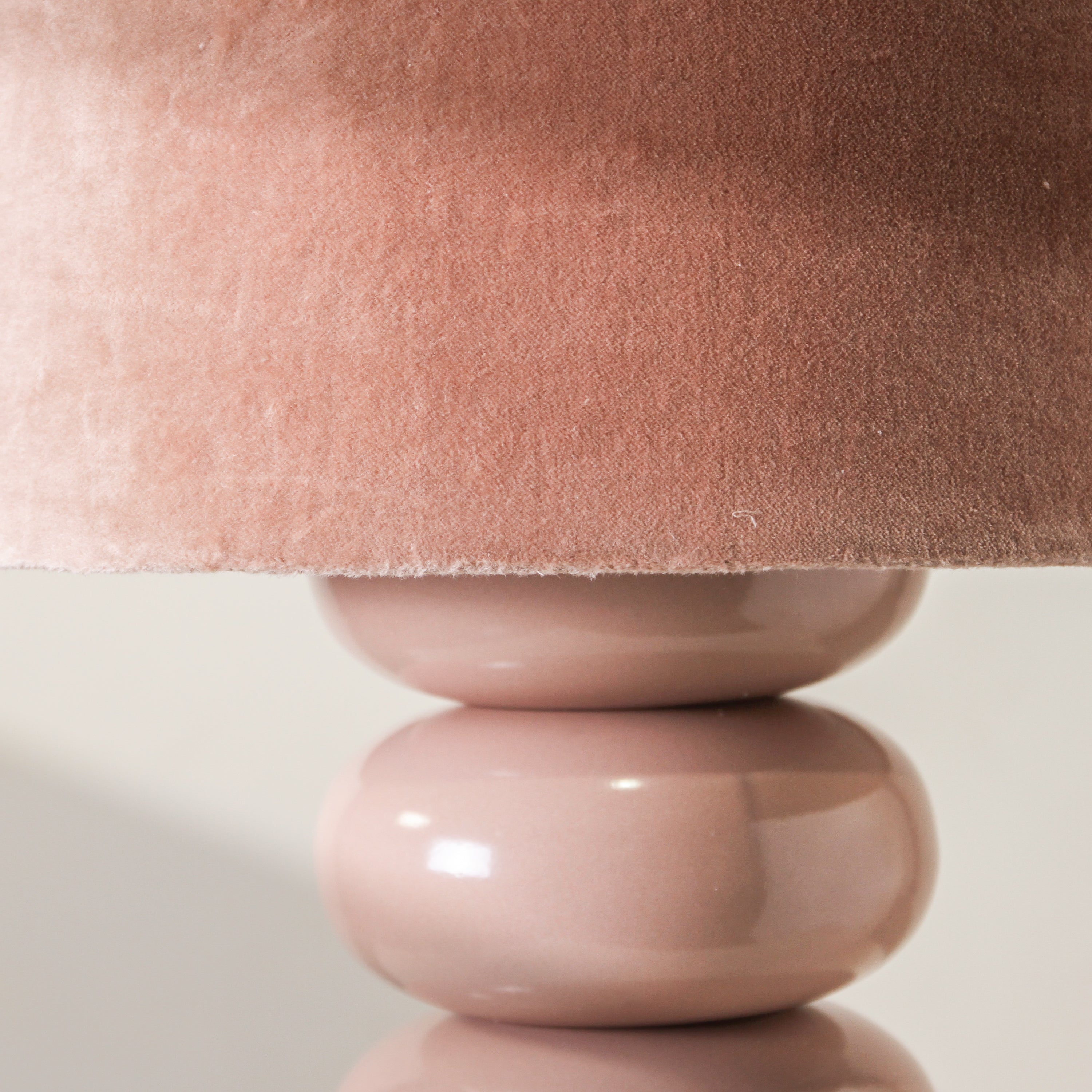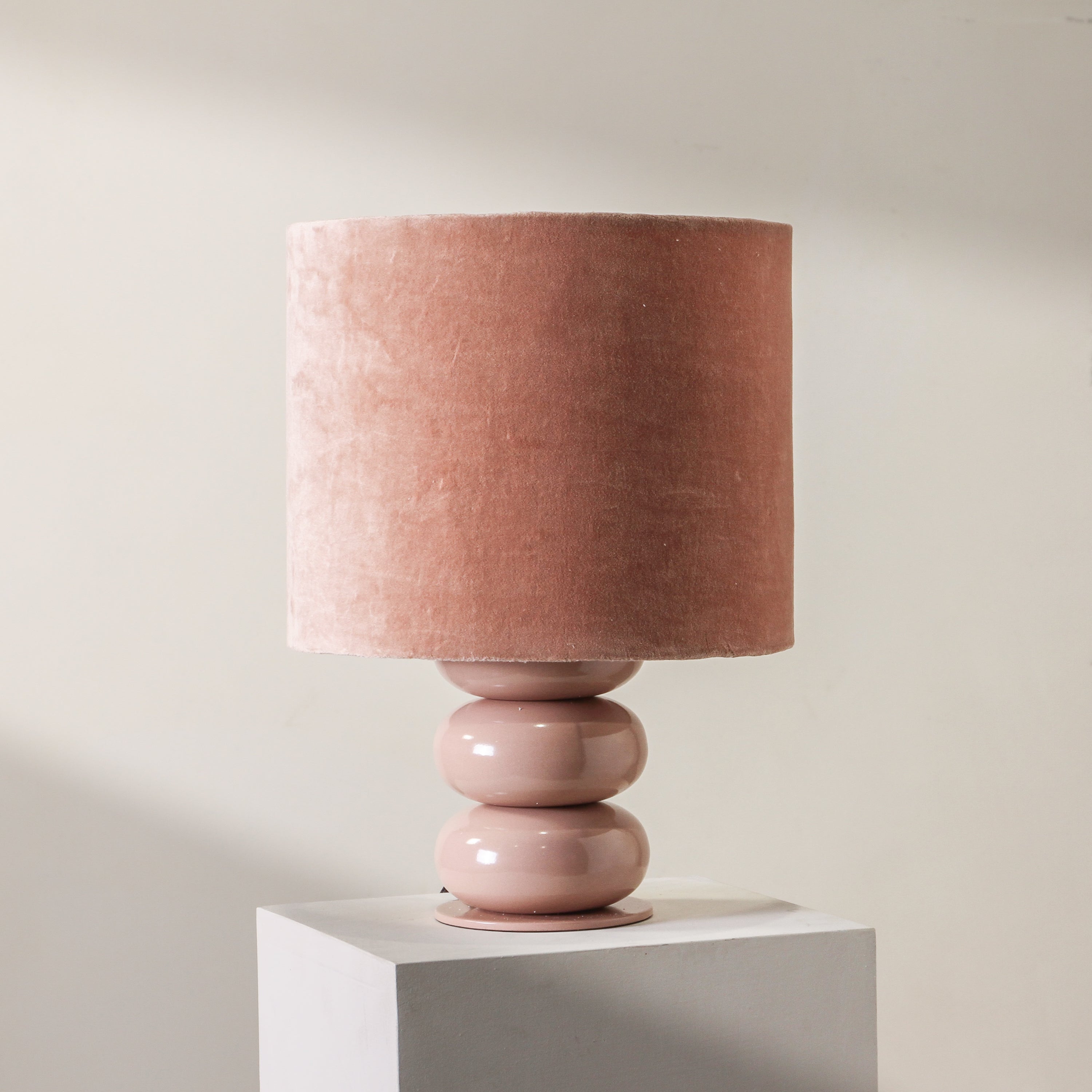 The Spire Table Lamp brings verticality and playful symmetry to the Tender Forms collection. Its base is composed of stacked, rounded glossy forms—each slightly exaggerated in scale—rising in a totemic column finished in soft Rose Dust. The shade, a simple velvet cylinder in tonal blush hues, adds a layer of quiet softness. Gloss and matte textures interplay across the piece, creating depth through contrast. Designed as both light source and sculptural object, Spire introduces vertical rhythm and warmth to side tables, consoles, or bedroom settings.