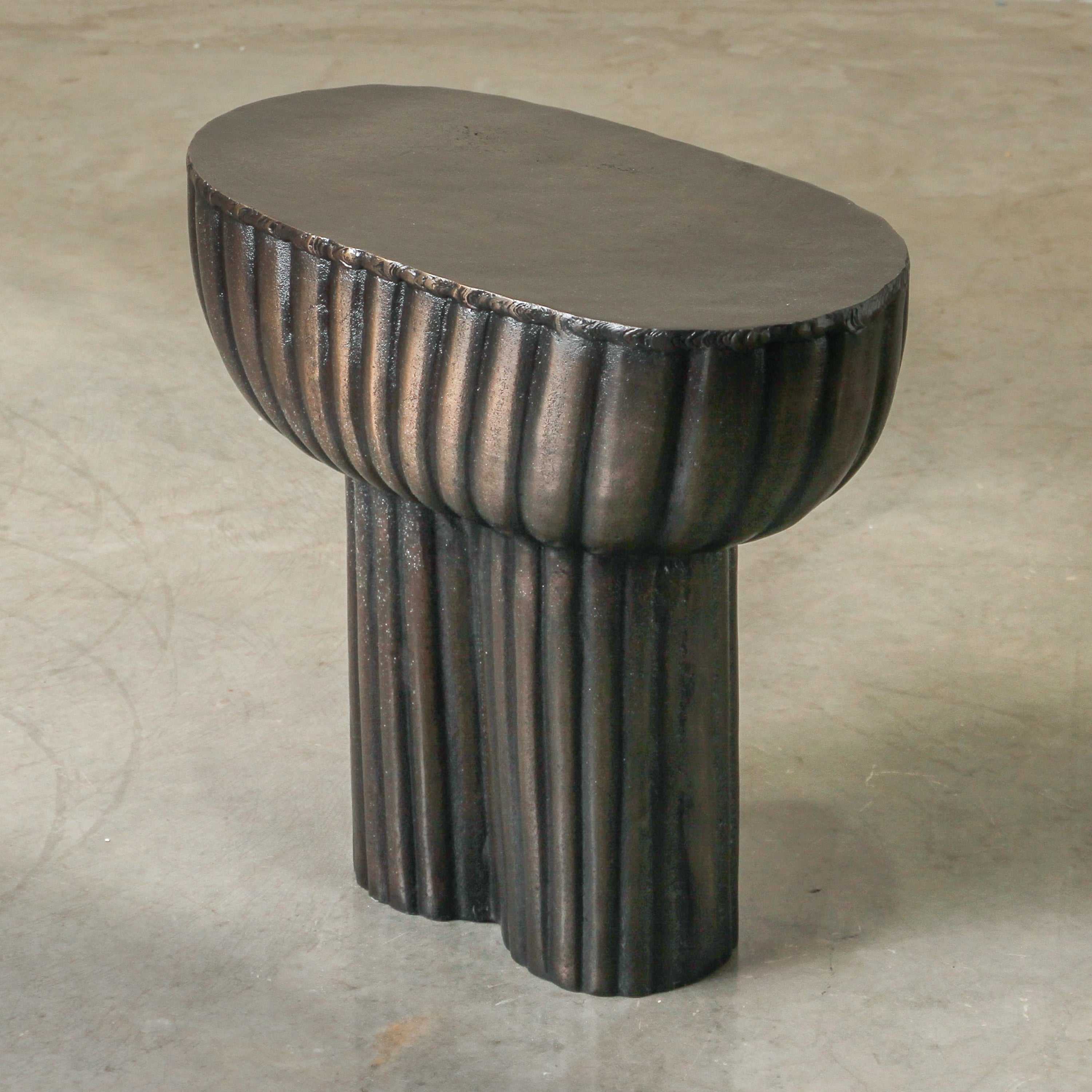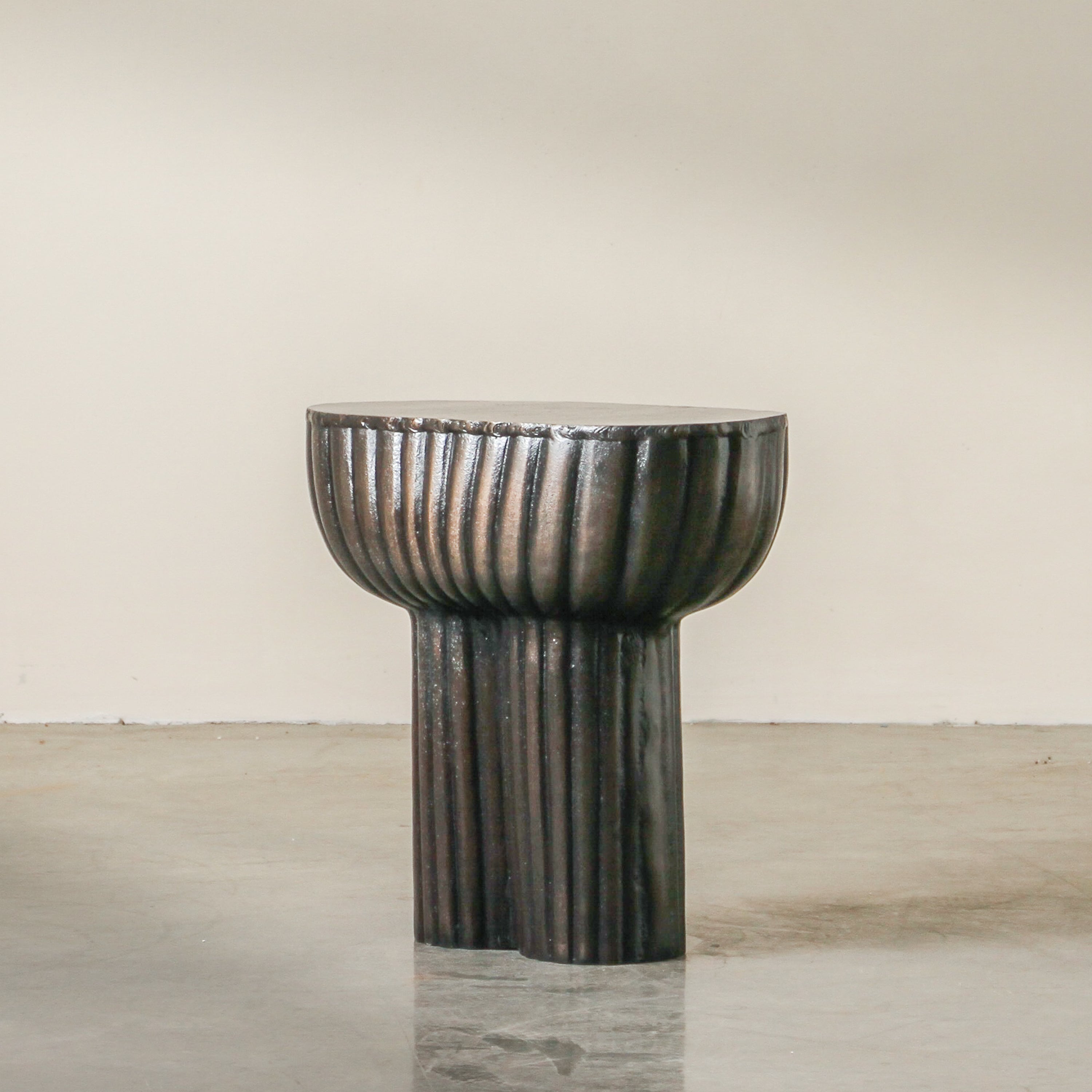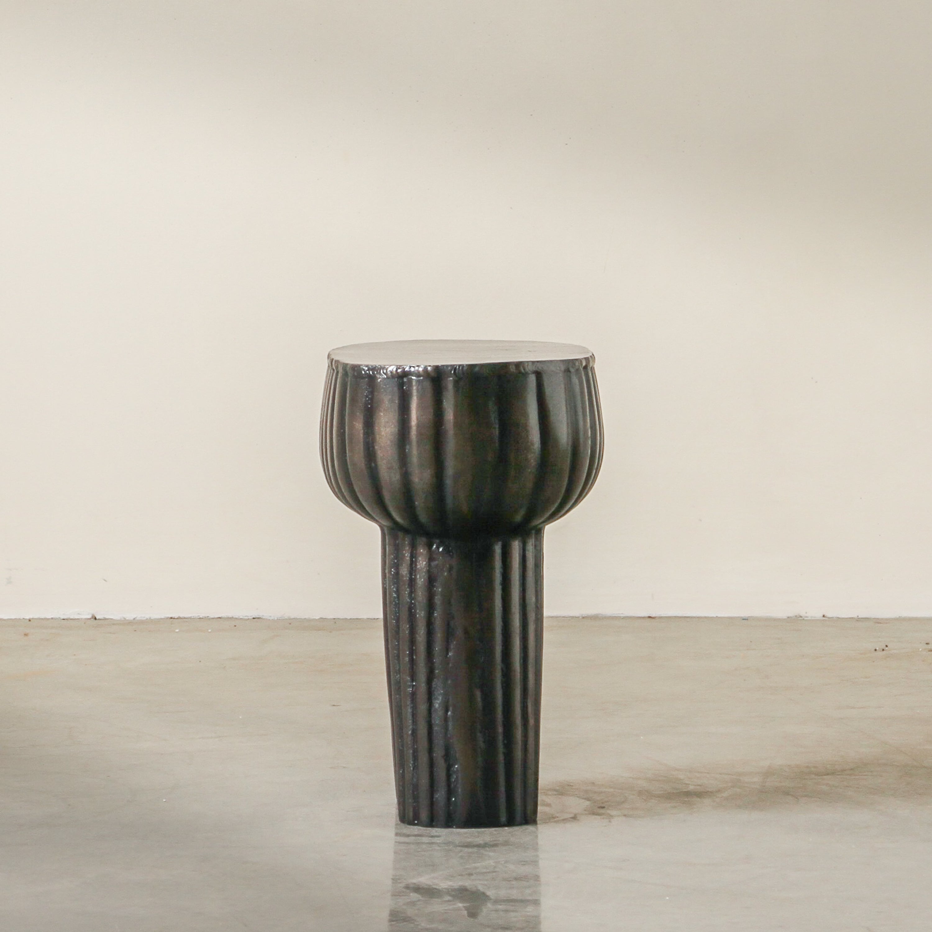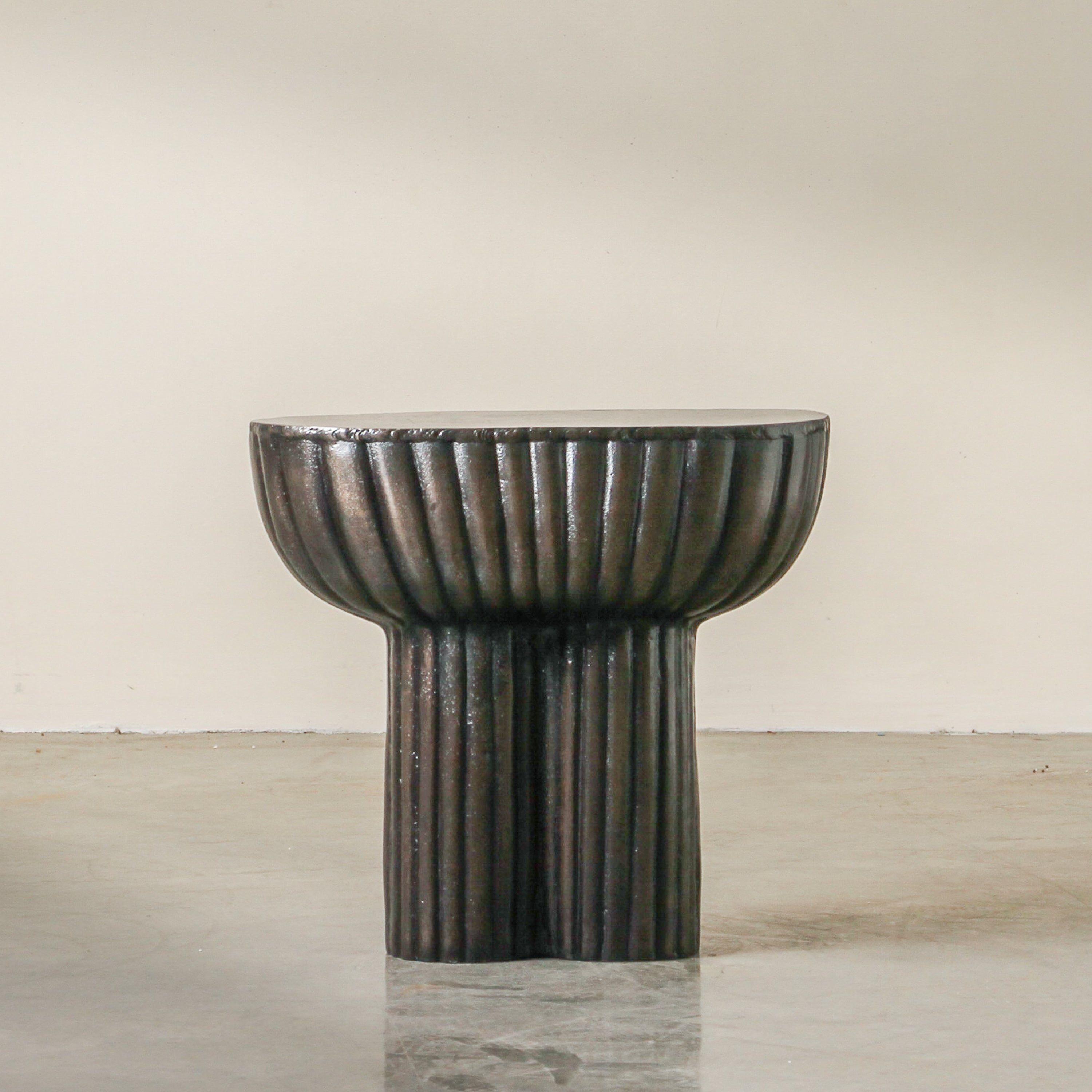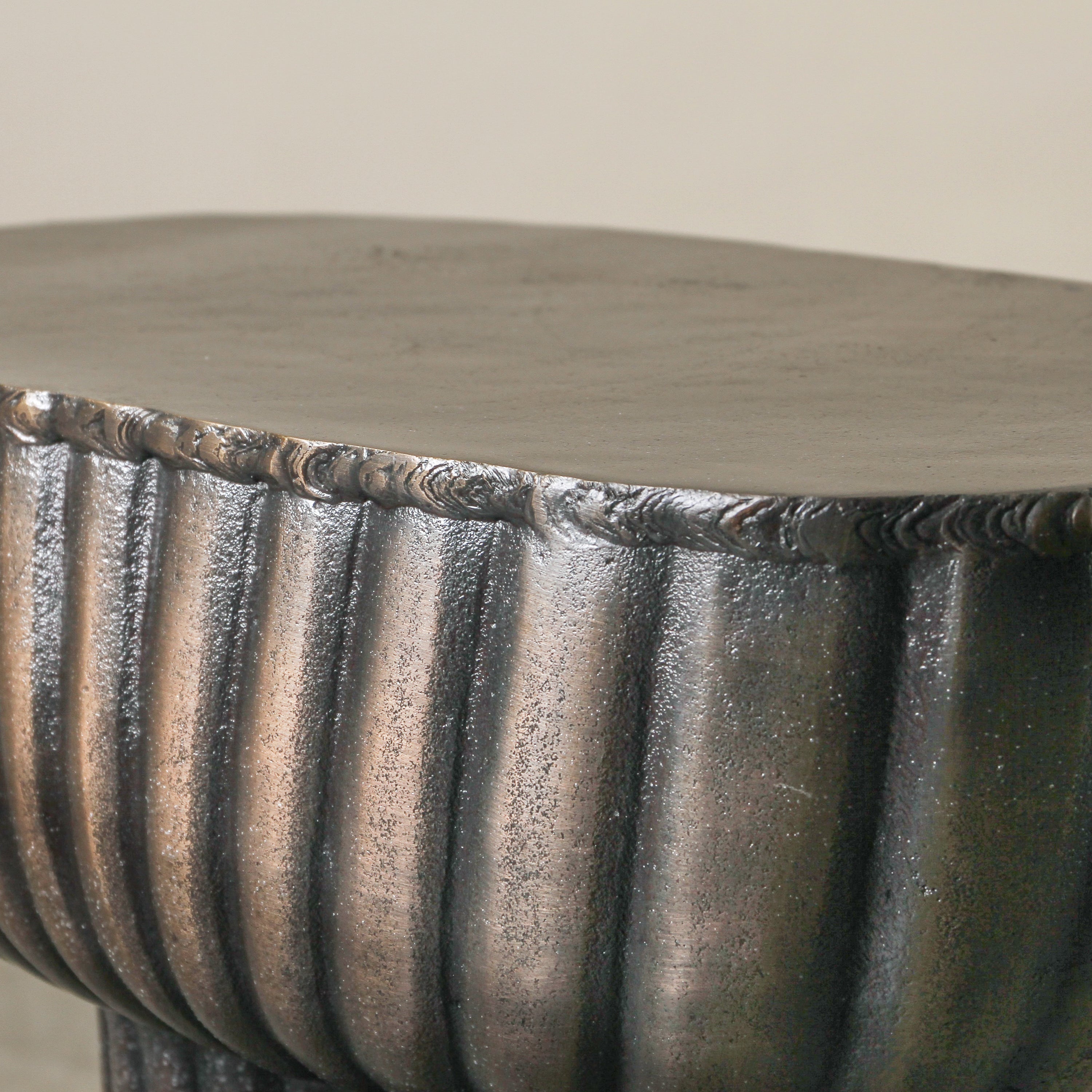 The Stellar Side Table feels as though it has been carved from something elemental. Inspired by an organic form or ancient vessel, its reeded sides create soft rhythm and movement, while the wider top offers generous styling space. The aged blackish copper finish adds warmth and history.