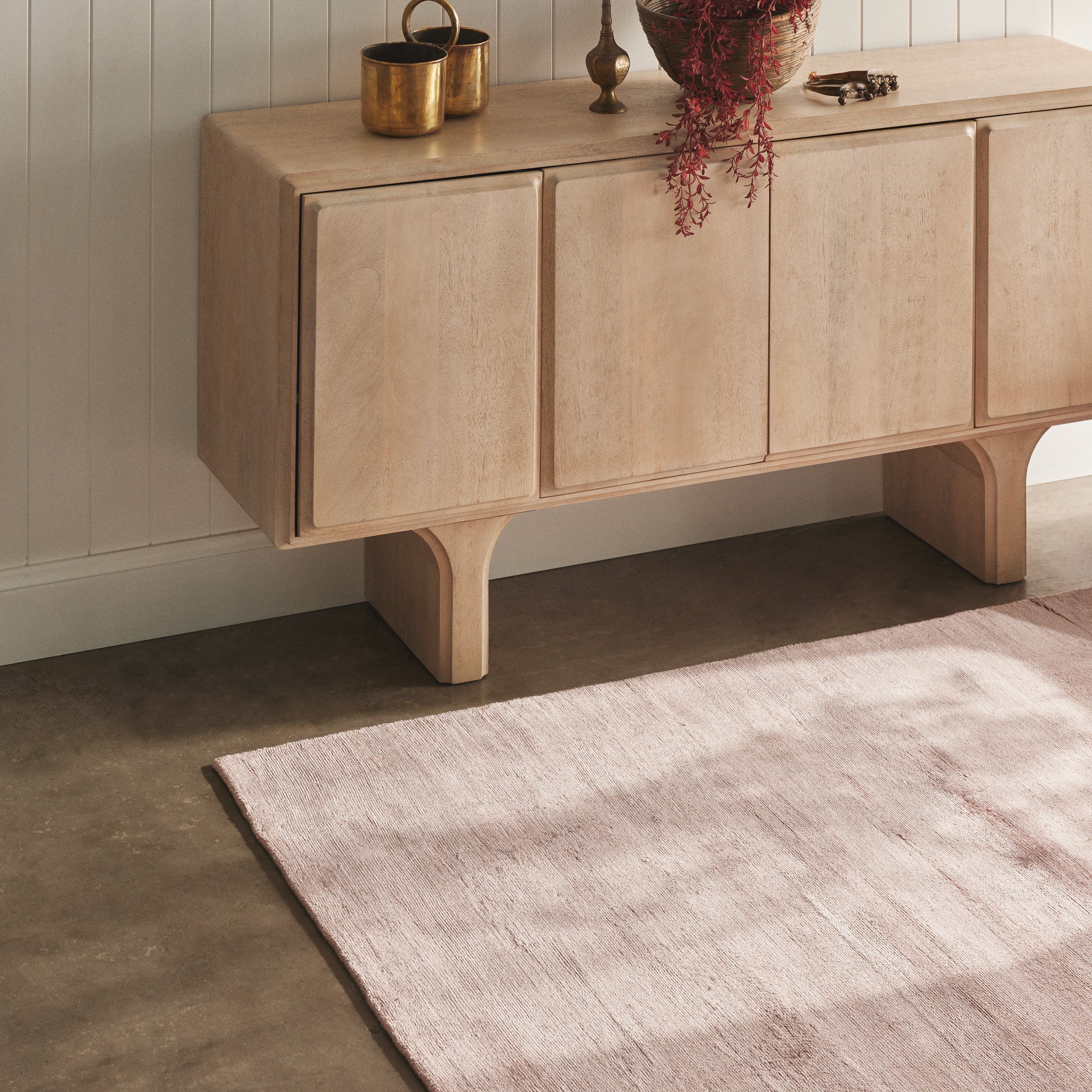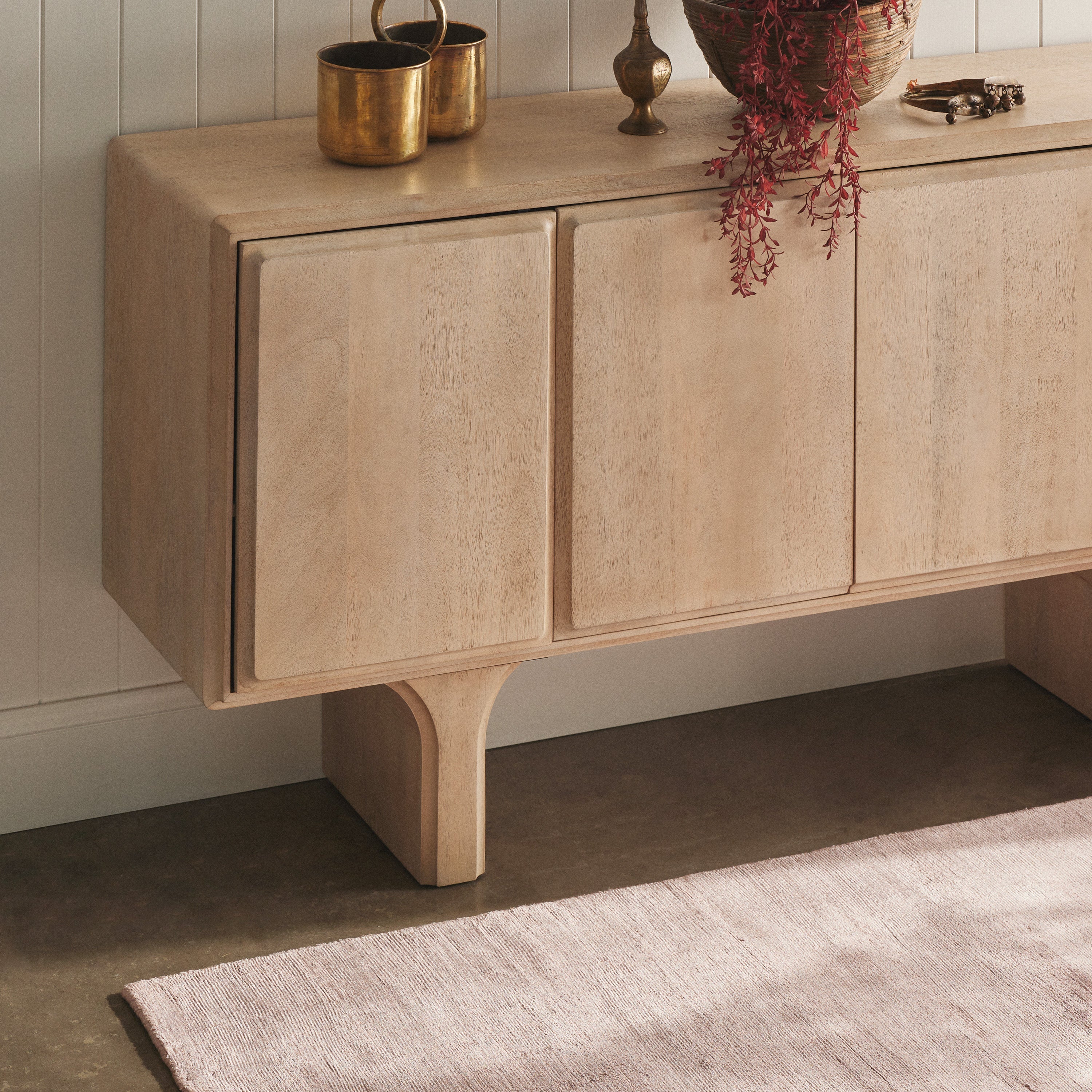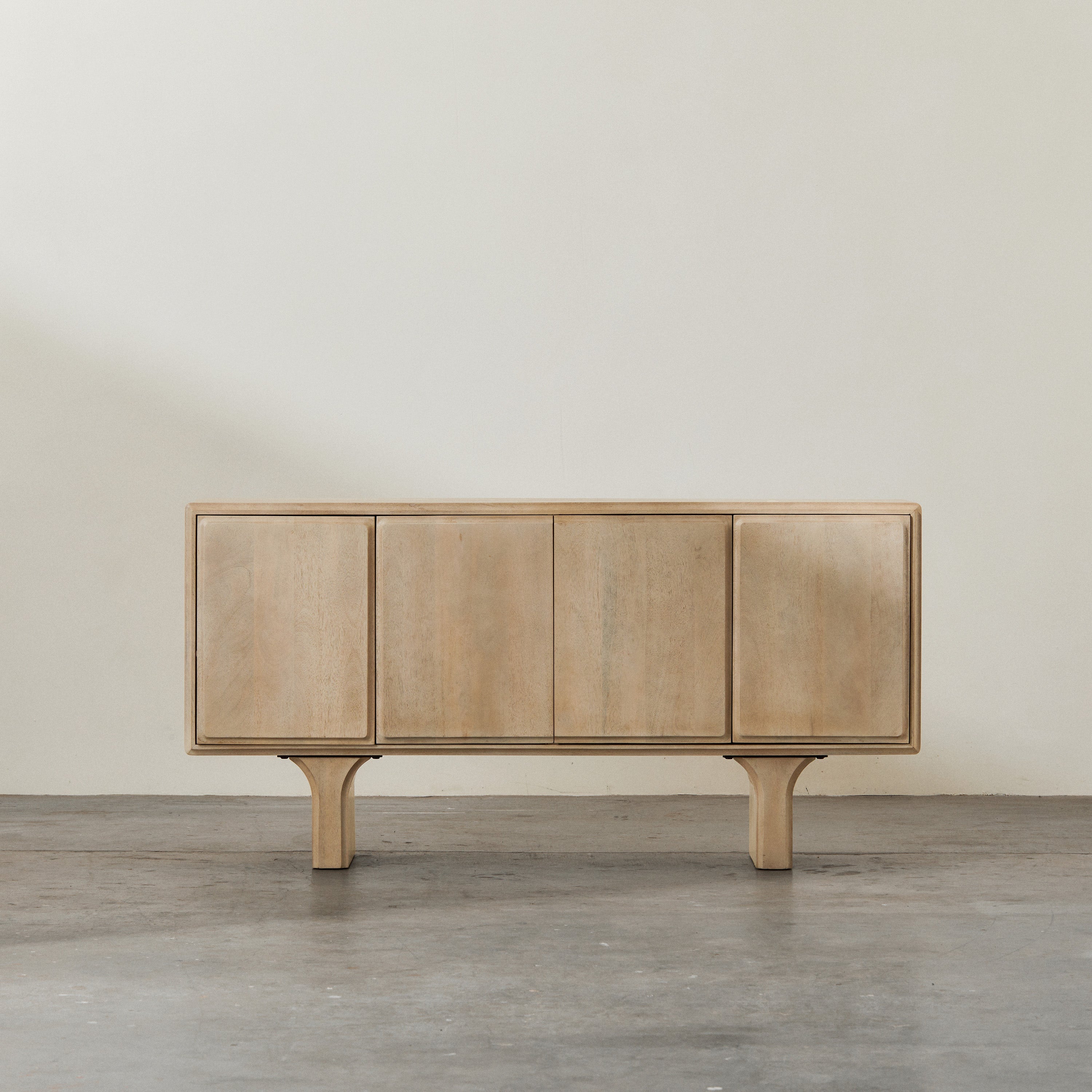 The Strand Sideboard is the perfect console for almost every home. Constructed from premium mango wood, this sideboard is given a white wash finish that exudes a feeling of relaxed elegance. With its minimal design and simple block legs, it's proportions bring a balanced and sophisticated style to any space. The sideboard offers four doors of concealed storage space and has a spacious table top for displaying art, lamps, decor and more.